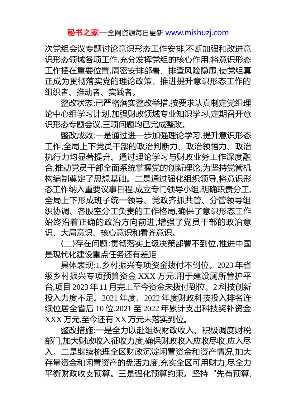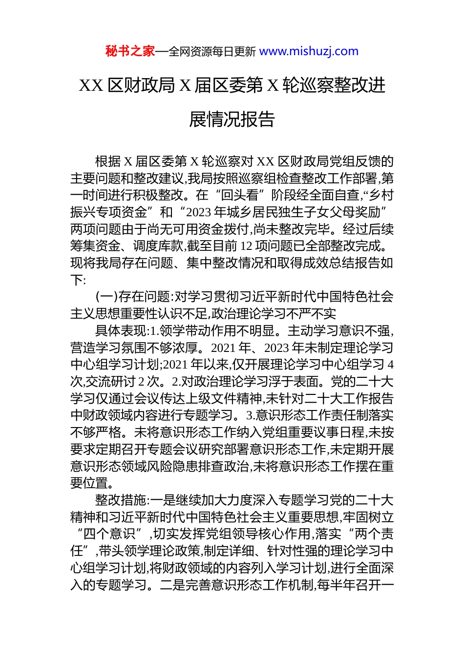 秘书之家—全网资源每日更新 www.mishuzj.comXX 区财政局 X 届区委第 X 轮巡察整改进展情况报告根据 X 届区委第 X 轮巡察对 XX 区财政局党组反馈的主要问题和整改建议,我局按照巡察组检查整改工作部署,第一时间进行积极整改。在“回头看”阶段经全面自查,“乡村振兴专项资金”和“2023 年城乡居民独生子女父母奖励”两项问题由于尚无可用资金拨付,尚未整改完毕。经过后续筹集资金、调度库款,截至目前 12 项问题已全部整改完成。现将我局存在问题、集中整改情况和取得成效总结报告如下:(一)存在问题:对学习贯彻习近平新时代中国特色社会主义思想重要性认识不足,政治理论学习不严不实具体表现:1.领学带动作用不明显。主动学习意识不强,营造学习氛围不够浓厚。2021 年、2023 年未制定理论学习中心组学习计划;2021 年以来,仅开展理论学习中心组学习 4次,交流研讨 2 次。2.对政治理论学习浮于表面。党的二十大学习仅通过会议传达上级文件精神,未针对二十大工作报告中财政领域内容进行专题学习。3.意识形态工作责任制落实不够严格。未将意识形态工作纳入党组重要议事日程,未按要求定期召开专题会议研究部署意识形态工作,未定期开展意识形态领域风险隐患排查政治,未将意识形态工作摆在重要位置。整改措施:一是继续加大力度深入专题学习党的二十大精神和习近平新时代中国特色社会主义重要思想,牢固树立“四个意识”,切实发挥党组领导核心作用,落实“两个责任”,带头领学理论政策,制定详细、针对性强的理论学习中心组学习计划,将财政领域的内容列入学习计划,进行全面深入的专题学习。二是完善意识形态工作机制,每半年召开一秘书之家—全网资源每日更新 www.mishuzj.com次党组会议专题讨论意识形态工作安排,不断加强和改进意识形态领域各项工作,充分发挥党组的核心作用,将意识形态工作摆在重要位置,周密安排部署、排查风险隐患,使党组真正成为贯彻落实党的理论政策、推进提升意识形态工作的组织者、推动者、实践者。整改状态:已严格落实整改举措,按要求认真制定党组理论中心组学习计划,加强财政领域专业知识学习,定期召开意识形态专题会议,三项问题均已完成整改。整改成效:一是通过进一步加强理论学习,提升意识形态工作,全局上下党员干部的政治判断力、政治领悟力、政治执行力均显著提升。通过理论学习与财政业务工作深度融合,推动党员干部全面系统掌握党的创新理论,为坚持党管机构编制奠定了思想基础。二是通过强化组织领导,将意识形态工作纳入重要议事日程,成立专门领导小组,明确职责分工,全局上下形成班子统一领导、党政齐抓共管、分管领导组织协调、各股室分工负责的工作格局,确保了意识形态工作始终沿着正确的政治方向前进,增强了党员干部的政治意识、大局意识、核心意识和看齐意识。(二)存在问题:贯彻落实上级决策部署不到位,推进中国是现代化建设重点任务还有差距具体表现:1.乡村振兴专项资金拨付不到位。2023 年省级乡村振兴专项预算资金 XXX 万元,用于建设厕所管护平台,项目 2023 年 11 月完工至今资金未拨付到位。2.科技创新投入力度不足。2021 年度、2022 年度财政科技投入排名连续位居全省后 10 位,2021 至 2022 年累计支出科技奖补资金XXX 万元,至今还有 XX 万元未落实到位。整改措施:一是全力以赴组织财政收入。积极调度财税部门,加大财政收入征收力度,确保财政收入应收尽收,应入尽入。二是继续梳理全区财政沉淀闲置资金和资产情况,加大存量资金和闲置资产的盘活力度,充实全区可用财力,尽全力平衡财政收支预算。三是强化预算约束。坚持“先有预算,秘书之家—全网资源每日更新 www.mishuzj.com后有支出”,严格执行人大批准的预算,预算执行中的新增支出事项通过预算调剂、动支预备费等方式规范解决,坚决杜绝无预算,超预算拨款。四是科技奖补资金已于 2023 年 5 月8 日全部拨付到位。整改状态:已落实整改举措,加大组织财政收入力度,盘活区级可用资金,强化预算执行,同时将可拨付资金支付到位。截至目前,乡村振兴专项资金尚未拨付,正在筹集资金中;其余三项问题均已完成整改。整改成效:一是经过我局多方筹措资金,于 2025 年 4 月 ...