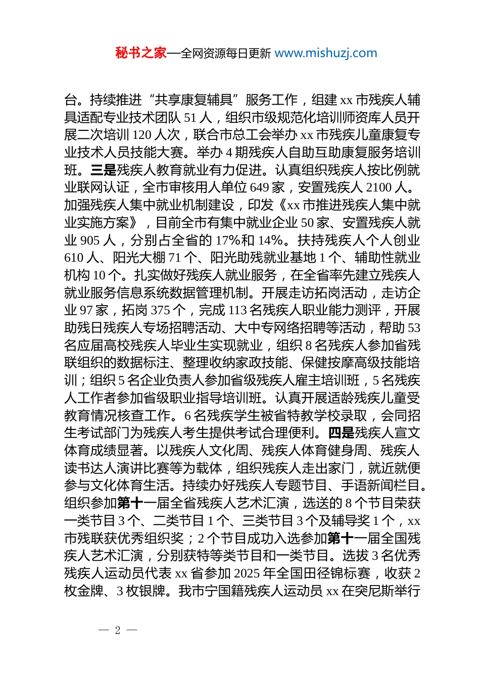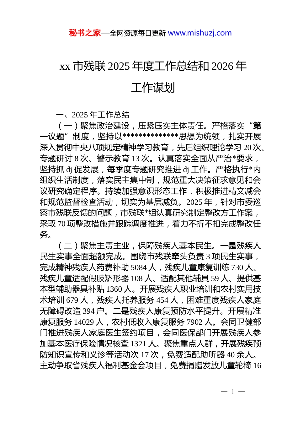 秘书之家—全网资源每日更新 www.mishuzj.comxx 市残联 2025 年度工作总结和 2026 年工作谋划一、2025 年工作总结(一)聚焦政治建设,压紧压实主体责任。严格落实“第一议题”制度,坚持以**************思想为统领,扎实开展深入贯彻中央八项规定精神学习教育,先后组织理论学习 20 次、专题研讨 8 次、警示教育 13 次。认真落实全面从严治*要求,坚持抓 dj 促发展,每季度专题研究推进 dj 工作。严格执行*内组织生活制度,落实民主集中制,规范重大决策征求意见和会议研究确定程序。持续加强意识形态工作,积极推进精文减会和规范监督检查活动,切实为基层减负。2025 年,针对市委巡察市残联反馈的问题,市残联*组认真研究制定整改方工作案,采取 70 项整改措施并跟踪调度推进,着力不折不扣完成整改任务。(二)聚焦主责主业,保障残疾人基本民生。一是残疾人民生实事全面超额完成。围绕市残联牵头负责 3 项民生实事,完成精神残疾人药费补助 5084 人,残疾儿童康复训练 730 人、残疾儿童适配假肢矫形器 108 人、适配其他辅具 59 人、提供基本型辅助器具补贴 1360 人。开展残疾人职业培训和农村实用技术培训 679 人,残疾人托养服务 454 人,困难重度残疾人家庭无障碍改造 394 户。二是残疾人康复预防水平提升。开展精准康复服务 14029 人,农村低收入康复服务 7902 人。会同卫健部门推进残疾人家庭医生签约项目,会同医保部门开展残疾人参加基本医疗保险情况核查 1321 人。聚焦重点人群,开展残疾预防知识宣传和义诊等活动次 17 次,免费适配助听器 40 余人。主动争取省残疾人福利基金会项目,免费捐赠发放儿童轮椅 16— 1 —秘书之家—全网资源每日更新 www.mishuzj.com台。持续推进“共享康复辅具”服务工作,组建 xx 市残疾人辅具适配专业技术团队 51 人,组织市级规范化培训师资库人员开展二次培训 120 人次,联合市总工会举办 xx 市残疾儿童康复专业技术人员技能大赛。举办 4 期残疾人自助互助康复服务培训班。三是残疾人教育就业有力促进。认真组织残疾人按比例就业联网认证,全市审核用人单位 649 家,安置残疾人 2100 人。加强残疾人集中就业机制建设,印发《xx 市推进残疾人集中就业实施方案》,目前全市有集中就业企业 50 家、安置残疾人就业 905 人,分别占全省的 17%和 14%。扶持残疾人个人创业610 人、阳光大棚 71 个、阳光助残就业基地 1 个、辅助性就业机构 10 个。扎实做好残疾人就业服务,在全省率先建立残疾人就业服务信息系统数据管理机制。开展走访拓岗活动,走访企业 97 家,拓岗 375 个,完成 113 名残疾人职业能力测评,开展助残日残疾人专场招聘活动、大中专网络招聘等活动,帮助 53名应届高校残疾人毕业生实现就业,组织 8 名残疾人参加省残联组织的数据标注、整理收纳家政技能、保健按摩高级技能培训;组织 5 名企业负责人参加省级残疾人雇主培训班,5 名残疾人工作者参加省级职业指导培训班。认真开展适龄残疾儿童受教育情况核查工作。6 名残疾学生被省特教学校录取,会同招生考试部门为残疾人考生提供考试合理便利。四是残疾人宣文体育成绩显著。以残疾人文化周、残疾人体育健身周、残疾人读书达人演讲比赛等为载体,组织残疾人走出家门,就近就便参与文化体育生活。持续办好残疾人专题节目、手语新闻栏目。组织参加第十一届全省残疾人艺术汇演,选送的 8 个节目荣获一类节目 3 个、二类节目 1 个、三类节目 3 个及辅导奖 1 个,xx市残联获优秀组织奖;2 个节目成功入选参加第十一届全国残疾人艺术汇演,分别获特等类节目和一类节目。选拔 3 名优秀残疾人运动员代表 xx 省参加 2025 年全国田径锦标赛,收获 2枚金牌、3 枚银牌。我市宁国籍残疾人运动员 xx 在突尼斯举行— 2 —秘书之家—全网资源每日更新 www.mishuzj.com的 2025 年世界残奥田径大奖赛男子 f40 级铅球项目中荣获银牌。(三)聚焦服务创新,提升残疾人群众满意度。一是强化联系帮扶。制定《xx 市 2025 年困难重度残疾人关爱服务专项提升行动实施方...