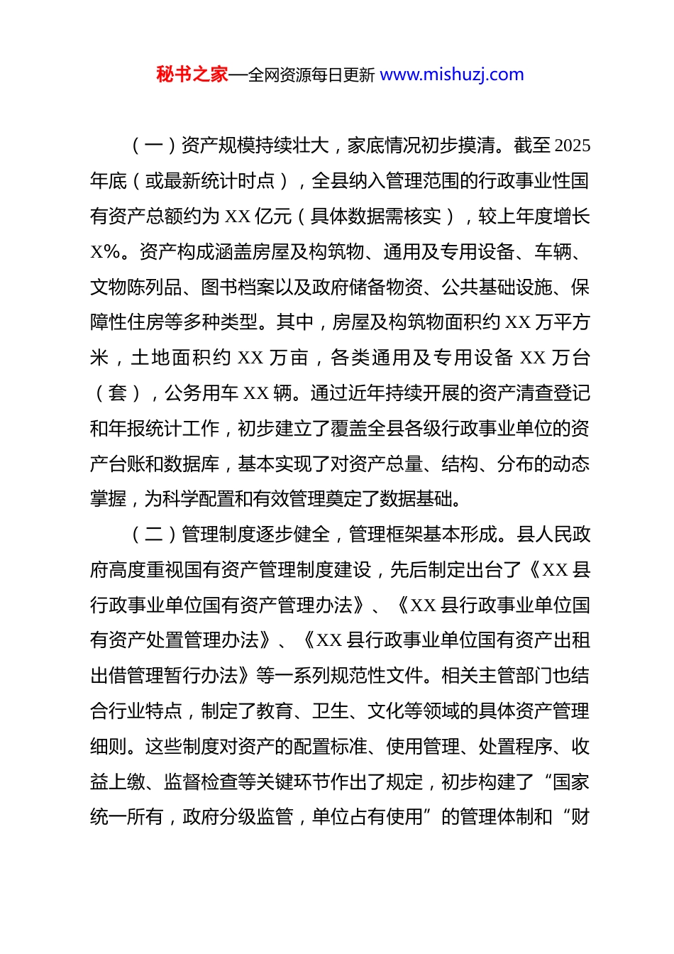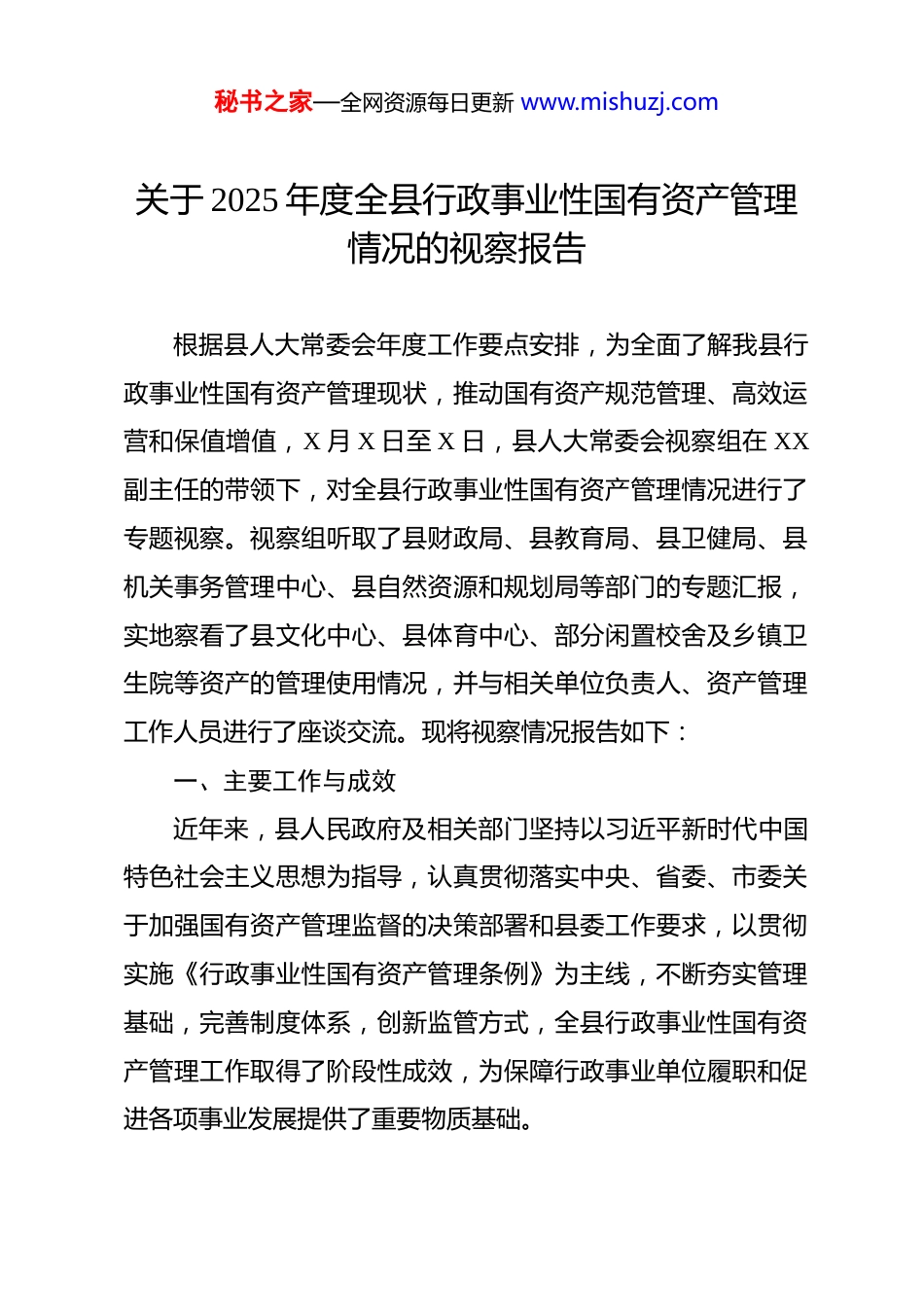 秘书之家—全网资源每日更新 www.mishuzj.com关于 2025 年度全县行政事业性国有资产管理情况的视察报告 根据县人大常委会年度工作要点安排,为全面了解我县行政事业性国有资产管理现状,推动国有资产规范管理、高效运营和保值增值,X 月 X 日至 X 日,县人大常委会视察组在 XX副主任的带领下,对全县行政事业性国有资产管理情况进行了专题视察。视察组听取了县财政局、县教育局、县卫健局、县机关事务管理中心、县自然资源和规划局等部门的专题汇报,实地察看了县文化中心、县体育中心、部分闲置校舍及乡镇卫生院等资产的管理使用情况,并与相关单位负责人、资产管理工作人员进行了座谈交流。现将视察情况报告如下:一、主要工作与成效近年来,县人民政府及相关部门坚持以习近平新时代中国特色社会主义思想为指导,认真贯彻落实中央、省委、市委关于加强国有资产管理监督的决策部署和县委工作要求,以贯彻实施《行政事业性国有资产管理条例》为主线,不断夯实管理基础,完善制度体系,创新监管方式,全县行政事业性国有资产管理工作取得了阶段性成效,为保障行政事业单位履职和促进各项事业发展提供了重要物质基础。秘书之家—全网资源每日更新 www.mishuzj.com(一)资产规模持续壮大,家底情况初步摸清。截至 2025年底(或最新统计时点),全县纳入管理范围的行政事业性国有资产总额约为 XX 亿元(具体数据需核实),较上年度增长X%。资产构成涵盖房屋及构筑物、通用及专用设备、车辆、文物陈列品、图书档案以及政府储备物资、公共基础设施、保障性住房等多种类型。其中,房屋及构筑物面积约 XX 万平方米,土地面积约 XX 万亩,各类通用及专用设备 XX 万台(套),公务用车 XX 辆。通过近年持续开展的资产清查登记和年报统计工作,初步建立了覆盖全县各级行政事业单位的资产台账和数据库,基本实现了对资产总量、结构、分布的动态掌握,为科学配置和有效管理奠定了数据基础。(二)管理制度逐步健全,管理框架基本形成。县人民政府高度重视国有资产管理制度建设,先后制定出台了《XX 县行政事业单位国有资产管理办法》、《XX 县行政事业单位国有资产处置管理办法》、《XX 县行政事业单位国有资产出租出借管理暂行办法》等一系列规范性文件。相关主管部门也结合行业特点,制定了教育、卫生、文化等领域的具体资产管理细则。这些制度对资产的配置标准、使用管理、处置程序、收益上缴、监督检查等关键环节作出了规定,初步构建了“国家统一所有,政府分级监管,单位占有使用”的管理体制和“财秘书之家—全网资源每日更新 www.mishuzj.com政部门—主管部门—行政事业单位”三个层次的监督管理框架,管理工作的制度化、规范化水平得到提升。(三)关键环节监管加强,管理秩序趋向规范。一是在资产配置环节,预算约束逐步强化。积极探索资产管理与预算管理相结合,将部分大型设备、办公家具等资产的配置需求纳入部门预算审核,严格执行配置标准和审核程序,从源头上控制不合理的资产购置和重复建设,促进了资产配置的合规性与合理性。二是在资产使用环节,日常监管得到重视。督促各单位建立健全内部资产管理制度,明确使用保管责任。对资产出租、出借行为加强了审批管理,规范合同签订,租金收入按规定纳入预算管理。部分单位开展了资产使用效益的初步评价。三是在资产处置环节,公开透明原则得以贯彻。对规定限额以上或涉及重大价值的资产处置,普遍要求履行评估、审批(备案)程序,并通过公共资源交易平台采取拍卖、招投标等公开方式进行,有效防止了国有资产流失。四是在收益管理环节,“收支两条线”得到执行。国有资产处置收入、出租出借收入等按规定作为政府非税收入,及时足额上缴国库,实行“收支两条线”管理,切断了单位“坐收坐支”的渠道。(四)信息化建设稳步推进,监管手段有所创新。按照全省统一部署,积极推广应用“行政事业性国有资产管理信息系秘书之家—全网资源每日更新 www.mishuzj.com统”,督促各单位及时录入资产卡片信息,动态更新资产增减变动情况。目前,全县大部分一级预算单位已接入该系统,实现了资产数据的在线填报、审...