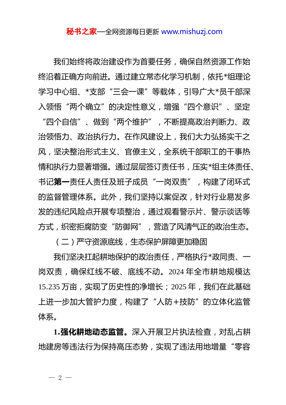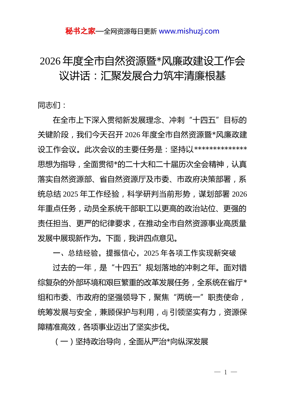 秘书之家—全网资源每日更新 www.mishuzj.com2026 年度全市自然资源暨*风廉政建设工作会议讲话:汇聚发展合力筑牢清廉根基同志们:在全市上下深入贯彻新发展理念、冲刺“十四五”目标的关键阶段,我们今天召开 2026 年度全市自然资源暨*风廉政建设工作会议。此次会议的主要任务是:坚持以**************思想为指导,全面贯彻*的二十大和二十届历次全会精神,认真落实自然资源部、省自然资源厅及市委、市政府决策部署,系统总结 2025 年工作经验,科学研判当前形势,谋划部署 2026年重点任务,动员全系统干部职工以更高的政治站位、更强的责任担当、更严的纪律要求,在推动全市自然资源事业高质量发展中展现新作为。下面,我讲四点意见。一、总结经验,提振信心,2025 年各项工作实现新突破过去的一年,是“十四五”规划落地的冲刺之年。面对错综复杂的外部环境和艰巨繁重的改革发展任务,全系统在省厅*组和市委、市政府的坚强领导下,聚焦“两统一”职责使命,统筹发展与安全,兼顾保护与利用,dj 引领坚实有力,资源保障精准高效,各项事业迈出了坚实步伐。(一)坚持政治导向,全面从严治*向纵深发展— 1 —秘书之家—全网资源每日更新 www.mishuzj.com我们始终将政治建设作为首要任务,确保自然资源工作始终沿着正确方向前进。通过建立常态化学习机制,依托*组理论学习中心组、*支部“三会一课”等载体,引导广大*员干部深入领悟“两个确立”的决定性意义,增强“四个意识”、坚定“四个自信”、做到“两个维护”,不断提高政治判断力、政治领悟力、政治执行力。在作风建设上,我们大力弘扬实干之风,坚决整治形式主义、官僚主义,全系统干部职工的干事热情和执行力显著增强。通过层层签订责任书,压实*组主体责任、书记第一责任人责任及班子成员“一岗双责”,构建了闭环式的监督管理体系。此外,我们坚持以案促改,针对行业易发多发的违纪风险点开展专项整治,通过观看警示片、警示谈话等方式,织密拒腐防变“防御网”,营造了风清气正的政治生态。(二)严守资源底线,生态保护屏障更加稳固我们坚决扛起耕地保护的政治责任,严格执行*政同责、一岗双责,确保红线不破、底线不动。2024 年全市耕地规模达15.235 万亩,实现了历史性的净增长;2025 年,我们在此基础上进一步加大管护力度,构建了“人防+技防”的立体化监管体系。1.强化耕地动态监管。深入开展卫片执法检查,对乱占耕地建房等违法行为保持高压态势,实现了违法用地增量“零容— 2 —秘书之家—全网资源每日更新 www.mishuzj.com忍”、存量“大清零”。2.推进生态修复工程。系统开展废弃矿山修复与流域治理,修复生态面积达 xx 公顷,全市生态环境质量持续改善。3.提升节约集约水平。坚持“亩均论英雄”,通过批而未供土地处置和闲置土地收回,有效盘活了存量空间,保障了重点产业项目的用地需求。(三)优化要素保障,服务发展大局质效兼优我们坚持要素跟着项目走,主动对接全市重点工程。2025年,通过开辟行政审批“绿色通道”,大幅压减审批时限,有力保障了交通、能源等基础设施建设及重大产业项目落地。同时,我们深化“放管服”改革,不动产登记实现了“一网通办”和“跨省通办”,群众和企业的获得感、满意度大幅提升。二、正视问题,清醒研判,精准把握当前面临的新形势在肯定成绩的同时,我们也要清醒地认识到,全市自然资源工作仍面临不少挑战:资源保护与经济发展的矛盾依然突出,部分地区节约集约利用水平有待提高,基层执法力量相对薄弱,*风廉政建设在个别领域仍存在薄弱环节。全系统务必保持清醒头脑,直面问题,在接下来的工作中采取有力措施予以解决。三、聚焦重点,精准发力,全面开启 2026 年工作新征程2026 年是“十五五”规划筹划的起步之年。我们要坚持稳— 3 —秘书之家—全网资源每日更新 www.mishuzj.com中求进工作总基调,重点抓好以下四个方面:(一)以更高站位强化政治引领。持续深化理论武装,将学习成果转化为解决实际问题的能力。严明政治纪律,确保上级决策部署在自然资源系统不折不扣落实到位。(二)以更严要求守护资源安全。坚决守住耕地红线,加...