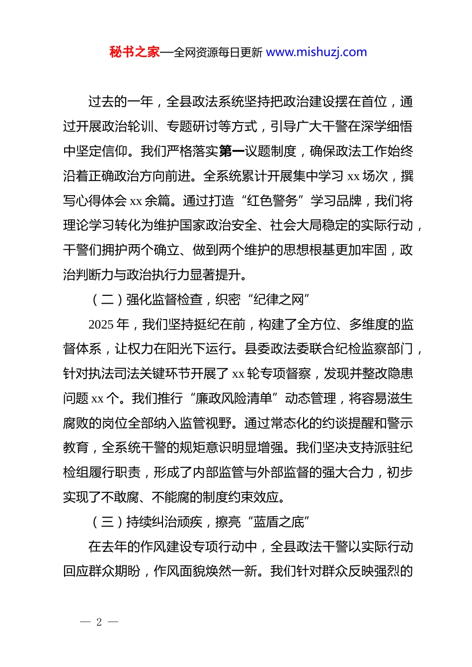 秘书之家—全网资源每日更新 www.mishuzj.comxx 县委常委、政法委书记在全县政法系统2026 年全面从严治*暨*风廉政建设工作专题会上的讲话:深耕清廉沃土,锻造政法铁军同志们:今天,我们在这里隆重召开全县政法系统 2026 年全面从严治*暨*风廉政建设工作专题会。这次会议的主要任务是:以*的二十届历次全会精神为指引,深入贯彻中央及省、市关于加强*风廉政建设的部署要求,总结 2025 年决胜收官阶段的工作成效,研究谋划 2026 年政法铁军建设的开局之策。2025 年,全县政法系统在冲刺各项年度目标的征程中,坚持以刀刃向内的勇气推进自我革命,管*治*责任进一步压实,政法队伍的政治生态持续向好,有力保障了全县社会的和谐稳定。但我们必须清醒看到,全面从严治*永远在路上,政法系统的特殊属性决定了我们在廉政建设上必须标准更高、要求更严。2026 年是深化平安建设、启动政法工作现代化新篇章的启航之年。在新起点上,我们要保持赶考的清醒,以清廉底色绘就政法蓝图。下面,我讲三点意见。一、回望奋斗征程,肯定管*治*新成效(一)深化理论武装,筑牢“忠诚之魂”— 1 —秘书之家—全网资源每日更新 www.mishuzj.com过去的一年,全县政法系统坚持把政治建设摆在首位,通过开展政治轮训、专题研讨等方式,引导广大干警在深学细悟中坚定信仰。我们严格落实第一议题制度,确保政法工作始终沿着正确政治方向前进。全系统累计开展集中学习 xx 场次,撰写心得体会 xx 余篇。通过打造“红色警务”学习品牌,我们将理论学习转化为维护国家政治安全、社会大局稳定的实际行动,干警们拥护两个确立、做到两个维护的思想根基更加牢固,政治判断力与政治执行力显著提升。(二)强化监督检查,织密“纪律之网”2025 年,我们坚持挺纪在前,构建了全方位、多维度的监督体系,让权力在阳光下运行。县委政法委联合纪检监察部门,针对执法司法关键环节开展了 xx 轮专项督察,发现并整改隐患问题 xx 个。我们推行“廉政风险清单”动态管理,将容易滋生腐败的岗位全部纳入监管视野。通过常态化的约谈提醒和警示教育,全系统干警的规矩意识明显增强。我们坚决支持派驻纪检组履行职责,形成了内部监管与外部监督的强大合力,初步实现了不敢腐、不能腐的制度约束效应。(三)持续纠治顽疾,擦亮“蓝盾之底”在去年的作风建设专项行动中,全县政法干警以实际行动回应群众期盼,作风面貌焕然一新。我们针对群众反映强烈的— 2 —秘书之家—全网资源每日更新 www.mishuzj.com有案不立、压案不查等问题开展专项整治,累计处理违规违纪干警 xx 人。通过开展“阳光执法”行动,我们简化了办事流程xx 项,提升了行政效率。全系统通过设立廉政文化长廊、开展家风座谈会等形式,厚植廉洁根基。干警们在扫黑除恶常态化、社会治理现代化等攻坚任务中表现突出,用实际成效擦亮了人民警察、司法官的蓝盾底色,群众对政法工作的满意度提升至xx%。二、直面风险挑战,剖析政法队伍新顽疾(一)理论研读不深,警惕“温差效应”尽管我们在学习教育上投入了大量精力,但部分单位仍存在上热下冷、学用脱节的问题。一些基层干警对*的创新理论仅仅停留在划重点、念文件的浅表层次,没有真正触及灵魂深处。这种“温差现象”导致在面对复杂的意识形态斗争和法治建设新需求时,个别同志政治敏锐性不高,缺乏从政治上观察和处理问题的能力。如果不能彻底解决思想上的贫血,政法队伍的绝对忠诚就难以保障,在风浪面前就可能迷失方向,这是我们2026 年必须着力解决的首要问题。(二)制度执行不严,防范“蚁穴风险”虽然我们建立了一系列管*治*的规章制度,但在具体执行过程中,个别单位依然存在打折扣、搞变通的现象。有的领导— 3 —秘书之家—全网资源每日更新 www.mishuzj.com干部对身边人的小错误不以为意,习惯于睁一只眼闭一只眼,导致小病拖成大病。这种“蚁穴风险”极易蚕食政法队伍的公信力。在调研中发现,个别窗口岗位在服务群众时,虽然没有违大纪,但推诿扯皮、冷硬横推的官僚作风依然存在。这说明我们的制度篱笆扎得还不够紧,监督执纪的末梢神经还没有完全激活,必须引起全系统...