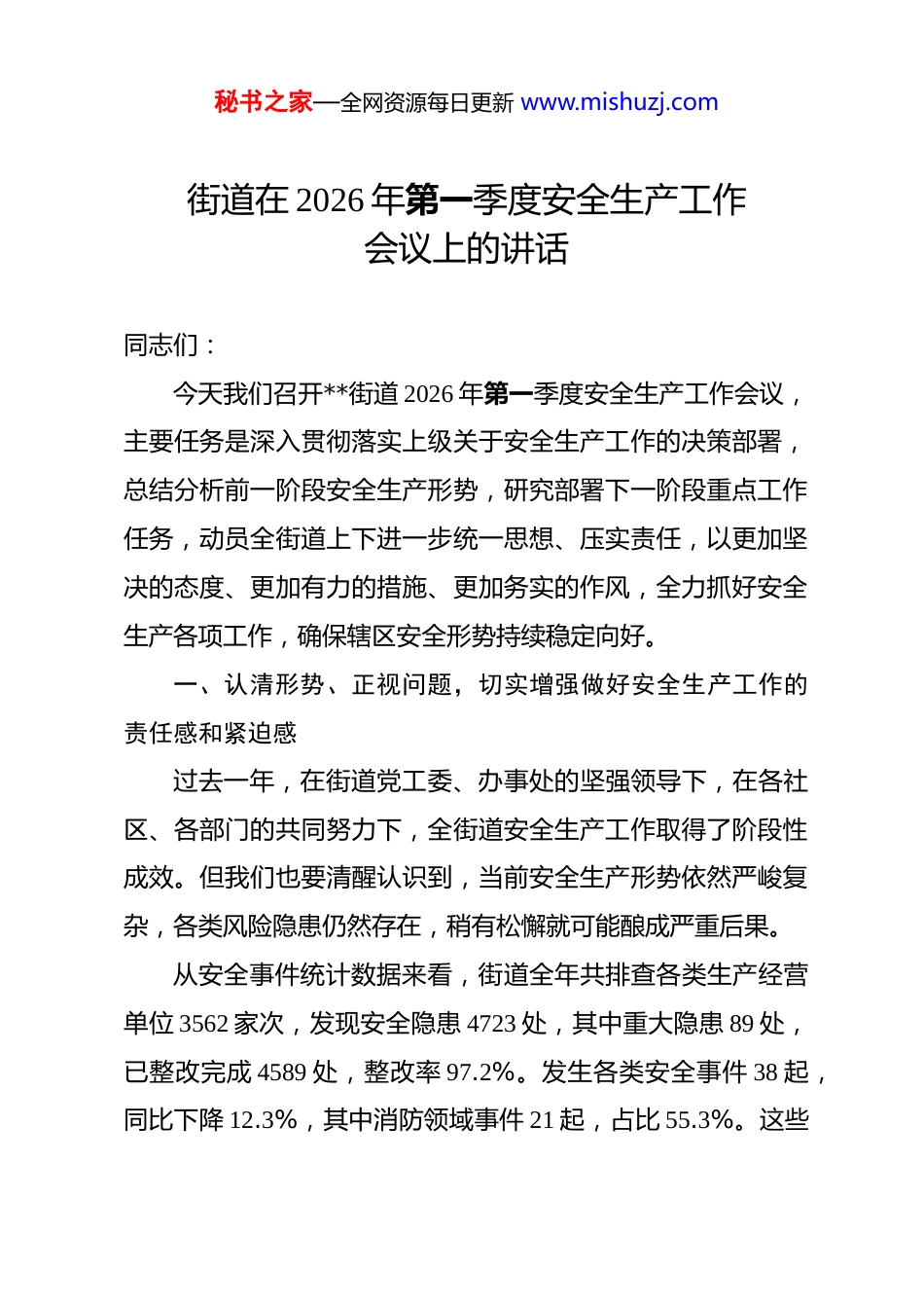 秘书之家—全网资源每日更新 www.mishuzj.com街道在 2026 年第一季度安全生产工作会议上的讲话 同志们:今天我们召开**街道 2026 年第一季度安全生产工作会议,主要任务是深入贯彻落实上级关于安全生产工作的决策部署,总结分析前一阶段安全生产形势,研究部署下一阶段重点工作任务,动员全街道上下进一步统一思想、压实责任,以更加坚决的态度、更加有力的措施、更加务实的作风,全力抓好安全生产各项工作,确保辖区安全形势持续稳定向好。一、认清形势、正视问题,切实增强做好安全生产工作的责任感和紧迫感过去一年,在街道党工委、办事处的坚强领导下,在各社区、各部门的共同努力下,全街道安全生产工作取得了阶段性成效。但我们也要清醒认识到,当前安全生产形势依然严峻复杂,各类风险隐患仍然存在,稍有松懈就可能酿成严重后果。从安全事件统计数据来看,街道全年共排查各类生产经营单位 3562 家次,发现安全隐患 4723 处,其中重大隐患 89 处,已整改完成 4589 处,整改率 97.2%。发生各类安全事件 38 起,同比下降 12.3%,其中消防领域事件 21 起,占比 55.3%。这些秘书之家—全网资源每日更新 www.mishuzj.com数据表明,我们的工作虽然取得了一定成效,但隐患排查治理任务依然繁重,安全事件仍时有发生,安全生产形势不容乐观。从专项治理进展情况来看,街道深入开展高层建筑及人员密集场所消防安全专项整治,共检查高层住宅小区 67 个、高层公共建筑 23 栋、人员密集场所 412 家,发现并督促整改火灾隐患 1836 处,其中消防设施故障问题 487 处、疏散通道堵塞问题392 处、消防器材缺失或损坏问题 356 处、电动自行车违规停放充电问题 289 处、其他问题 312 处。对消防职责履行不到位的物业服务企业实施行政处罚 21 家,罚款金额 14.8 万元,约谈责任单位负责人 56 人次。从整改完成情况看,已整改消除火灾隐患 1521 处,整改率 82.8%,但仍有 315 处隐患正在整改中,其中涉及消防设施重大故障的整改周期较长,需要进一步加大推进力度。从应急演练工作开展情况来看,街道全年共组织开展各类应急演练 86 场次,参与人员达 12800 余人次,其中综合应急演练 12 场次、专项应急演练 42 场次、社区级应急演练 32 场次。通过演练共发现问题和不足 217 项,已修订完善应急预案43 份,新增预案条款 186 条。演练评估显示,开展常态化应急演练的区域,事故伤亡率较未开展演练的区域降低 25%以上,应急响应时间平均缩短 3.5 分钟。但也存在部分单位演练流于形式、预案针对性和可操作性不强、应急物资储备不足等问题。秘书之家—全网资源每日更新 www.mishuzj.com二、深化认识、提高站位,充分认识安全生产工作的极端重要性安全生产事关人民群众生命财产安全,事关经济社会发展大局,事关社会和谐稳定。全街道上下必须站在讲政治、顾大局的高度,深刻认识安全生产工作的极端重要性,始终把安全生产放在首要位置。一是要深刻认识安全生产是必须坚守的政治红线。安全生产是底线、红线、生命线,任何时候都不能放松。各级各部门要始终坚持人民至上、生命至上,把保护人民生命安全摆在首位,以对人民群众极端负责的态度抓好安全生产工作,坚决遏制重特大事故发生,最大限度减少各类事故隐患。二是要深刻认识安全生产是高质量发展的内在要求。安全是发展的前提,发展是安全的保障。没有安全,一切发展都无从谈起。我们必须统筹发展和安全,坚持安全第一、预防为主、综合治理的方针,把安全生产贯穿于经济社会发展各领域全过程,以高水平安全保障高质量发展。三是要深刻认识安全生产是维护社会稳定的重要基础。安全生产事故不仅造成人员伤亡和财产损失,还会引发社会矛盾、影响社会稳定。我们必须把安全生产作为维护社会稳定的重要举措来抓,坚决防范和遏制各类安全事故发生,为辖区经济社秘书之家—全网资源每日更新 www.mishuzj.com会发展营造良好安全环境。三、聚焦重点、精准发力,扎实推进安全宣传教育与警示教育工作安全宣传教育是安全生产的基础性工作,警示教育是防范事故的有效手段。我们要把安全宣传教...