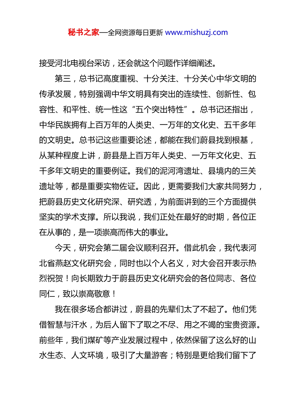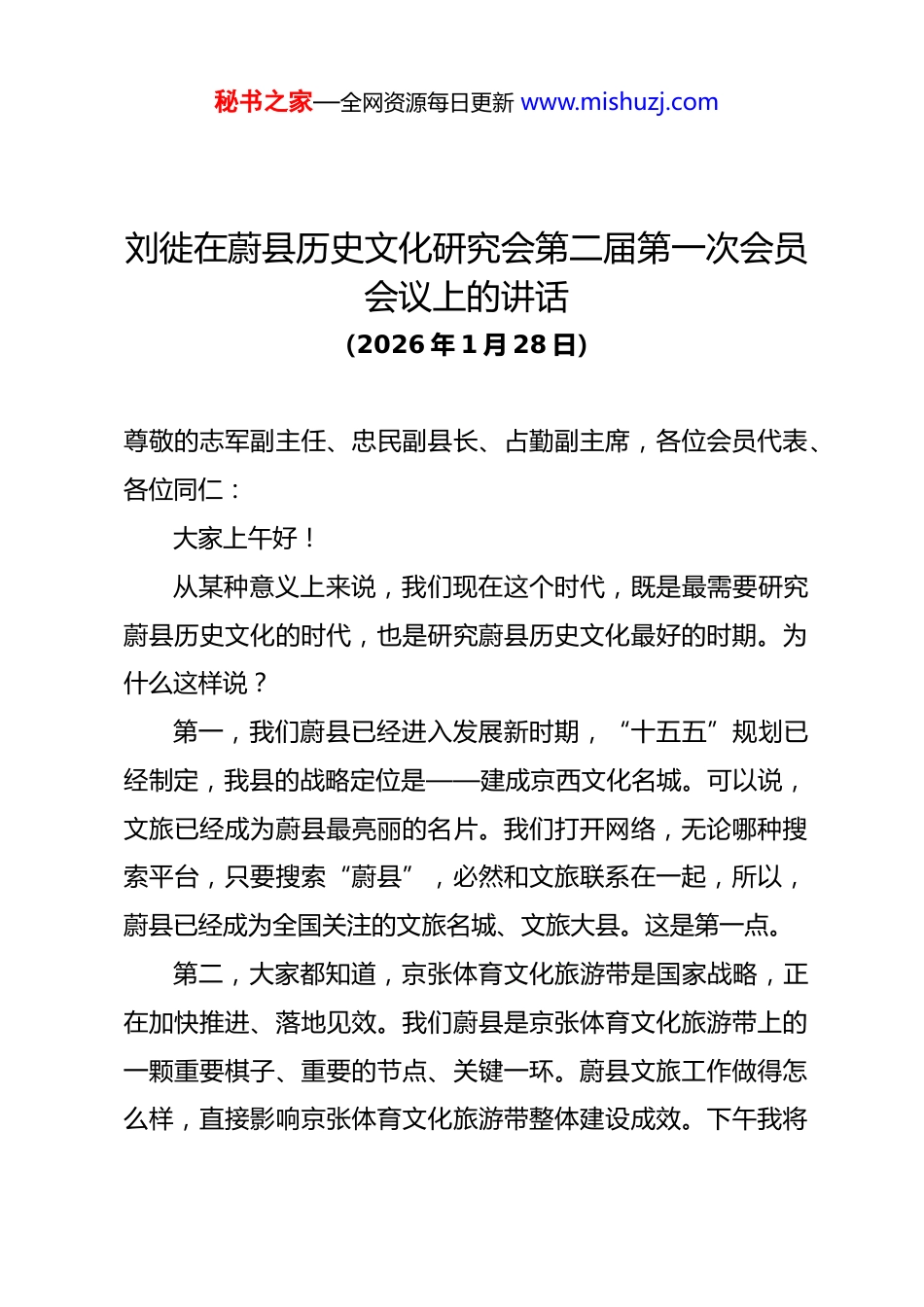 秘书之家—全网资源每日更新 www.mishuzj.com刘徙在蔚县历史文化研究会第二届第一次会员会议上的讲话(2026 年 1 月 28 日)尊敬的志军副主任、忠民副县长、占勤副主席,各位会员代表、各位同仁:大家上午好!从某种意义上来说,我们现在这个时代,既是最需要研究蔚县历史文化的时代,也是研究蔚县历史文化最好的时期。为什么这样说?第一,我们蔚县已经进入发展新时期,“十五五”规划已经制定,我县的战略定位是——建成京西文化名城。可以说,文旅已经成为蔚县最亮丽的名片。我们打开网络,无论哪种搜索平台,只要搜索“蔚县”,必然和文旅联系在一起,所以,蔚县已经成为全国关注的文旅名城、文旅大县。这是第一点。第二,大家都知道,京张体育文化旅游带是国家战略,正在加快推进、落地见效。我们蔚县是京张体育文化旅游带上的一颗重要棋子、重要的节点、关键一环。蔚县文旅工作做得怎么样,直接影响京张体育文化旅游带整体建设成效。下午我将秘书之家—全网资源每日更新 www.mishuzj.com接受河北电视台采访,还会就这个问题作详细阐述。第三,总书记高度重视、十分关注、十分关心中华文明的传承发展,特别强调中华文明具有突出的连续性、创新性、包容性、和平性、统一性这“五个突出特性”。总书记还指出,中华民族拥有上百万年的人类史、一万年的文化史、五千多年的文明史。总书记这些重要论述,都能在我们蔚县找到根基,从某种程度上讲,蔚县是上百万年人类史、一万年文化史、五千多年文明史的重要例证。我们的泥河湾遗址、县境内的三关遗址等,都是重要实物佐证。因此,更需要我们大家共同努力,把蔚县历史文化研究深、研究透,为前面讲到的三个方面提供坚实的学术支撑。所以我说,我们正处在最好的时期,各位正在从事的,是一项崇高而伟大的事业。今天,研究会第二届会议顺利召开。借此机会,我代表河北省燕赵文化研究会,同时也以个人名义,对大会召开表示热烈祝贺!向长期致力于蔚县历史文化研究会的各位同志、各位同仁,致以崇高敬意!我在很多场合都讲过,蔚县的先辈们太了不起了。他们凭借智慧与汗水,为后人留下了取之不尽、用之不竭的宝贵资源。前些年,我们煤矿等产业发展过程中,依然保留了这么好的山水生态、人文环境,吸引了大量游客;特别是更给我们留下了秘书之家—全网资源每日更新 www.mishuzj.com极其丰厚的物质文化遗产、非物质的文化遗产,这是非常难得、非常珍贵的。所以,不仅我们在座的在研究蔚县,而且全国各地专家学者、社会各界都在关注蔚县。我再举两个例子:二十年前,我撰写《张家口古城堡》和《张家口历史文化人物》两本书时,身边几乎没有任何现成资料,只有几本县志和零散资料,写起来十分困难。现在打开网络看,关于蔚县的专著、关于蔚县古城堡的书籍已经出版很多种,不少著作还引用了我当年的文章内容,因为我们当时做的是开拓性、基础性的工作。第二个例子,当年我在河北大学读博士时期,和我的导师历史学家刘秋根教授谈起张家口、蔚县,他当时表示闻所未闻,从未听说过。但现在完全不一样了,这两年,刘秋根教授指导硕士、博士研究生,重点研究蔚县及张家口地区,还牵头组织编写《张家口经济社会史、相关论文集等两部重要著作。现在,国内很多专家学者都在研究我们张家口、蔚县,不少硕士、博士以蔚县为选题撰写学位论文,把蔚县历史、古城作为专门学问来研究。蔚县的一方碑刻、一本老账本,都成为重要研究素材,对此我们由衷感到高兴。可以说,蔚县历史文化、蔚县古城堡研究,将来不仅是蔚秘书之家—全网资源每日更新 www.mishuzj.com县的学问、河北的学问,更有可能推向全国、走向世界。我非常理解大家,大家非常不容易,在县里开展历史文化研究很不容易,受财力、物力、视野等各方面条件限制,想要推出重大成果很难很大。但即使如此,我觉得已经很了不起,这些年上一届研究会在建军同志带领下,已经取得了不少实实在在的成果,《蔚县历史文化研究》一至三期这三本书,就是很好的证明。对此我也深感骄傲。所以,今天聘请我担任研究会学术顾问,我欣然接受,深感荣幸,这是一件值得骄傲的事情。下一步,我认为蔚县历史文化...