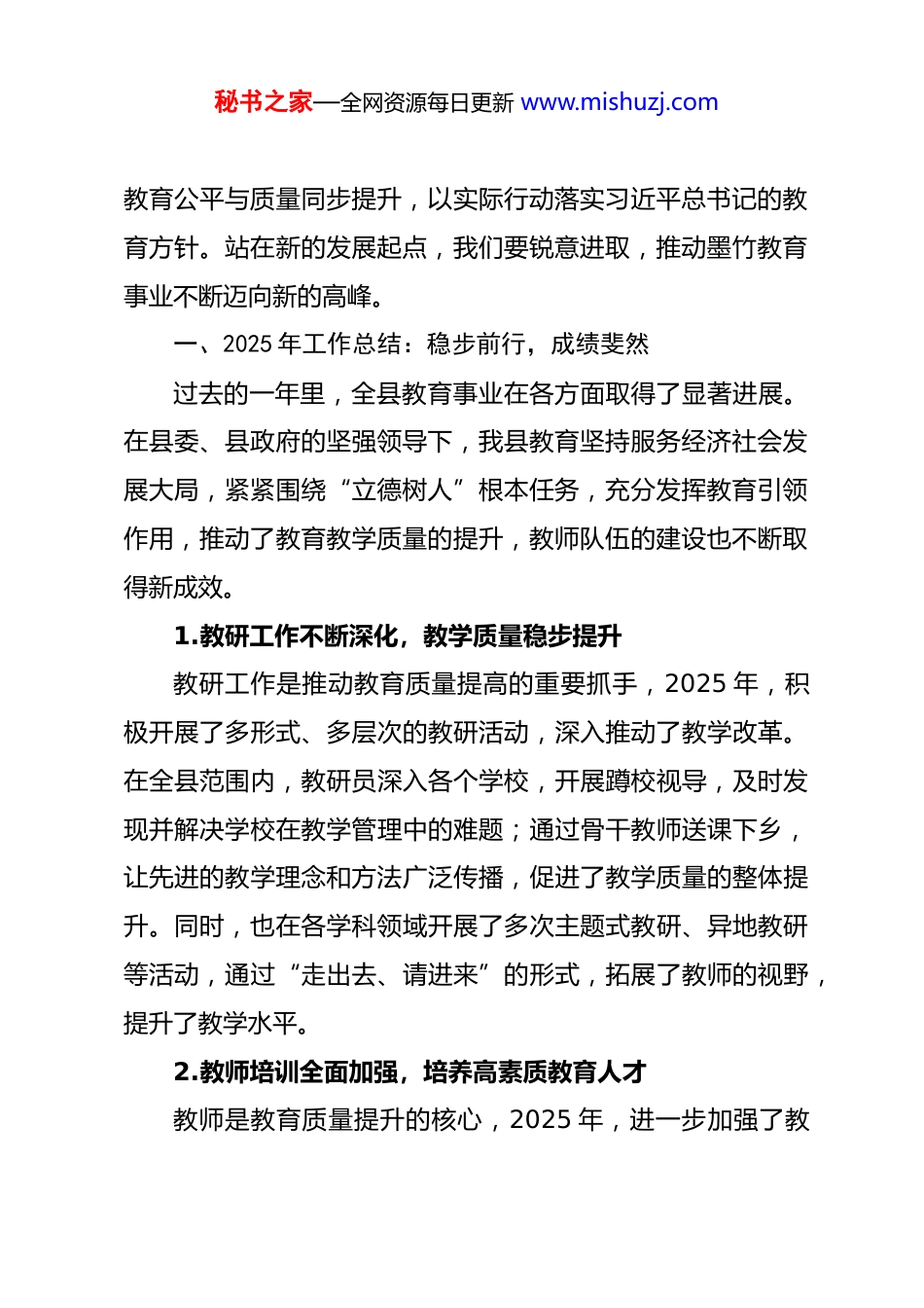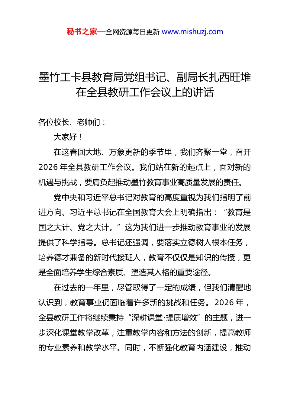 秘书之家—全网资源每日更新 www.mishuzj.com墨竹工卡县教育局党组书记、副局长扎西旺堆在全县教研工作会议上的讲话各位校长、老师们:大家好!在这春回大地、万象更新的季节里,我们齐聚一堂,召开2026 年全县教研工作会议。我们站在新的起点上,面对新的机遇与挑战,要肩负起推动墨竹教育事业高质量发展的责任。党中央和习近平总书记对教育的高度重视为我们指明了前进方向。习近平总书记在全国教育大会上明确指出:“教育是国之大计、党之大计。”这为我们进一步推动教育事业的发展提供了科学指导。总书记还强调,要落实立德树人根本任务,培养德才兼备的新时代接班人,教育不仅仅是知识的传授,更是全面培养学生综合素质、塑造其人格的重要途径。在过去的一年里,尽管取得了一定的成绩,但我们清醒地认识到,教育事业仍面临着许多新的挑战和任务。2026 年,全县教研工作将继续秉持“深耕课堂·提质增效”的主题,进一步深化课堂教学改革,注重教学内容和方法的创新,提高教师的专业素养和教学水平。同时,不断强化教育内涵建设,推动秘书之家—全网资源每日更新 www.mishuzj.com教育公平与质量同步提升,以实际行动落实习近平总书记的教育方针。站在新的发展起点,我们要锐意进取,推动墨竹教育事业不断迈向新的高峰。一、2025 年工作总结:稳步前行,成绩斐然过去的一年里,全县教育事业在各方面取得了显著进展。在县委、县政府的坚强领导下,我县教育坚持服务经济社会发展大局,紧紧围绕“立德树人”根本任务,充分发挥教育引领作用,推动了教育教学质量的提升,教师队伍的建设也不断取得新成效。1.教研工作不断深化,教学质量稳步提升教研工作是推动教育质量提高的重要抓手,2025 年,积极开展了多形式、多层次的教研活动,深入推动了教学改革。在全县范围内,教研员深入各个学校,开展蹲校视导,及时发现并解决学校在教学管理中的难题;通过骨干教师送课下乡,让先进的教学理念和方法广泛传播,促进了教学质量的整体提升。同时,也在各学科领域开展了多次主题式教研、异地教研等活动,通过“走出去、请进来”的形式,拓展了教师的视野,提升了教学水平。2.教师培训全面加强,培养高素质教育人才教师是教育质量提升的核心,2025 年,进一步加强了教秘书之家—全网资源每日更新 www.mishuzj.com师的培训和发展,全县首个市级教育科研课题顺利结题,弥补在教科研方面的短板。并启动了县级课题、论文申报评选工作,搭建了教师科研与教学实践的有效平台。同时,加强了与南京市各区的教育资源的对接,新一批援藏教师到达墨竹,组织了多批次教师赴南京异地培训学习,推动教师的专业素养不断提高。开展了名师工作室、青年教师大赛等活动,为广大教师提供了展示才华、提升教学水平的机会,为我县培养了一批具有创新精神和实践能力的教育人才。3.校际合作与区域联动,推动教育资源共享校际合作是提高教育质量的有效途径。在过去的一年中,县教育局与拉萨市实验小学、南京市鼓楼区等地开展了深度合作,局教研室、南京实验小学、唐加乡中心小学、扎西岗乡南京希望小学、尼玛江热乡小学与南京优质校完成结对共建,推动了学校的文化建设和教育教学水平的提升。评选首届墨竹工卡县名校长,其中获评一位拉萨市名校长。此外,通过“紫金矿业奖学奖教基金”的发放以及奖励优秀中小考毕业生,进一步激励了全县教师和学生的工作学习热情,推动了教育公平与教育质量的提升。4.教育设施不断完善,支持教育高质量发展在硬件建设方面,加大了投入力度,进一步改善了学校的秘书之家—全网资源每日更新 www.mishuzj.com基础设施,尤其是提升了教学楼、图书阅览室和实验室的建设,确保了学校在硬件方面能为教学提供有力支持。同时,还着力提高了教育装备的现代化水平,使教学活动更加高效、便捷,切实提高了学校的办学水平和整体教育质量。5.校园文化异彩纷呈,书香氛围日益浓厚全县高度重视校园文化对师生成长的浸润作用,推动各校形成特色鲜明的文化品牌。唐加小学的“卓雅”文化、尼江小学的“汇”文化、扎西岗乡南京希望小学的“帆”文化、南京实验小学的“爱”文化以及县中学的“石”文化...