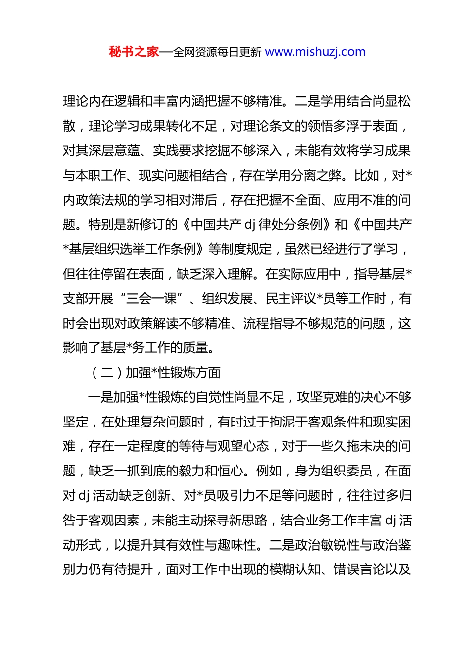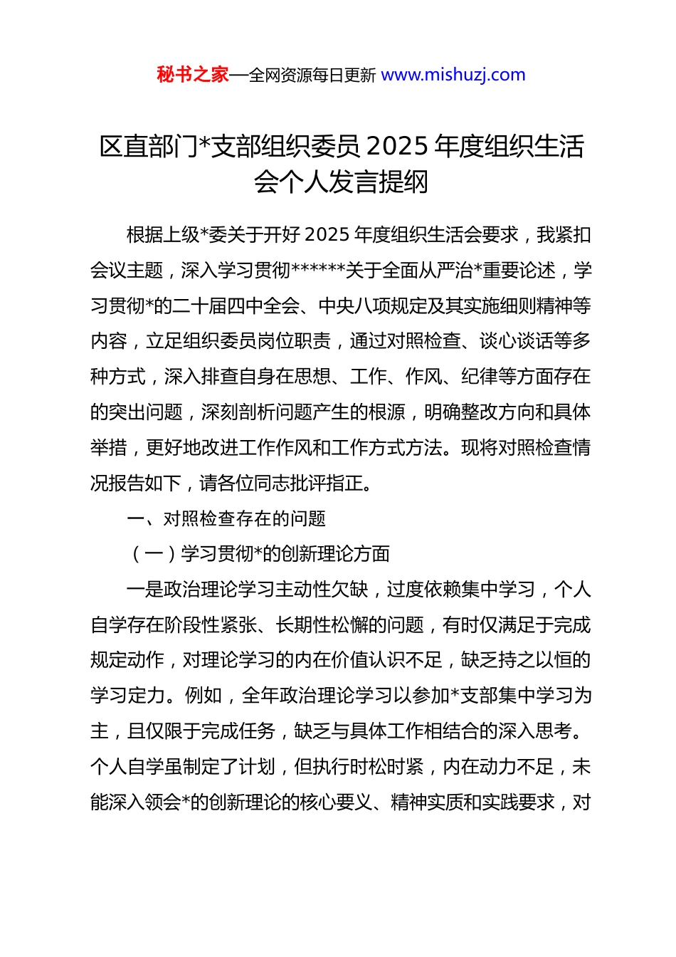 秘书之家—全网资源每日更新 www.mishuzj.com区直部门*支部组织委员 2025 年度组织生活会个人发言提纲根据上级*委关于开好 2025 年度组织生活会要求,我紧扣会议主题,深入学习贯彻******关于全面从严治*重要论述,学习贯彻*的二十届四中全会、中央八项规定及其实施细则精神等内容,立足组织委员岗位职责,通过对照检查、谈心谈话等多种方式,深入排查自身在思想、工作、作风、纪律等方面存在的突出问题,深刻剖析问题产生的根源,明确整改方向和具体举措,更好地改进工作作风和工作方式方法。现将对照检查情况报告如下,请各位同志批评指正。一、对照检查存在的问题(一)学习贯彻*的创新理论方面一是政治理论学习主动性欠缺,过度依赖集中学习,个人自学存在阶段性紧张、长期性松懈的问题,有时仅满足于完成规定动作,对理论学习的内在价值认识不足,缺乏持之以恒的学习定力。例如,全年政治理论学习以参加*支部集中学习为主,且仅限于完成任务,缺乏与具体工作相结合的深入思考。个人自学虽制定了计划,但执行时松时紧,内在动力不足,未能深入领会*的创新理论的核心要义、精神实质和实践要求,对秘书之家—全网资源每日更新 www.mishuzj.com理论内在逻辑和丰富内涵把握不够精准。二是学用结合尚显松散,理论学习成果转化不足,对理论条文的领悟多浮于表面,对其深层意蕴、实践要求挖掘不够深入,未能有效将学习成果与本职工作、现实问题相结合,存在学用分离之弊。比如,对*内政策法规的学习相对滞后,存在把握不全面、应用不准的问题。特别是新修订的《中国共产 dj 律处分条例》和《中国共产*基层组织选举工作条例》等制度规定,虽然已经进行了学习,但往往停留在表面,缺乏深入理解。在实际应用中,指导基层*支部开展“三会一课”、组织发展、民主评议*员等工作时,有时会出现对政策解读不够精准、流程指导不够规范的问题,这影响了基层*务工作的质量。(二)加强*性锻炼方面一是加强*性锻炼的自觉性尚显不足,攻坚克难的决心不够坚定,在处理复杂问题时,有时过于拘泥于客观条件和现实困难,存在一定程度的等待与观望心态,对于一些久拖未决的问题,缺乏一抓到底的毅力和恒心。例如,身为组织委员,在面对 dj 活动缺乏创新、对*员吸引力不足等问题时,往往过多归咎于客观因素,未能主动探寻新思路,结合业务工作丰富 dj 活动形式,以提升其有效性与趣味性。二是政治敏锐性与政治鉴别力仍有待提升,面对工作中出现的模糊认知、错误言论以及秘书之家—全网资源每日更新 www.mishuzj.com苗头性、倾向性问题,未能第一时间旗帜鲜明地予以纠正与引导,偶尔存在麻痹心态与侥幸心理,政治责任感有所缺失。例如,在日常工作中,面对个别*员对最新政策的负面议论,未能及时进行纠正疏导,抱有事不关己的心态。*性原则的坚持不够坚决,在*员发展政审、组织纪律监督等工作中,有时未能严格依照制度规定较真较劲,未能始终坚守按制度办事、按原则履职的底线,有损组织工作的严肃性。(三)联系服务群众方面一是宗旨意识树立不够牢固,为群众办实事、办好事的主动性与实效性有待提升,呈现出“坐等上门”多、“主动问需”少的局面。例如,在开展志愿服务活动方面,作为组织委员,组织开展志愿服务的次数较少,仅满足于完成上级交办任务,全年仅开展了 x 次志愿服务活动,服务实效性欠佳,未能精准对接群众的急难愁盼问题,服务内容与基层实际需求脱节。二是服务群众的针对性不足,在制定*务工作举措、谋划宣传推广活动、推进基层*组织建设等工作时,未能充分征求基层*员群众的意见,多以“自上而下”的方式部署安排,部分工作与群众实际需求脱节,难以切实满足群众期望。比如,联系服务群众的渠道尚不够畅通,未能充分运用微信公众号、视频号、工作群等新媒体工具,搭建便捷高效的沟通平台,导致群秘书之家—全网资源每日更新 www.mishuzj.com众参与*务监督、宣传反馈、意见表达的途径受限,部分群众的合理诉求难以及时传递、有效解决。(四)发挥先锋模范作用方面一是 dj 工作缺乏创新,未能紧密结合新时代*员特点和业务实际,探索运用数字化、场景化、互动化方式开展...