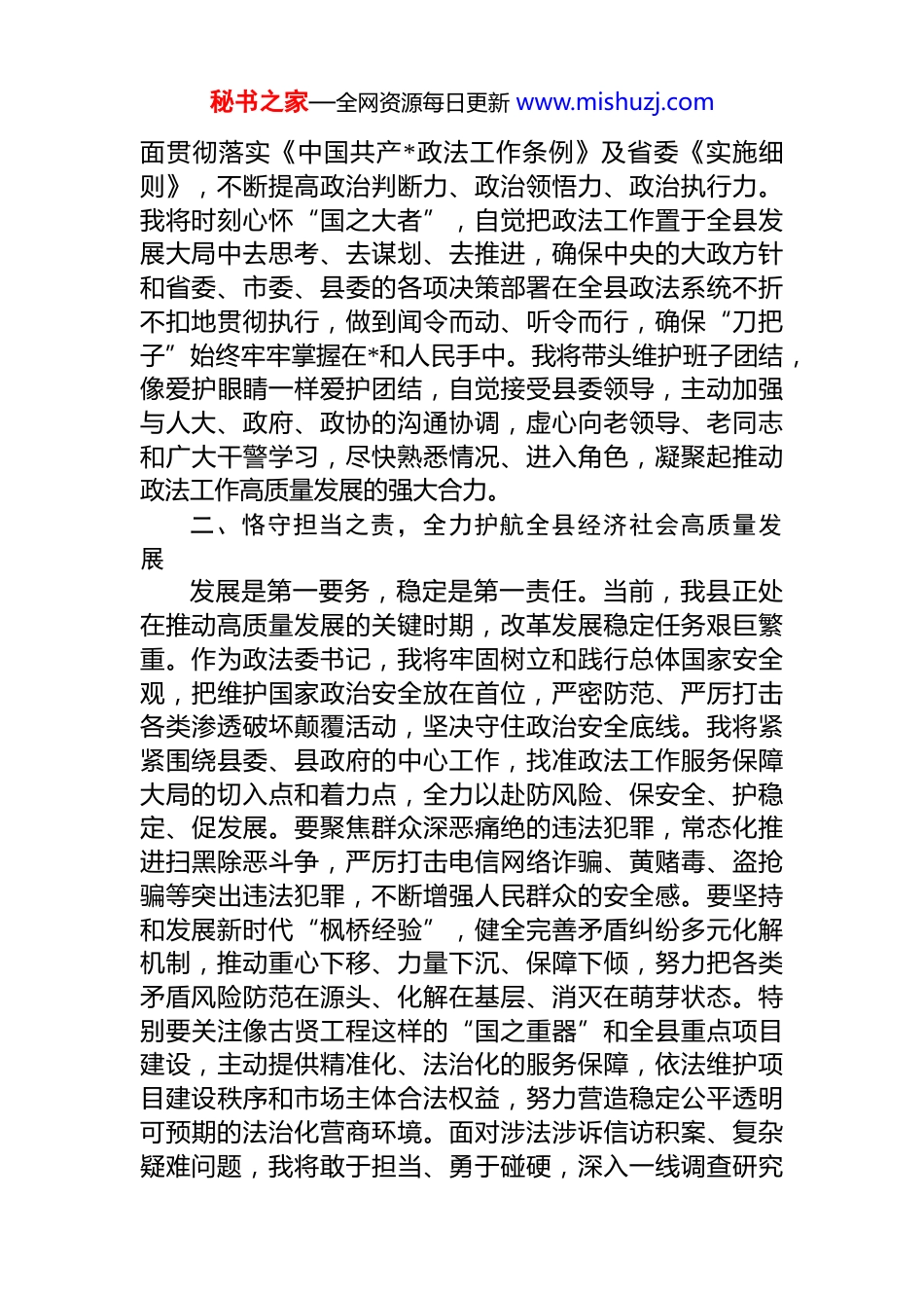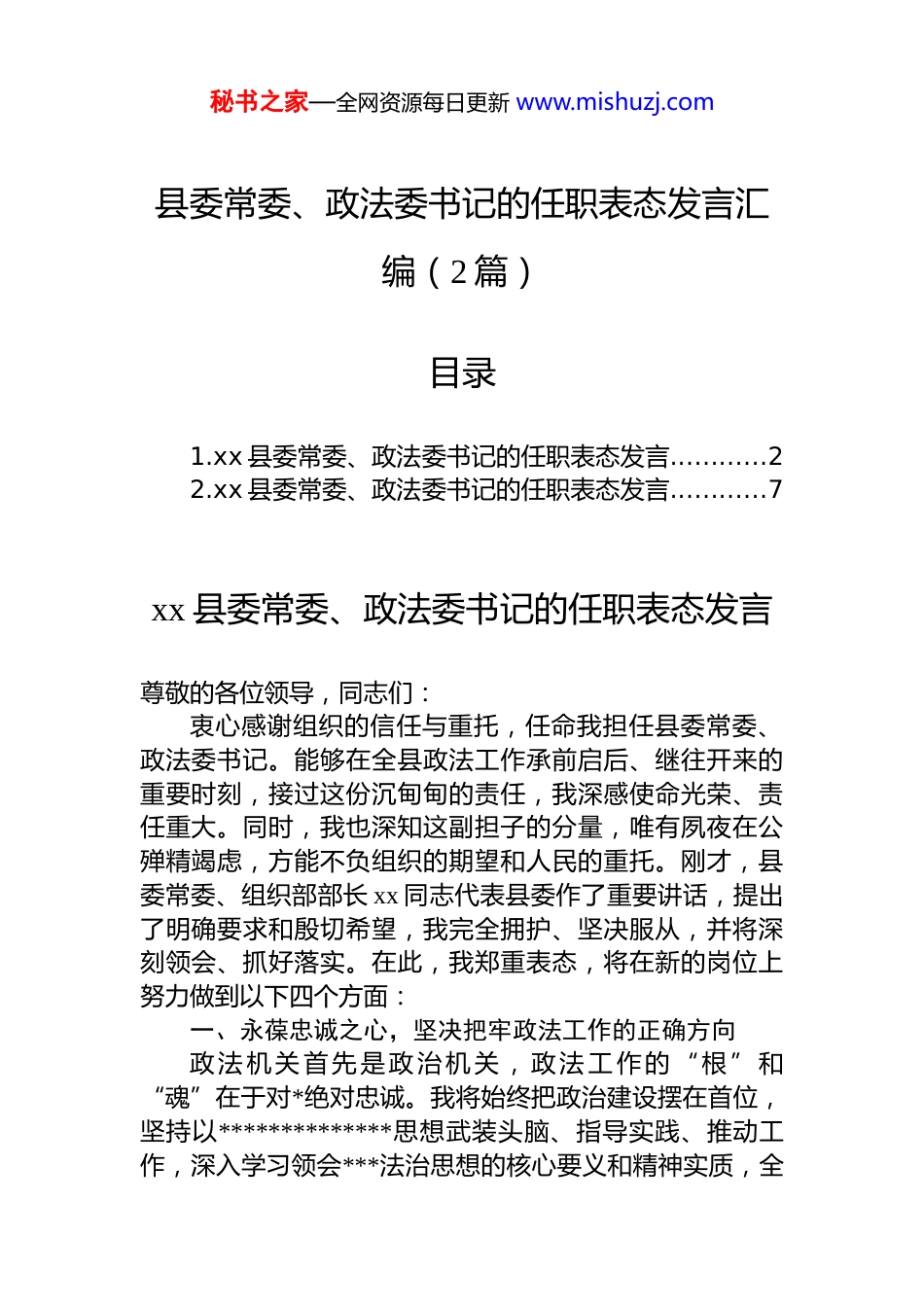秘书之家—全网资源每日更新 www.mishuzj.com县委常委、政法委书记的任职表态发言汇编(2 篇)目录1.xx 县委常委、政法委书记的任职表态发言............22.xx 县委常委、政法委书记的任职表态发言............7xx 县委常委、政法委书记的任职表态发言尊敬的各位领导,同志们:衷心感谢组织的信任与重托,任命我担任县委常委、政法委书记。能够在全县政法工作承前启后、继往开来的重要时刻,接过这份沉甸甸的责任,我深感使命光荣、责任重大。同时,我也深知这副担子的分量,唯有夙夜在公殚精竭虑,方能不负组织的期望和人民的重托。刚才,县委常委、组织部部长 xx 同志代表县委作了重要讲话,提出了明确要求和殷切希望,我完全拥护、坚决服从,并将深刻领会、抓好落实。在此,我郑重表态,将在新的岗位上努力做到以下四个方面:一、永葆忠诚之心,坚决把牢政法工作的正确方向政法机关首先是政治机关,政法工作的“根”和“魂”在于对*绝对忠诚。我将始终把政治建设摆在首位,坚持以**************思想武装头脑、指导实践、推动工作,深入学习领会***法治思想的核心要义和精神实质,全秘书之家—全网资源每日更新 www.mishuzj.com面贯彻落实《中国共产*政法工作条例》及省委《实施细则》,不断提高政治判断力、政治领悟力、政治执行力。我将时刻心怀“国之大者”,自觉把政法工作置于全县发展大局中去思考、去谋划、去推进,确保中央的大政方针和省委、市委、县委的各项决策部署在全县政法系统不折不扣地贯彻执行,做到闻令而动、听令而行,确保“刀把子”始终牢牢掌握在*和人民手中。我将带头维护班子团结,像爱护眼睛一样爱护团结,自觉接受县委领导,主动加强与人大、政府、政协的沟通协调,虚心向老领导、老同志和广大干警学习,尽快熟悉情况、进入角色,凝聚起推动政法工作高质量发展的强大合力。二、恪守担当之责,全力护航全县经济社会高质量发展发展是第一要务,稳定是第一责任。当前,我县正处在推动高质量发展的关键时期,改革发展稳定任务艰巨繁重。作为政法委书记,我将牢固树立和践行总体国家安全观,把维护国家政治安全放在首位,严密防范、严厉打击各类渗透破坏颠覆活动,坚决守住政治安全底线。我将紧紧围绕县委、县政府的中心工作,找准政法工作服务保障大局的切入点和着力点,全力以赴防风险、保安全、护稳定、促发展。要聚焦群众深恶痛绝的违法犯罪,常态化推进扫黑除恶斗争,严厉打击电信网络诈骗、黄赌毒、盗抢骗等突出违法犯罪,不断增强人民群众的安全感。要坚持和发展新时代“枫桥经验”,健全完善矛盾纠纷多元化解机制,推动重心下移、力量下沉、保障下倾,努力把各类矛盾风险防范在源头、化解在基层、消灭在萌芽状态。特别要关注像古贤工程这样的“国之重器”和全县重点项目建设,主动提供精准化、法治化的服务保障,依法维护项目建设秩序和市场主体合法权益,努力营造稳定公平透明可预期的法治化营商环境。面对涉法涉诉信访积案、复杂疑难问题,我将敢于担当、勇于碰硬,深入一线调查研究秘书之家—全网资源每日更新 www.mishuzj.com亲自协调督办,拿出实招硬招,啃下“硬骨头”,接过“烫手山芋”,以解决问题的实际成效取信于民。三、秉持公正之尺,努力让人民群众感受到公平正义公平正义是法治的生命线,也是政法工作的核心价值追求。我将始终坚持以人民为中心的发展思想,把人民群众对平安正义的向往作为我们的奋斗目标。要深化司法体制改革,全面准确落实司法责任制,加强执法司法监督制约,规范执法司法权力运行,努力让人民群众在每一个司法案件、每一次执法活动中都能感受到公平正义。要着力解决人民群众反映强烈的执法司法突出问题,持续整治有案不立、压案不查、有罪不究,以及违规违法“减假暂”等顽瘴痼疾,不断提升执法司法公信力。要持续深化政法公共服务体系建设,优化便民利民措施,畅通和规范群众诉求表达、利益协调、权益保障通道,用好国家司法救助制度,传递好*和政府的温暖。要带头尊法学法守法用法,提高运用法治思维和法治方式深化改革、推动发展、化解矛盾、维护稳定的能力,引导全县政法干警牢固树立法治信仰,坚守...