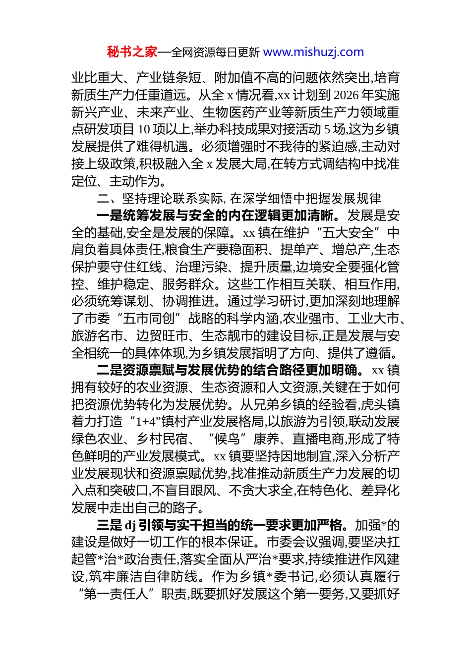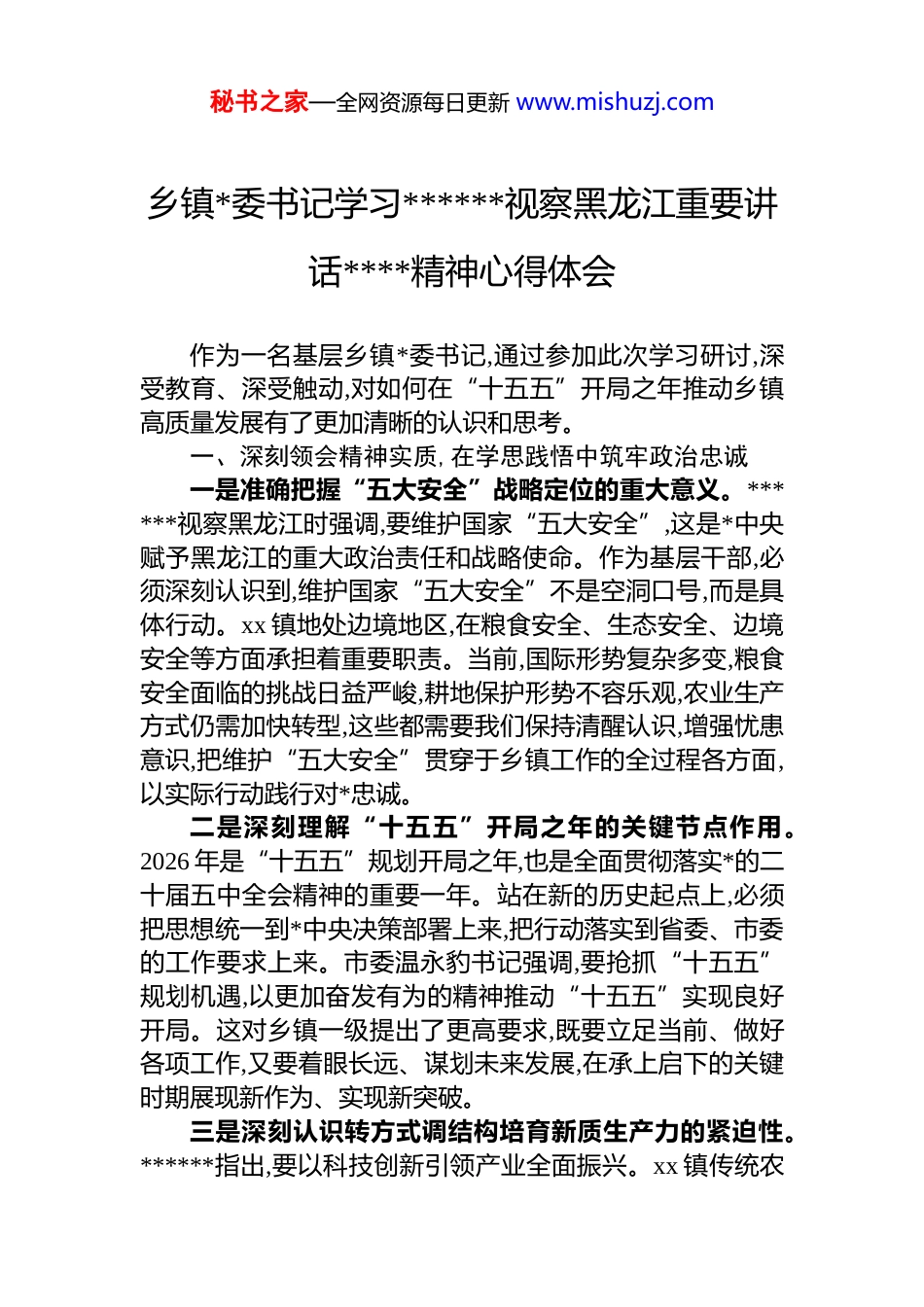 秘书之家—全网资源每日更新 www.mishuzj.com乡镇*委书记学习******视察黑龙江重要讲话****精神心得体会作为一名基层乡镇*委书记,通过参加此次学习研讨,深受教育、深受触动,对如何在“十五五”开局之年推动乡镇高质量发展有了更加清晰的认识和思考。一、深刻领会精神实质,在学思践悟中筑牢政治忠诚一是准确把握“五大安全”战略定位的重大意义。******视察黑龙江时强调,要维护国家“五大安全”,这是*中央赋予黑龙江的重大政治责任和战略使命。作为基层干部,必须深刻认识到,维护国家“五大安全”不是空洞口号,而是具体行动。xx 镇地处边境地区,在粮食安全、生态安全、边境安全等方面承担着重要职责。当前,国际形势复杂多变,粮食安全面临的挑战日益严峻,耕地保护形势不容乐观,农业生产方式仍需加快转型,这些都需要我们保持清醒认识,增强忧患意识,把维护“五大安全”贯穿于乡镇工作的全过程各方面,以实际行动践行对*忠诚。二是深刻理解“十五五”开局之年的关键节点作用。2026 年是“十五五”规划开局之年,也是全面贯彻落实*的二十届五中全会精神的重要一年。站在新的历史起点上,必须把思想统一到*中央决策部署上来,把行动落实到省委、市委的工作要求上来。市委温永豹书记强调,要抢抓“十五五”规划机遇,以更加奋发有为的精神推动“十五五”实现良好开局。这对乡镇一级提出了更高要求,既要立足当前、做好各项工作,又要着眼长远、谋划未来发展,在承上启下的关键时期展现新作为、实现新突破。三是深刻认识转方式调结构培育新质生产力的紧迫性。******指出,要以科技创新引领产业全面振兴。xx 镇传统农秘书之家—全网资源每日更新 www.mishuzj.com业比重大、产业链条短、附加值不高的问题依然突出,培育新质生产力任重道远。从全 x 情况看,xx 计划到 2026 年实施新兴产业、未来产业、生物医药产业等新质生产力领域重点研发项目 10 项以上,举办科技成果对接活动 5 场,这为乡镇发展提供了难得机遇。必须增强时不我待的紧迫感,主动对接上级政策,积极融入全 x 发展大局,在转方式调结构中找准定位、主动作为。二、坚持理论联系实际,在深学细悟中把握发展规律一是统筹发展与安全的内在逻辑更加清晰。发展是安全的基础,安全是发展的保障。xx 镇在维护“五大安全”中肩负着具体责任,粮食生产要稳面积、提单产、增总产,生态保护要守住红线、治理污染、提升质量,边境安全要强化管控、维护稳定、服务群众。这些工作相互关联、相互作用,必须统筹谋划、协调推进。通过学习研讨,更加深刻地理解了市委“五市同创”战略的科学内涵,农业强市、工业大市、旅游名市、边贸旺市、生态靓市的建设目标,正是发展与安全相统一的具体体现,为乡镇发展指明了方向、提供了遵循。二是资源禀赋与发展优势的结合路径更加明确。xx 镇拥有较好的农业资源、生态资源和人文资源,关键在于如何把资源优势转化为发展优势。从兄弟乡镇的经验看,虎头镇着力打造“1+4”镇村产业发展格局,以旅游为引领,联动发展绿色农业、乡村民宿、“候鸟”康养、直播电商,形成了特色鲜明的产业发展模式。xx 镇要坚持因地制宜,深入分析产业发展现状和资源禀赋优势,找准推动新质生产力发展的切入点和突破口,不盲目跟风、不贪大求全,在特色化、差异化发展中走出自己的路子。三是 dj 引领与实干担当的统一要求更加严格。加强*的建设是做好一切工作的根本保证。市委会议强调,要坚决扛起管*治*政治责任,落实全面从严治*要求,持续推进作风建设,筑牢廉洁自律防线。作为乡镇*委书记,必须认真履行“第一责任人”职责,既要抓好发展这个第一要务,又要抓好秘书之家—全网资源每日更新 www.mishuzj.comdj 这个最大政绩,推动 dj 工作与中心工作深度融合。当前,xx镇面临的发展任务艰巨繁重,更要以高质量 dj 引领推动高质量发展,在攻坚克难中检验*员干部的能力担当,在真抓实干中赢得群众的信任支持。三、聚焦重点任务抓落实,在担当实干中开创发展新局一是锚定粮食安全底线,推动现代农业提质增效。要把保障粮食安全作为首要任务,严格落实耕地保护制度,坚决遏制耕地“非农化”“非粮化”,确保粮食播种面积稳定。积极对接上级农业科技推广项目,...