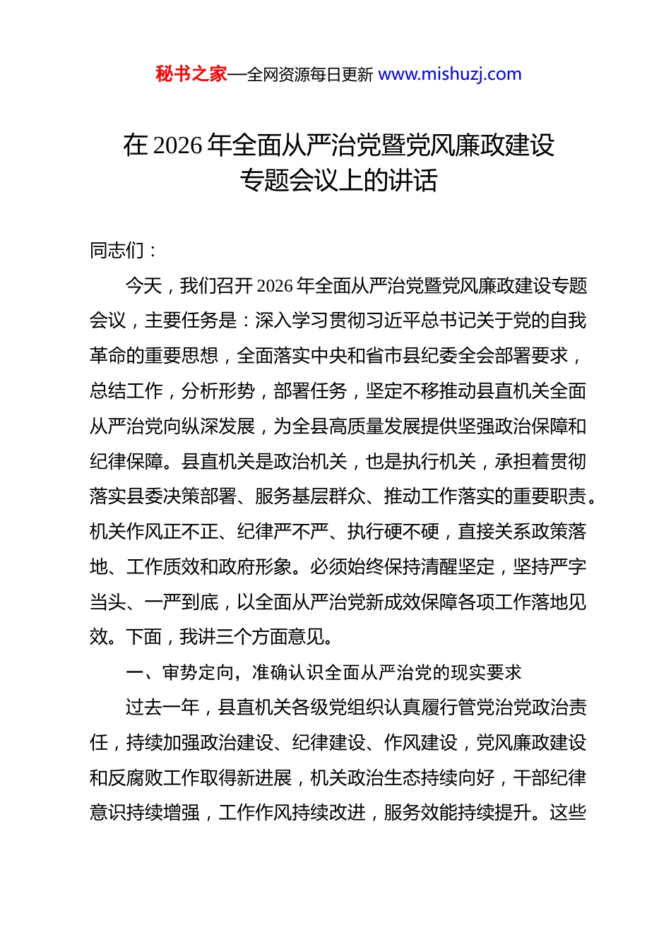 秘书之家—全网资源每日更新 www.mishuzj.com在 2026 年全面从严治党暨党风廉政建设专题会议上的讲话 同志们:今天,我们召开 2026 年全面从严治党暨党风廉政建设专题会议,主要任务是:深入学习贯彻习近平总书记关于党的自我革命的重要思想,全面落实中央和省市县纪委全会部署要求,总结工作,分析形势,部署任务,坚定不移推动县直机关全面从严治党向纵深发展,为全县高质量发展提供坚强政治保障和纪律保障。县直机关是政治机关,也是执行机关,承担着贯彻落实县委决策部署、服务基层群众、推动工作落实的重要职责。机关作风正不正、纪律严不严、执行硬不硬,直接关系政策落地、工作质效和政府形象。必须始终保持清醒坚定,坚持严字当头、一严到底,以全面从严治党新成效保障各项工作落地见效。下面,我讲三个方面意见。一、审势定向,准确认识全面从严治党的现实要求过去一年,县直机关各级党组织认真履行管党治党政治责任,持续加强政治建设、纪律建设、作风建设,党风廉政建设和反腐败工作取得新进展,机关政治生态持续向好,干部纪律意识持续增强,工作作风持续改进,服务效能持续提升。这些秘书之家—全网资源每日更新 www.mishuzj.com成效值得肯定。同时也要看到,全面从严治党没有休止符。当前一些问题虽然表现在具体工作中,但根子仍在思想认识、责任落实、作风状态和制度执行上。对此,必须保持清醒、直面问题、精准施策。(一)政治站位还需再高县直机关首先是政治机关。讲政治,关键看贯彻党中央决策部署是否坚决,落实县委工作要求是否到位,履职尽责是否体现政治标准。从实际情况看,有的对政治机关属性认识还不够深,把业务工作与政治责任割裂开来;有的学习传达多、结合转化少,表态多、落实少;有的抓工作停留在事务层面,对背后的政治要求、政治责任把握不够精准。这些问题表面看是认识问题,实质是政治站位问题。站位不高,就容易只见业务、不见政治;认识不深,就容易只重程序、不重效果;把握不准,就容易在执行上打折扣、搞变通。必须把讲政治贯穿机关工作全过程。(二)责任链条还需再紧全面从严治党,关键在责任落实。责任压得紧不紧,决定工作落得实不实。从现实情况看,有的党组织研究业务多,研究全面从严治党少;有的主要负责同志履行第一责任人责任还不够有力,对日常监督和教育提醒抓得不细;有的班子成员秘书之家—全网资源每日更新 www.mishuzj.com“一岗双责”落实不够到位,对分管领域廉政风险和作风问题抓得不紧;有的股室负责人责任意识不强,对本科室、本岗位监督管理还比较薄弱。责任不清,容易出现空档;责任不实,容易导致压力递减;责任不严,容易造成监管缺位。必须把党组主体责任、书记第一责任人责任、班子成员“一岗双责”、股室直接责任、纪检监督责任贯通起来,形成完整责任链条。(三)作风状态还需再实机关作风连着执行力,连着公信力,连着群众满意度。县直机关作风如何,群众感受最直接。从监督掌握情况看,少数单位和干部仍存在一些突出问题。有的以会议落实会议、以文件落实文件,部署多、落地少;有的满足于转文件、报材料、留痕迹,对实际效果盯得不紧;有的工作标准不高,满足于一般化推进;有的责任意识不强,遇到问题绕着走、往后拖;有的形式主义、官僚主义问题仍然不同程度存在。作风不实,工作就容易落空;执行不力,落实就容易走样;服务不优,群众就容易失望。必须把作风建设抓紧抓实,持续纠治顽瘴痼疾。(四)制度执行还需再严纪律约束靠制度,风险防控靠制度。县直机关虽然不一定掌握大量资金资源,但在行政审批、资金分配、项目管理、采购管理、资产管理、执法检查、评先评优、选人用人、窗口服秘书之家—全网资源每日更新 www.mishuzj.com务等方面,同样存在风险点。从实际情况看,有的制度针对性不强;有的流程明确了,但执行不严;有的管理要求提了,但监督跟进不够;有的对小事小节重视不够,对苗头性问题缺乏警醒。很多问题不是没有制度,而是制度没有真正执行到位。必须把严守制度、严格程序、严密监督贯穿权力运行全过程,切实堵塞漏洞、防控风险。二、聚焦重点,纵深推进全面从严治党各项任...