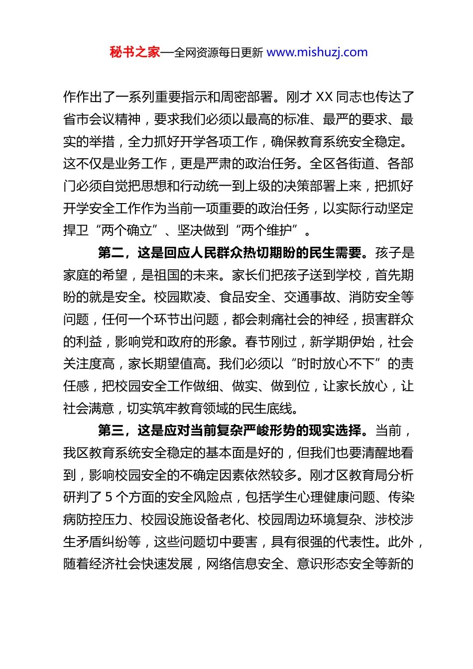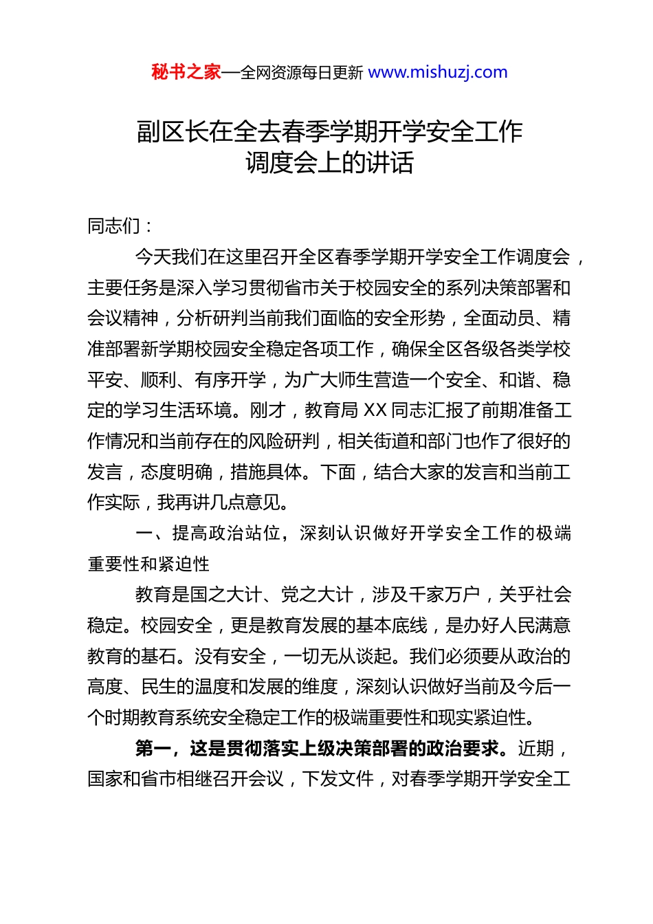 秘书之家—全网资源每日更新 www.mishuzj.com副区长在全去春季学期开学安全工作调度会上的讲话同志们:今天我们在这里召开全区春季学期开学安全工作调度会,主要任务是深入学习贯彻省市关于校园安全的系列决策部署和会议精神,分析研判当前我们面临的安全形势,全面动员、精准部署新学期校园安全稳定各项工作,确保全区各级各类学校平安、顺利、有序开学,为广大师生营造一个安全、和谐、稳定的学习生活环境。刚才,教育局 XX 同志汇报了前期准备工作情况和当前存在的风险研判,相关街道和部门也作了很好的发言,态度明确,措施具体。下面,结合大家的发言和当前工作实际,我再讲几点意见。一、提高政治站位,深刻认识做好开学安全工作的极端重要性和紧迫性教育是国之大计、党之大计,涉及千家万户,关乎社会稳定。校园安全,更是教育发展的基本底线,是办好人民满意教育的基石。没有安全,一切无从谈起。我们必须要从政治的高度、民生的温度和发展的维度,深刻认识做好当前及今后一个时期教育系统安全稳定工作的极端重要性和现实紧迫性。第一,这是贯彻落实上级决策部署的政治要求。近期,国家和省市相继召开会议,下发文件,对春季学期开学安全工秘书之家—全网资源每日更新 www.mishuzj.com作作出了一系列重要指示和周密部署。刚才 XX 同志也传达了省市会议精神,要求我们必须以最高的标准、最严的要求、最实的举措,全力抓好开学各项工作,确保教育系统安全稳定。这不仅是业务工作,更是严肃的政治任务。全区各街道、各部门必须自觉把思想和行动统一到上级的决策部署上来,把抓好开学安全工作作为当前一项重要的政治任务,以实际行动坚定捍卫“两个确立”、坚决做到“两个维护”。第二,这是回应人民群众热切期盼的民生需要。孩子是家庭的希望,是祖国的未来。家长们把孩子送到学校,首先期盼的就是安全。校园欺凌、食品安全、交通事故、消防安全等问题,任何一个环节出问题,都会刺痛社会的神经,损害群众的利益,影响党和政府的形象。春节刚过,新学期伊始,社会关注度高,家长期望值高。我们必须以“时时放心不下”的责任感,把校园安全工作做细、做实、做到位,让家长放心,让社会满意,切实筑牢教育领域的民生底线。第三,这是应对当前复杂严峻形势的现实选择。当前,我区教育系统安全稳定的基本面是好的,但我们也要清醒地看到,影响校园安全的不确定因素依然较多。刚才区教育局分析研判了 5 个方面的安全风险点,包括学生心理健康问题、传染病防控压力、校园设施设备老化、校园周边环境复杂、涉校涉生矛盾纠纷等,这些问题切中要害,具有很强的代表性。此外,随着经济社会快速发展,网络信息安全、意识形态安全等新的秘书之家—全网资源每日更新 www.mishuzj.com挑战也不断涌现。春季又是各类安全事故易发、多发的时期,流感等呼吸道传染病高发,气温回升但寒潮偶尔来袭,用火用电用气安全风险依然存在。我们必须时刻保持清醒头脑,增强忧患意识,树牢底线思维,把困难估计得更充分一些,把风险思考得更深入一些,切实担负起维护校园安全稳定的政治责任。二、聚焦关键环节,筑牢从“入校”到“离校”的全链条安全防线做好开学安全工作,必须坚持问题导向和目标导向,紧盯重点领域和关键环节,实施精细化、闭环化管理。我认为,要重点把好“三道关口”,构建校内校外联动、人防物防技防结合的全方位防护体系。(一)严把“入校关”,确保源头管控无疏漏。“入校关”是安全的第一道屏障,必须扎紧篱笆,严防风险输入。一是严格人员健康监测与管理。虽然当前疫情防控已进入新阶段,但对常见传染病的防控不能松懈。卫健局、教育局要指导学校严格落实师生健康监测制度,做好开学前师生健康状况摸排,特别是要做好春季高发传染病的预防知识宣传。对有发热、咳嗽等症状的师生,要建立台账,督促及时就医,暂缓返校,坚决防止带病入校、在校传播。二是强化校门及周边安全管理。公安分局要牵头,加大上下学重点时段、校园周边重点路段的警力部署和巡逻防控力秘书之家—全网资源每日更新 www.mishuzj.com度,提高见警率、管事率。要指导学校配齐配强专职保安员,加强业...