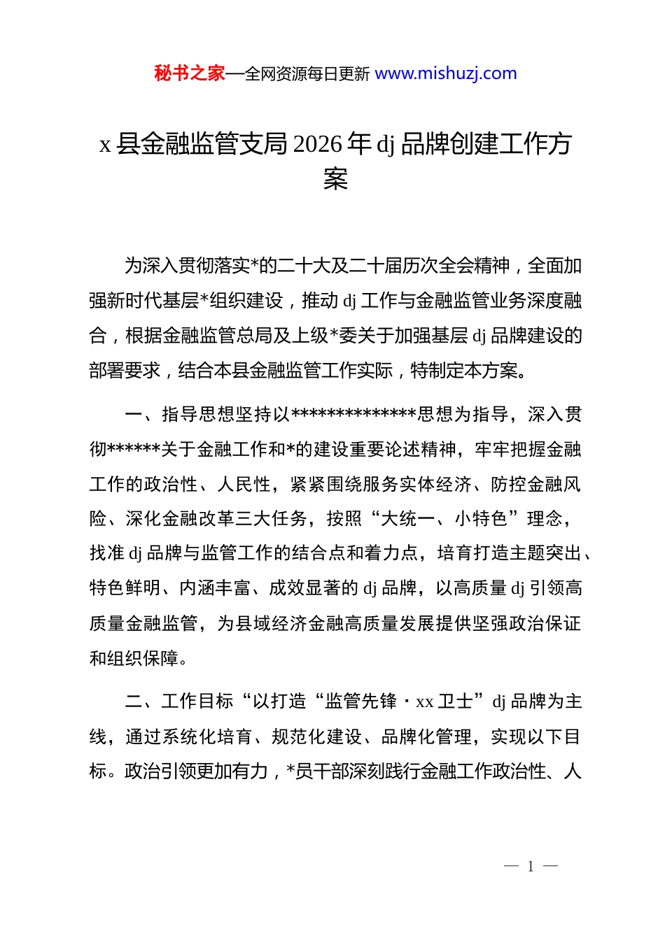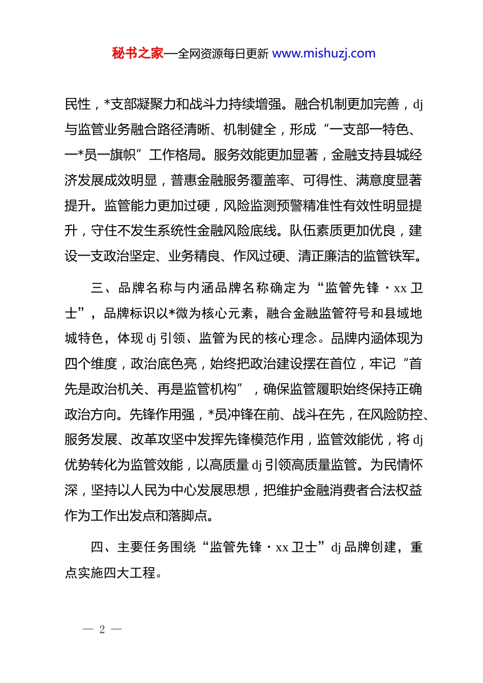 秘书之家—全网资源每日更新 www.mishuzj.comx 县金融监管支局 2026 年 dj 品牌创建工作方案为深入贯彻落实*的二十大及二十届历次全会精神,全面加强新时代基层*组织建设,推动 dj 工作与金融监管业务深度融合,根据金融监管总局及上级*委关于加强基层 dj 品牌建设的部署要求,结合本县金融监管工作实际,特制定本方案。一、指导思想坚持以**************思想为指导,深入贯彻******关于金融工作和*的建设重要论述精神,牢牢把握金融工作的政治性、人民性,紧紧围绕服务实体经济、防控金融风险、深化金融改革三大任务,按照“大统一、小特色”理念,找准 dj 品牌与监管工作的结合点和着力点,培育打造主题突出、特色鲜明、内涵丰富、成效显著的 dj 品牌,以高质量 dj 引领高质量金融监管,为县域经济金融高质量发展提供坚强政治保证和组织保障。二、工作目标“以打造“监管先锋·xx 卫士”dj 品牌为主线,通过系统化培育、规范化建设、品牌化管理,实现以下目标。政治引领更加有力,*员干部深刻践行金融工作政治性、人— 1 —秘书之家—全网资源每日更新 www.mishuzj.com民性,*支部凝聚力和战斗力持续增强。融合机制更加完善,dj与监管业务融合路径清晰、机制健全,形成“一支部一特色、一*员一旗帜”工作格局。服务效能更加显著,金融支持县城经济发展成效明显,普惠金融服务覆盖率、可得性、满意度显著提升。监管能力更加过硬,风险监测预警精准性有效性明显提升,守住不发生系统性金融风险底线。队伍素质更加优良,建设一支政治坚定、业务精良、作风过硬、清正廉洁的监管铁军。三、品牌名称与内涵品牌名称确定为“监管先锋·xx 卫士”,品牌标识以*微为核心元素,融合金融监管符号和县域地城特色,体现 dj 引领、监管为民的核心理念。品牌内涵体现为四个维度,政治底色亮,始终把政治建设摆在首位,牢记“首先是政治机关、再是监管机构”,确保监管履职始终保持正确政治方向。先锋作用强,*员冲锋在前、战斗在先,在风险防控、服务发展、改革攻坚中发挥先锋模范作用,监管效能优,将 dj优势转化为监管效能,以高质量 dj 引领高质量监管。为民情怀深,坚持以人民为中心发展思想,把维护金融消费者合法权益作为工作出发点和落脚点。四、主要任务围绕“监管先锋·xx 卫士”dj 品牌创建,重点实施四大工程。— 2 —秘书之家—全网资源每日更新 www.mishuzj.com(一)实施“铸魂领航”工程,在政治淬炼中促融合。打造“旗帜领航·初心向*”子品牌,引导*员干部牢记政治定位、站稳政治立场。强化理论武装,依托“三会一课”、主题*日等—2—载体,深入学习******重要讲话特别是关于经济金融工作的****批示精神,引导*员干部在学思践悟中自觉用*的创新理论武装头脑、指导实践、推动工作。深化红色教育,组织参观红色教育基地、开展纪念抗战胜利 80 周年主题活动,引导*员干部铭记历史、传承基因、坚定信念。创新学习形式,开展“微*课”评选、…“读书分享会”、“青年*员讲*史”等活动,提升学习教育的针对性和实效性。(二)实施“攻坚先锋”工程,在履职担当中促融合。紧扣监管主责主业,打造四个特色子品牌,充分发挥 dj 品牌的示范导向和辐射带动作用。1.打造“数智先锋·监管引擎”子品牌,将 dj 融入监管数智化创新中。组建*员数字攻坚先锋队,深化对监管科技的研究应用,自主研究设置机构类风险预警指标和行业类风险监测指标,提升风险监测预警的精准性、有效性。探索运用大数据、人工智能等技术手段,推动监管工作从“人防”向“技防”转变,实现风险早识别、早预警、早处置。— 3 —秘书之家—全网资源每日更新 www.mishuzj.com2.打造“风险卫士·安全屏障”子品牌,将 dj 融入守牢金融风险底线中。将中小银行改革化险作为政治任务,作为检验 dj成效的“试金石”。引领*员干部冲锋在攻坚前沿一线,全力推动中小金融机构化险稳中有进、农信改革破冰突围、村镇银行靶向排雷。建立健全风险监测预警机制、应急处置机制、责任道究机制,确保风险防得住、控得好、化得了。3.打造“惠企先锋·发展助力”子品牌,将 dj 融入服务地方...
