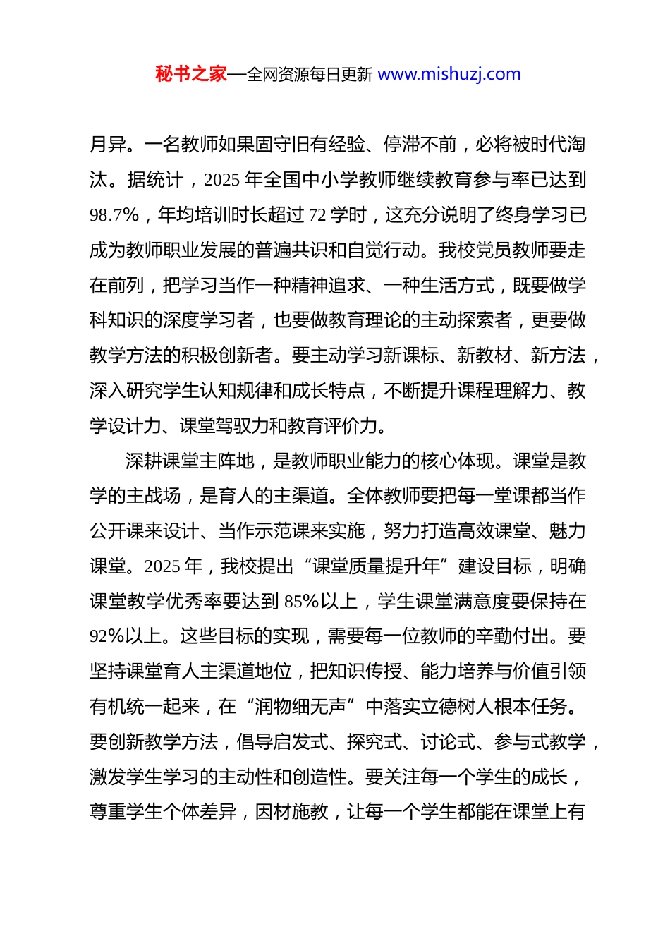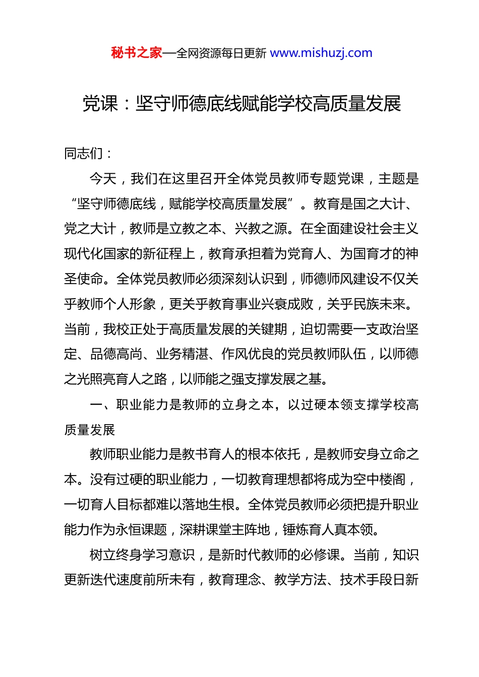 秘书之家—全网资源每日更新 www.mishuzj.com党课:坚守师德底线赋能学校高质量发展 同志们:今天,我们在这里召开全体党员教师专题党课,主题是“坚守师德底线,赋能学校高质量发展”。教育是国之大计、党之大计,教师是立教之本、兴教之源。在全面建设社会主义现代化国家的新征程上,教育承担着为党育人、为国育才的神圣使命。全体党员教师必须深刻认识到,师德师风建设不仅关乎教师个人形象,更关乎教育事业兴衰成败,关乎民族未来。当前,我校正处于高质量发展的关键期,迫切需要一支政治坚定、品德高尚、业务精湛、作风优良的党员教师队伍,以师德之光照亮育人之路,以师能之强支撑发展之基。一、职业能力是教师的立身之本,以过硬本领支撑学校高质量发展教师职业能力是教书育人的根本依托,是教师安身立命之本。没有过硬的职业能力,一切教育理想都将成为空中楼阁,一切育人目标都难以落地生根。全体党员教师必须把提升职业能力作为永恒课题,深耕课堂主阵地,锤炼育人真本领。树立终身学习意识,是新时代教师的必修课。当前,知识更新迭代速度前所未有,教育理念、教学方法、技术手段日新秘书之家—全网资源每日更新 www.mishuzj.com月异。一名教师如果固守旧有经验、停滞不前,必将被时代淘汰。据统计,2025 年全国中小学教师继续教育参与率已达到98.7%,年均培训时长超过 72 学时,这充分说明了终身学习已成为教师职业发展的普遍共识和自觉行动。我校党员教师要走在前列,把学习当作一种精神追求、一种生活方式,既要做学科知识的深度学习者,也要做教育理论的主动探索者,更要做教学方法的积极创新者。要主动学习新课标、新教材、新方法,深入研究学生认知规律和成长特点,不断提升课程理解力、教学设计力、课堂驾驭力和教育评价力。深耕课堂主阵地,是教师职业能力的核心体现。课堂是教学的主战场,是育人的主渠道。全体教师要把每一堂课都当作公开课来设计、当作示范课来实施,努力打造高效课堂、魅力课堂。2025 年,我校提出“课堂质量提升年”建设目标,明确课堂教学优秀率要达到 85%以上,学生课堂满意度要保持在92%以上。这些目标的实现,需要每一位教师的辛勤付出。要坚持课堂育人主渠道地位,把知识传授、能力培养与价值引领有机统一起来,在“润物细无声”中落实立德树人根本任务。要创新教学方法,倡导启发式、探究式、讨论式、参与式教学,激发学生学习的主动性和创造性。要关注每一个学生的成长,尊重学生个体差异,因材施教,让每一个学生都能在课堂上有秘书之家—全网资源每日更新 www.mishuzj.com所收获、有所进步。拥抱数字时代变革,提升信息技术应用能力。人工智能技术正在深刻改变教育教学形态,为教师专业发展开辟了新的空间。数据显示,2025 年全国已有超过 15 万所中小学开展了人工智能赋能教学实践探索,AI 辅助教学工具在备课、授课、作业批改、学情分析等环节的应用覆盖率达到 67%。我们要主动适应这一趋势,积极探索人工智能技术与学科教学的深度融合,利用 AI 赋能备课效率提升、学情精准分析、个性化学习支持。**市教育科学研究院研究表明,合理运用 AI 教学助手的教师,备课效率平均提升 60%以上,作业批改时间减少 70%,课堂互动率提高 45%。党员教师要率先垂范,主动学习掌握智能教学工具,提升数字素养,在技术与教学的融合创新中走在前列。同时要清醒认识到,技术是辅助手段,教师的育人智慧、人格魅力是不可替代的,要防止技术依赖,保持教育温度。完善专业发展机制,构建教师成长支持体系。学校要建立健全教师专业发展档案,实行“一人一档”动态管理,定期开展教学能力评估,形成个性化发展方案。2025 年,我校已启动实施“名师培养工程”和“青年教师成长计划”,计划用三年时间培养市级骨干教师 30 名、学科带头人 15 名、教学名师 8名。要充分发挥党员教师的示范引领作用,建立“党员名师工秘书之家—全网资源每日更新 www.mishuzj.com作室”,开展“青蓝结对”帮扶活动,促进老中青教师共同成长。要积极参加各级各类教学竞赛、课题研究、学术交流活动,在实践锻炼中提升能力、在科研反思中深化认识...