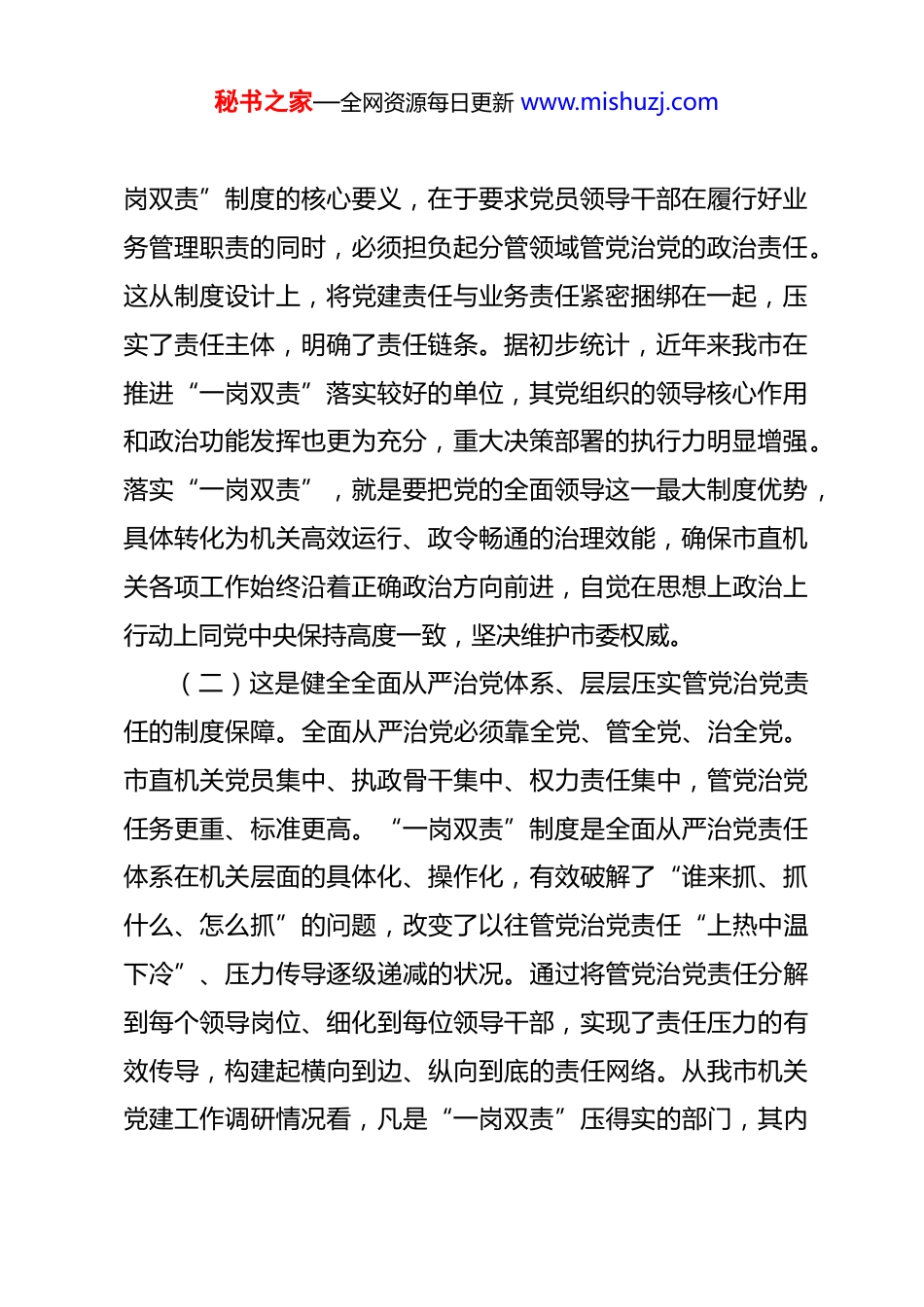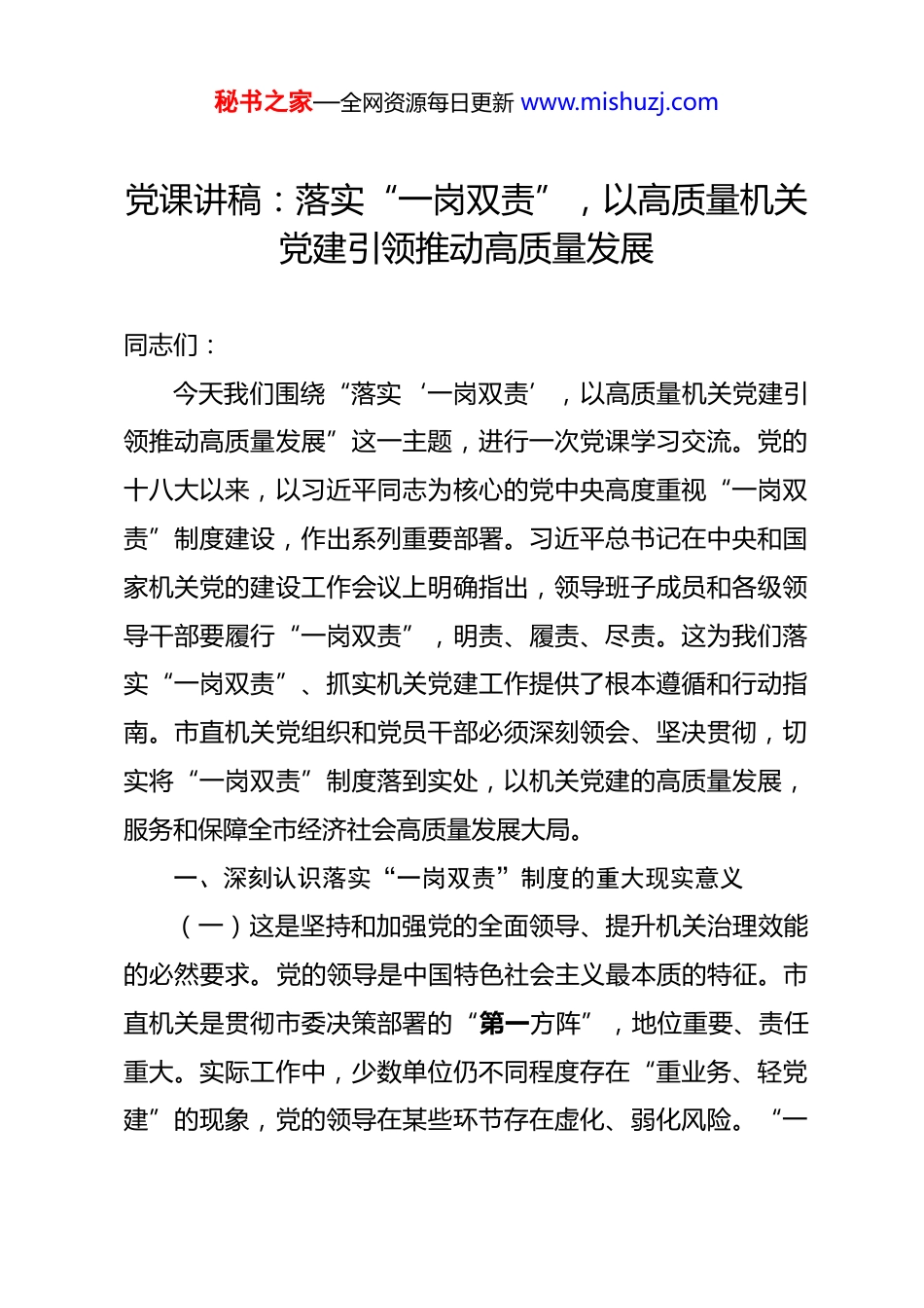 秘书之家—全网资源每日更新 www.mishuzj.com党课讲稿:落实“一岗双责”,以高质量机关党建引领推动高质量发展 同志们:今天我们围绕“落实‘一岗双责’,以高质量机关党建引领推动高质量发展”这一主题,进行一次党课学习交流。党的十八大以来,以习近平同志为核心的党中央高度重视“一岗双责”制度建设,作出系列重要部署。习近平总书记在中央和国家机关党的建设工作会议上明确指出,领导班子成员和各级领导干部要履行“一岗双责”,明责、履责、尽责。这为我们落实“一岗双责”、抓实机关党建工作提供了根本遵循和行动指南。市直机关党组织和党员干部必须深刻领会、坚决贯彻,切实将“一岗双责”制度落到实处,以机关党建的高质量发展,服务和保障全市经济社会高质量发展大局。一、深刻认识落实“一岗双责”制度的重大现实意义(一)这是坚持和加强党的全面领导、提升机关治理效能的必然要求。党的领导是中国特色社会主义最本质的特征。市直机关是贯彻市委决策部署的“第一方阵”,地位重要、责任重大。实际工作中,少数单位仍不同程度存在“重业务、轻党建”的现象,党的领导在某些环节存在虚化、弱化风险。“一秘书之家—全网资源每日更新 www.mishuzj.com岗双责”制度的核心要义,在于要求党员领导干部在履行好业务管理职责的同时,必须担负起分管领域管党治党的政治责任。这从制度设计上,将党建责任与业务责任紧密捆绑在一起,压实了责任主体,明确了责任链条。据初步统计,近年来我市在推进“一岗双责”落实较好的单位,其党组织的领导核心作用和政治功能发挥也更为充分,重大决策部署的执行力明显增强。落实“一岗双责”,就是要把党的全面领导这一最大制度优势,具体转化为机关高效运行、政令畅通的治理效能,确保市直机关各项工作始终沿着正确政治方向前进,自觉在思想上政治上行动上同党中央保持高度一致,坚决维护市委权威。(二)这是健全全面从严治党体系、层层压实管党治党责任的制度保障。全面从严治党必须靠全党、管全党、治全党。市直机关党员集中、执政骨干集中、权力责任集中,管党治党任务更重、标准更高。“一岗双责”制度是全面从严治党责任体系在机关层面的具体化、操作化,有效破解了“谁来抓、抓什么、怎么抓”的问题,改变了以往管党治党责任“上热中温下冷”、压力传导逐级递减的状况。通过将管党治党责任分解到每个领导岗位、细化到每位领导干部,实现了责任压力的有效传导,构建起横向到边、纵向到底的责任网络。从我市机关党建工作调研情况看,凡是“一岗双责”压得实的部门,其内秘书之家—全网资源每日更新 www.mishuzj.com部政治生态普遍更加清朗,党员干部的纪律规矩意识更强,全面从严治党呈现向纵深发展、向基层延伸的良好态势。(三)这是推动机关党建和业务工作深度融合、激发干事创业内生动力的关键路径。习近平总书记强调,只有围绕中心、建设队伍、服务群众,推动党建和业务深度融合,机关党建工作才能找准定位。市直机关业务门类多、专业性强,如果党建与业务“两张皮”,党建工作就容易陷入“自说自话”“自我循环”的窘境,业务工作也可能失去政治引领和方向保障。“一岗双责”制度要求党建工作与业务工作同谋划、同部署、同推进、同考核,这就倒逼党员领导干部在谋划推进业务工作时,必须同步思考如何加强政治引领、如何发挥党组织战斗堡垒作用和党员先锋模范作用、如何抓好作风纪律建设、如何防范廉政风险。例如,我市在推进重大项目、优化营商环境、服务科技创新等中心工作中,要求相关部门的领导干部必须将党建工作要求嵌入业务流程,用党建凝聚共识、破解难题、锻造队伍,取得了明显成效。实践证明,落实“一岗双责”,能有效推动党建工作从“围绕型”向“融入型”转变,从“务虚”向“务实”转变,真正把党的政治优势、组织优势转化为发展优势。(四)这是强化权力运行监督制约、有效防范化解各类风秘书之家—全网资源每日更新 www.mishuzj.com险的重要举措。市直机关各部门掌握着一定的政策制定、行政审批、资金分配、行政执法等权力,廉政风险相对集中。权力运行的风险,往往源于权责不匹配、监督不到位。“一岗双责...
