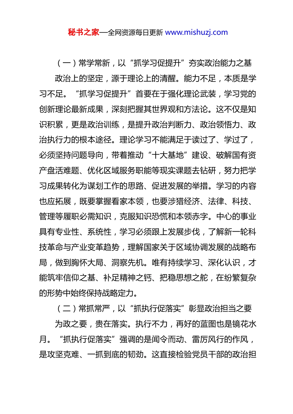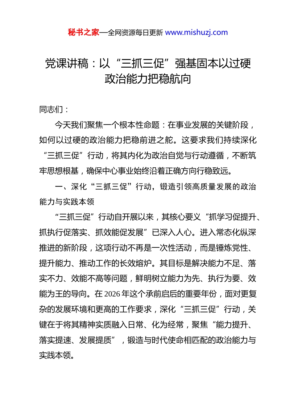 秘书之家—全网资源每日更新 www.mishuzj.com党课讲稿:以“三抓三促”强基固本以过硬政治能力把稳航向 同志们:今天我们聚焦一个根本性命题:在事业发展的关键阶段,如何以过硬的政治能力把稳前进之舵。这要求我们持续深化“三抓三促”行动,将其内化为政治自觉与行动遵循,不断筑牢思想根基,确保中心事业始终沿着正确方向行稳致远。一、深化“三抓三促”行动,锻造引领高质量发展的政治能力与实践本领“三抓三促”行动自开展以来,其核心要义“抓学习促提升、抓执行促落实、抓效能促发展”已深入人心。进入常态化纵深推进的新阶段,这项行动不再是一次性活动,而是锤炼党性、提升能力、推动工作的长效熔炉。其目标是解决能力不足、落实不力、效能不高等问题,鲜明树立能力为先、执行为要、效能为王的导向。在 2026 年这个承前启后的重要年份,面对更复杂的发展环境和更高的工作要求,深化“三抓三促”行动,关键在于将其精神实质融入日常、化为经常,聚焦“能力提升、落实提速、发展提质”,锻造与时代使命相匹配的政治能力与实践本领。秘书之家—全网资源每日更新 www.mishuzj.com(一)常学常新,以“抓学习促提升”夯实政治能力之基政治上的坚定,源于理论上的清醒。能力不足,本质是学习不足。“抓学习促提升”首要在于强化理论武装,学习党的创新理论最新成果,深刻把握其世界观和方法论。这不仅是知识积累,更是政治训练,是提升政治判断力、政治领悟力、政治执行力的根本途径。理论学习不能满足于读过了、学过了,必须坚持问题导向,带着推动“十大基地”建设、破解国有资产盘活难题、优化区域服务职能等现实课题去钻研,努力把学习成果转化为谋划工作的思路、促进发展的举措。学习的内容也应拓展,既要掌握看家本领,也要涉猎经济、法律、科技、管理等履职必需知识,克服知识恐慌和本领赤字。中心的事业具有专业性、系统性,学习必须跟上发展步伐,了解新一轮科技革命与产业变革趋势,理解国家关于区域协调发展的战略布局,做到胸怀大局、洞察先机。唯有持续学习、深化认识,才能筑牢信仰之基、补足精神之钙、把稳思想之舵,在纷繁复杂的形势中始终保持战略定力。(二)常抓常严,以“抓执行促落实”彰显政治担当之要为政之要,贵在落实。执行不力,再好的蓝图也是镜花水月。“抓执行促落实”强调的是闻令而动、雷厉风行的作风,是攻坚克难、一抓到底的韧劲。这直接检验党员干部的政治担秘书之家—全网资源每日更新 www.mishuzj.com当。必须坚持执行为要,对党中央的决策部署、对省委省政府的工作安排、对中心党组确定的目标任务,不讲条件、不打折扣、不搞变通地坚决执行。要健全“常态化纵深推进‘三抓三促’行动”的落实机制完善任务分解、责任捆绑、过程管控、督导检查的闭环。例如,在推动国有资产盘活工作中,就要严格落实财政部等部门关于数字化穿透监管、跨区域资产通证化等创新要求确保到 2026 年底实现行政事业单位国有资产动态盘活率**%以上的目标,这不是简单的数字,而是必须完成的政治任务和经济责任。督导检查需强化结果运用,构建科学的评估体系,将落实情况与考核评价紧密挂钩。执行的过程,也是淬炼政治品格的过程。要敢于接“烫手山芋”,勇于钻“矛盾窝”,在落实“十大基地”建设的具体项目、服务区域发展的具体工作中,展现担当作为,以实际行动诠释对党的忠诚、对事业的负责。(三)常思常进,以“抓效能促发展”检验政治能力之效发展的质量与速度,是检验一切工作的最终标准。“抓效能促发展”要求我们不仅要干成事,还要干出高水平、高效率、高效益。这要求树立系统观念,坚持求真务实,将“四个最要求”——工作标准调整到最高、精神状态调整到最佳、自我要求调整到最严、服务水平调整到最优,贯穿于工作全过程。提秘书之家—全网资源每日更新 www.mishuzj.com升效能,必须聚焦主责主业。对于中心而言,就是要紧紧围绕职能定位,将政治能力转化为发展动能。在推进“十大基地”建设时,要借鉴历史经验与规划精神,无论是历史上的基础设施建设、能源基地建设,还是面向未来的新材料、先进装备制造等基地构想,都需以高效能统筹规划、...