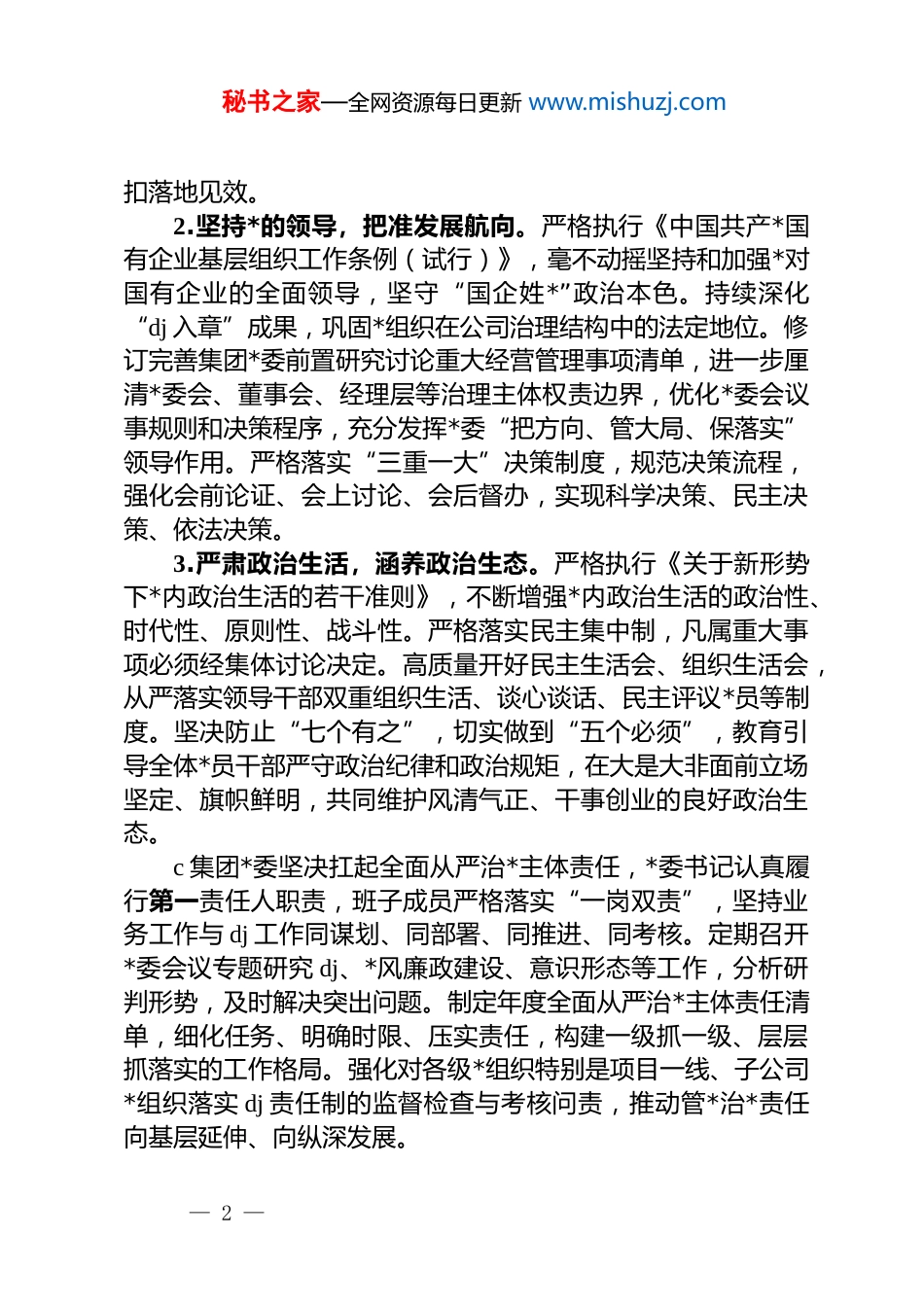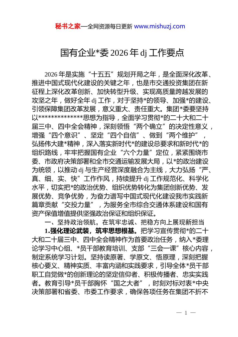 秘书之家—全网资源每日更新 www.mishuzj.com国有企业*委 2026 年 dj 工作要点2026 年是实施“十五五”规划开局之年,是全面深化改革、推进中国式现代化建设的关键之年,也是市交通投资集团在新征程上深化改革创新、加快转型升级、实现高质量跨越发展的攻坚之年,做好全年 dj 工作,对于坚持*的领导、加强*的建设、引领保障集团改革发展,意义重大、责任重大。集团*委要坚持以**************思想为指导,全面学习贯彻*的二十大和二十届三中、四中全会精神,深刻领悟“两个确立”的决定性意义,增强“四个意识”、坚定“四个自信”、做到“两个维护”,弘扬伟大建*精神,深入落实新时代*的建设总要求和新时代*的组织路线,牢牢把握国有企业“六个力量”定位,紧紧围绕市委、市政府决策部署和全市交通运输发展大局,以*的政治建设为统领,以推动 dj 与生产经营深度融合为主线,大力弘扬“严、真、细、实、快”工作作风,持续提升 dj 工作规范化、科学化水平,切实把*的政治优势、组织优势转化为集团创新优势、发展优势、竞争优势,为奋力谱写中国式现代化建设我市实践新篇章贡献“交投力量”,为服务全市综合交通体系建设和国有资产保值增值提供坚强政治保证和组织保证。一、坚持政治领航,在筑牢忠诚、把稳方向上展现新担当1.强化理论武装,筑牢思想根基。把学习宣传贯彻*的二十大和二十届三中、四中全会精神作为首要政治任务,纳入*委理论学习中心组、*员干部教育培训、支部“三会一课”核心内容,制定系统学习计划。坚持读原著、学原文、悟原理,深刻把握核心要义、精神实质、丰富内涵和实践要求,引导全体*员干部职工自觉做*的创新理论的坚定信仰者、积极传播者、忠实实践者。教育引导*员干部胸怀“国之大者”,时刻对标对表*中央决策部署和省委、市委工作要求,确保各项任务在集团不折不— 1 —秘书之家—全网资源每日更新 www.mishuzj.com扣落地见效。2.坚持*的领导,把准发展航向。严格执行《中国共产*国有企业基层组织工作条例(试行)》,毫不动摇坚持和加强*对国有企业的全面领导,坚守“国企姓*”政治本色。持续深化“dj 入章”成果,巩固*组织在公司治理结构中的法定地位。修订完善集团*委前置研究讨论重大经营管理事项清单,进一步厘清*委会、董事会、经理层等治理主体权责边界,优化*委会议事规则和决策程序,充分发挥*委“把方向、管大局、保落实”领导作用。严格落实“三重一大”决策制度,规范决策流程,强化会前论证、会上讨论、会后督办,实现科学决策、民主决策、依法决策。3.严肃政治生活,涵养政治生态。严格执行《关于新形势下*内政治生活的若干准则》,不断增强*内政治生活的政治性、时代性、原则性、战斗性。严格落实民主集中制,凡属重大事项必须经集体讨论决定。高质量开好民主生活会、组织生活会,从严落实领导干部双重组织生活、谈心谈话、民主评议*员等制度。坚决防止“七个有之”,切实做到“五个必须”,教育引导全体*员干部严守政治纪律和政治规矩,在大是大非面前立场坚定、旗帜鲜明,共同维护风清气正、干事创业的良好政治生态。c 集团*委坚决扛起全面从严治*主体责任,*委书记认真履行第一责任人职责,班子成员严格落实“一岗双责”,坚持业务工作与 dj 工作同谋划、同部署、同推进、同考核。定期召开*委会议专题研究 dj、*风廉政建设、意识形态等工作,分析研判形势,及时解决突出问题。制定年度全面从严治*主体责任清单,细化任务、明确时限、压实责任,构建一级抓一级、层层抓落实的工作格局。强化对各级*组织特别是项目一线、子公司*组织落实 dj 责任制的监督检查与考核问责,推动管*治*责任向基层延伸、向纵深发展。— 2 —秘书之家—全网资源每日更新 www.mishuzj.com二、坚持思想铸魂,在凝心聚力、守正创新上实现新提升5.常态长效学习,推动入脑入心。坚持把**************思想作为理论学习中心内容,健全常态化、长效化学习机制。充分发挥*委理论学习中心组示范引领作用,全年集中学习研讨不少于 12 次。严格落实“第一议题”制度,及时跟进学习******最新重要讲话和****批示精神。领导班子成员带头学习、...