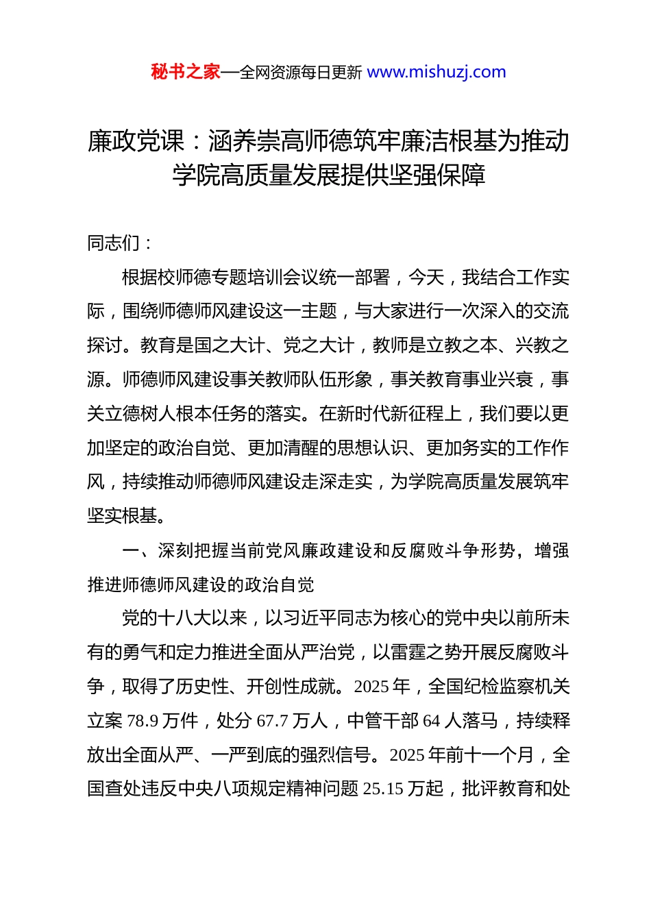 秘书之家—全网资源每日更新 www.mishuzj.com廉政党课:涵养崇高师德筑牢廉洁根基为推动学院高质量发展提供坚强保障 同志们:根据校师德专题培训会议统一部署,今天,我结合工作实际,围绕师德师风建设这一主题,与大家进行一次深入的交流探讨。教育是国之大计、党之大计,教师是立教之本、兴教之源。师德师风建设事关教师队伍形象,事关教育事业兴衰,事关立德树人根本任务的落实。在新时代新征程上,我们要以更加坚定的政治自觉、更加清醒的思想认识、更加务实的工作作风,持续推动师德师风建设走深走实,为学院高质量发展筑牢坚实根基。一、深刻把握当前党风廉政建设和反腐败斗争形势,增强推进师德师风建设的政治自觉党的十八大以来,以习近平同志为核心的党中央以前所未有的勇气和定力推进全面从严治党,以雷霆之势开展反腐败斗争,取得了历史性、开创性成就。2025 年,全国纪检监察机关立案 78.9 万件,处分 67.7 万人,中管干部 64 人落马,持续释放出全面从严、一严到底的强烈信号。2025 年前十一个月,全国查处违反中央八项规定精神问题 25.15 万起,批评教育和处秘书之家—全网资源每日更新 www.mishuzj.com理 32.68 万人,其中党纪政务处分 22.53 万人。这组数据充分表明,党中央惩治腐败的决心坚如磐石、态度旗帜鲜明、力度持续不减。当前,党风廉政建设和反腐败斗争呈现出几个显著特点:一是反腐败斗争压倒性胜利全面巩固并持续深化发展。从查处案件的总量看,力度不减、尺度不松、节奏不变;从查处对象的层级看,既有中管干部这样的“关键少数”,也有基层干部这样的“神经末梢”;从查处的领域看,金融、国企、能源、医药、高校、工程建设等重点领域腐败问题得到深化整治。二是作风建设常态长效机制不断完善。中央八项规定精神学习教育成果持续巩固,“四风”顽疾得到重拳纠治,风腐同查同治深入推进,群众身边不正之风和腐败问题得到持续整治。三是一体推进不敢腐、不能腐、不想腐的综合效应日益显现。新型腐败、隐性腐败查处力度加大,调查新型腐败和隐性腐败问题的证据指引出台实施,追逃追赃工作持续推进,反腐败斗争的制度优势不断转化为治理效能。2026 年是“十五五”规划开局之年,中共中央政治局已研究部署党风廉政建设和反腐败工作,强调要以更高标准、更严要求、更实举措推进全面从严治党,深化政治监督,保障党中央重大决策部署贯彻落实,为“十五五”时期经济社会发展提秘书之家—全网资源每日更新 www.mishuzj.com供坚强保障。我们要清醒认识到,反腐败斗争形势依然严峻复杂,全面从严治党永远在路上,党的自我革命永远在路上。党中央和省委对于反腐败斗争“一步不停歇、半步不退让”的鲜明态度和坚定决心,为我们推进师德师风建设提供了根本遵循和强大动力。高校作为培养社会主义建设者和接班人的重要阵地,肩负着为党育人、为国育才的神圣使命。高校教师的思想政治素质和道德情操,直接影响着学生的成长成才,直接关系着教育强国建设的成败。在全面从严治党的大背景下,加强师德师风建设,是贯彻落实习近平总书记关于教育的重要论述的必然要求,是落实立德树人根本任务的现实需要,是推进学院高质量发展的内在要求。我们必须站在政治和全局的高度,深刻认识加强师德师风建设的重大意义,切实增强责任感、紧迫感和使命感。二、清醒认识高校师德师风建设中存在的突出问题,增强推进师德师风建设的思想自觉在充分肯定成绩的同时,我们也要清醒看到,高校师德师风建设还存在一些不容忽视的问题。这些问题不仅损害了教师队伍形象,而且侵蚀着教育事业的健康发展,必须引起我们的高度警觉和深刻反思。从全国范围看,近年来高校系统内师德师风违规问题时有秘书之家—全网资源每日更新 www.mishuzj.com发生,性质恶劣,影响极坏。教育部持续公开曝光违反教师职业行为十项准则的典型案例,截至 2025 年底已公开曝光超过十五批次。这些案例涉及发表错误言论、学术不端、性骚扰、体罚、收受礼品礼金、有偿补课、违反学术规范、招生舞弊等多种违规行为。从处理结果看,涉事教师受到党内警告、行政处分、撤销教师资格、开除党籍、开除公职...