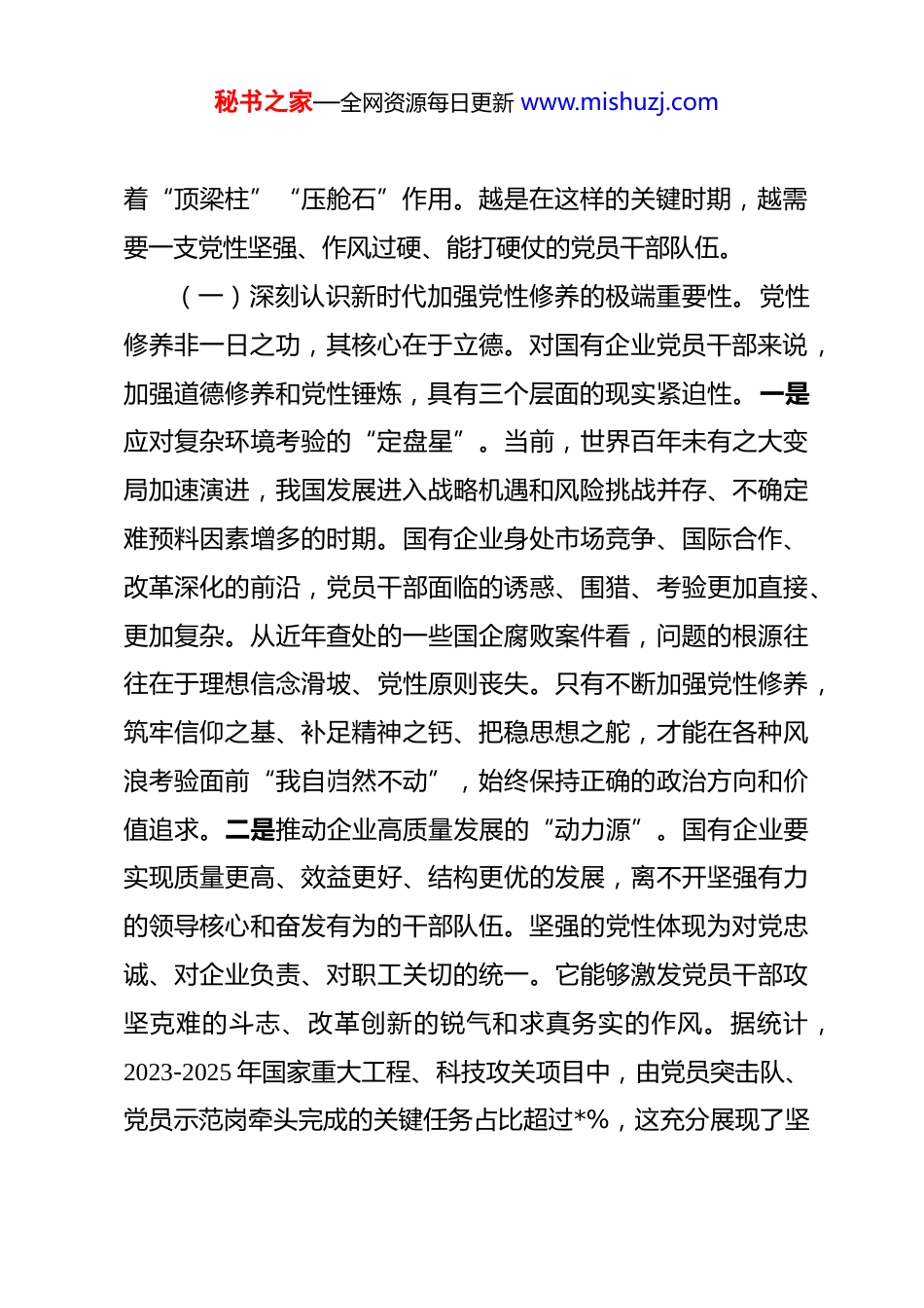 秘书之家—全网资源每日更新 www.mishuzj.com廉政党课:以坚强党性推进自我革命,为国有企业高质量发展提供坚强纪律作风保障 同志们:今天,我们举办廉政党课,目的是深入学习贯彻习近平总书记关于党的自我革命的重要思想,结合当前国有企业改革发展的形势任务,就如何以坚强党性推进自我革命,筑牢拒腐防变防线,保障企业高质量发展,进行一次集体学习交流。下面,我围绕“以坚强党性推进自我革命,为国有企业高质量发展提供坚强纪律作风保障”这一主题,与大家交流一些心得体会。一、坚持固本培元,铸牢忠诚干净担当的党性之魂党性是党员干部立身、立业、立言、立德的基石。习近平总书记深刻指出,推进党的自我革命,必须补钙壮骨、固本培元,增强党性修养。对于我们国有企业党员干部而言,坚强的党性不仅是政治要求,更是引领企业攻坚克难、履行经济责任、政治责任、社会责任的根本保证。当前,我国经济发展面临新的战略机遇和风险挑战,国有企业作为中国特色社会主义的重要物质基础和政治基础,肩负的责任更为重大。据统计,截至2025 年底,全国国资系统监管企业资产总额已突破*万亿元,营业收入超过*万亿元,在稳定经济大盘、服务国家战略中发挥秘书之家—全网资源每日更新 www.mishuzj.com着“顶梁柱”“压舱石”作用。越是在这样的关键时期,越需要一支党性坚强、作风过硬、能打硬仗的党员干部队伍。(一)深刻认识新时代加强党性修养的极端重要性。党性修养非一日之功,其核心在于立德。对国有企业党员干部来说,加强道德修养和党性锤炼,具有三个层面的现实紧迫性。一是应对复杂环境考验的“定盘星”。当前,世界百年未有之大变局加速演进,我国发展进入战略机遇和风险挑战并存、不确定难预料因素增多的时期。国有企业身处市场竞争、国际合作、改革深化的前沿,党员干部面临的诱惑、围猎、考验更加直接、更加复杂。从近年查处的一些国企腐败案件看,问题的根源往往在于理想信念滑坡、党性原则丧失。只有不断加强党性修养,筑牢信仰之基、补足精神之钙、把稳思想之舵,才能在各种风浪考验面前“我自岿然不动”,始终保持正确的政治方向和价值追求。二是推动企业高质量发展的“动力源”。国有企业要实现质量更高、效益更好、结构更优的发展,离不开坚强有力的领导核心和奋发有为的干部队伍。坚强的党性体现为对党忠诚、对企业负责、对职工关切的统一。它能够激发党员干部攻坚克难的斗志、改革创新的锐气和求真务实的作风。据统计,2023-2025 年国家重大工程、科技攻关项目中,由党员突击队、党员示范岗牵头完成的关键任务占比超过*%,这充分展现了坚秘书之家—全网资源每日更新 www.mishuzj.com强党性所转化的强大实践力量。三是凝聚干部职工人心的“强磁场”。职工群众是企业发展的力量源泉。党员干部的党性修养、道德品行,直接影响着企业的政治生态和内部风气。一个品德高尚、清正廉洁、担当实干的领导班子和管理团队,能够像磁石一样凝聚人心,赢得职工群众的信任和支持,从而汇聚起推动企业发展的强大合力。反之,则会涣散人心,损害企业形象,侵蚀发展根基。职工满意度调查数据显示,职工对管理层廉洁自律、作风形象的关注度长期居于前列,这要求我们必须将党性修养作为队伍建设的关键环节常抓不懈。(二)准确把握新时代党性修养的核心内涵与实践要求。新时代国有企业党员干部加强党性修养,必须聚焦关键、落到实处,重点要在以下几个方面下功夫、求实效。一是锤炼“两个维护”的绝对忠诚。对党忠诚,是共产党人首要的政治品质。国有企业是党领导下的经济组织,必须旗帜鲜明讲政治。要深刻领悟“两个确立”的决定性意义,自觉在思想上政治上行动上同以习近平同志为核心的党中央保持高度一致。要将对党的忠诚,具体体现为不折不扣贯彻执行党中央关于国有企业改革发展和党的建设的决策部署,体现为坚决落实国家战略、服务国计民生的实际行动,体现为在企业经营决策中始终坚持党的领导、维护国家利益。要教育引导党员干部不断增强政治判断秘书之家—全网资源每日更新 www.mishuzj.com力、政治领悟力、政治执行力,确保企业改革发展始终沿着正确方向前进。二是恪...