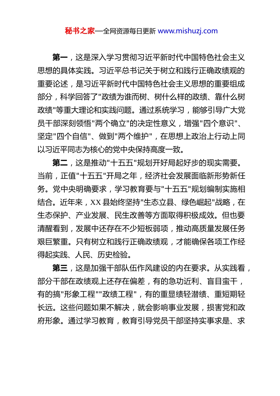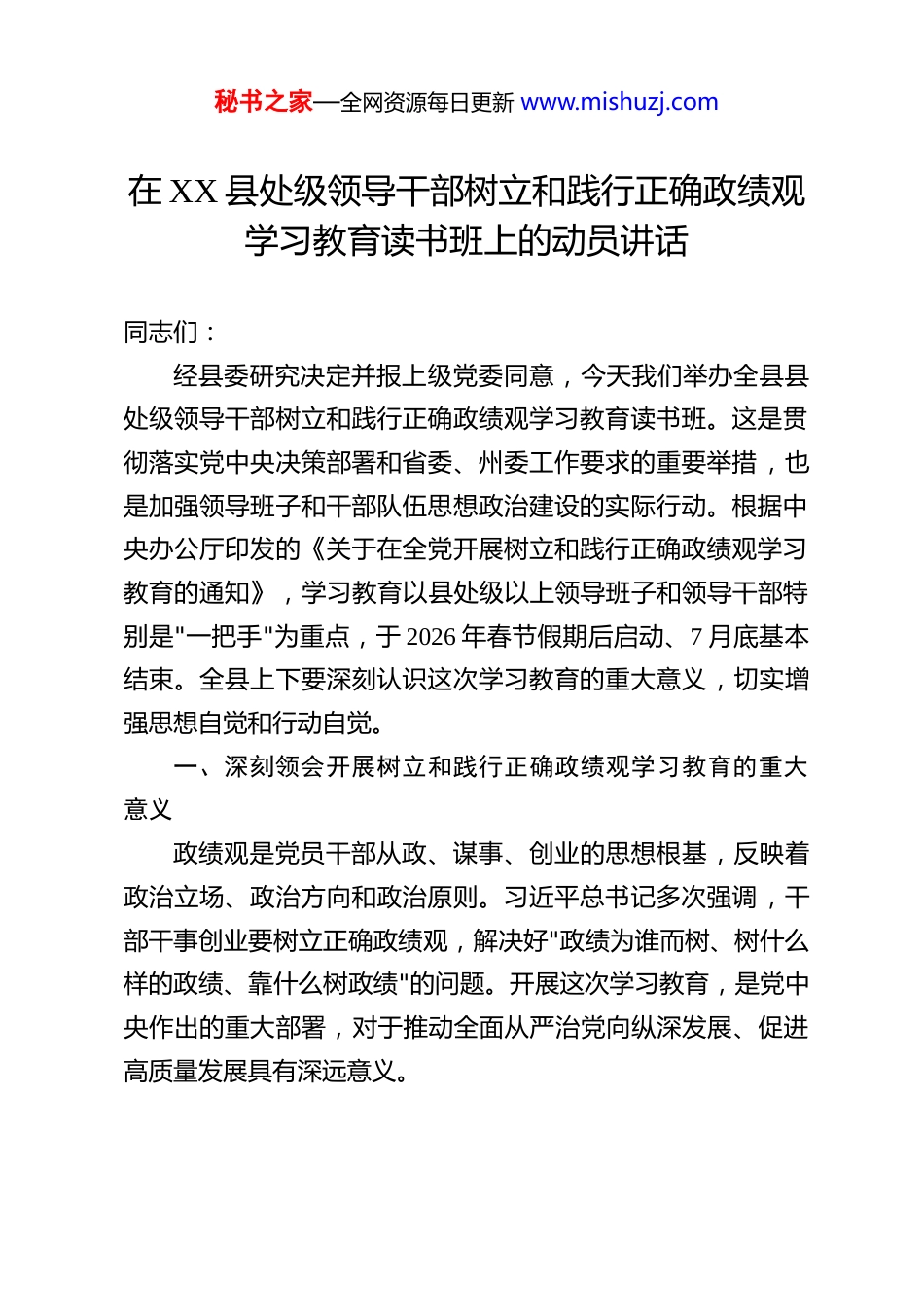秘书之家—全网资源每日更新 www.mishuzj.com在 XX 县处级领导干部树立和践行正确政绩观学习教育读书班上的动员讲话 同志们:经县委研究决定并报上级党委同意,今天我们举办全县县处级领导干部树立和践行正确政绩观学习教育读书班。这是贯彻落实党中央决策部署和省委、州委工作要求的重要举措,也是加强领导班子和干部队伍思想政治建设的实际行动。根据中央办公厅印发的《关于在全党开展树立和践行正确政绩观学习教育的通知》,学习教育以县处级以上领导班子和领导干部特别是"一把手"为重点,于 2026 年春节假期后启动、7 月底基本结束。全县上下要深刻认识这次学习教育的重大意义,切实增强思想自觉和行动自觉。一、深刻领会开展树立和践行正确政绩观学习教育的重大意义政绩观是党员干部从政、谋事、创业的思想根基,反映着政治立场、政治方向和政治原则。习近平总书记多次强调,干部干事创业要树立正确政绩观,解决好"政绩为谁而树、树什么样的政绩、靠什么树政绩"的问题。开展这次学习教育,是党中央作出的重大部署,对于推动全面从严治党向纵深发展、促进高质量发展具有深远意义。秘书之家—全网资源每日更新 www.mishuzj.com第一,这是深入学习贯彻习近平新时代中国特色社会主义思想的具体实践。习近平总书记关于树立和践行正确政绩观的重要论述,是习近平新时代中国特色社会主义思想的重要组成部分,科学回答了"政绩为谁而树、树什么样的政绩、靠什么树政绩"等重大理论和实践问题。通过系统学习,能够引导广大党员干部深刻领悟"两个确立"的决定性意义,增强"四个意识"、坚定"四个自信"、做到"两个维护",在思想上政治上行动上同以习近平同志为核心的党中央保持高度一致。第二,这是推动"十五五"规划开好局起好步的现实需要。当前,正值"十五五"开局之年,经济社会发展面临新形势新任务。党中央明确要求,学习教育要与"十五五"规划编制实施相结合。近年来,XX 县始终坚持"生态立县、绿色崛起"战略,在生态保护、产业发展、民生改善等方面取得积极成效。但也要清醒看到,发展中还存在不少短板弱项,推动高质量发展任务艰巨繁重。只有树立和践行正确政绩观,才能确保各项工作经得起实践、人民、历史检验。第三,这是加强干部队伍作风建设的内在要求。从实践看,部分干部在政绩观上还存在偏差,有的急功近利、盲目蛮干,有的搞"形象工程""政绩工程",有的重显绩轻潜绩、重短期轻长远。这些问题如果不解决,就会影响事业发展,损害党和政府形象。通过学习教育,教育引导党员干部坚持实事求是、求秘书之家—全网资源每日更新 www.mishuzj.com真务实,为人民出政绩、以实干出政绩,有效防范和纠治政绩观偏差。二、准确把握正确政绩观的科学内涵和核心要义正确政绩观内涵丰富、意蕴深刻,必须全面系统把握其精神实质和核心要义。根据党中央部署要求,学习教育以"立党为公、为民造福、科学决策、真抓实干"为总要求。这一要求为党员干部干事创业提供了根本遵循。一是站稳人民立场,把为民造福作为最大政绩。习近平总书记指出,共产党人必须牢记,为民造福是最大政绩。谋划推进工作,必须坚持全心全意为人民服务的根本宗旨,坚持以人民为中心的发展思想,把发展为了人民、发展依靠人民、发展成果由人民共享落实到具体实践中。XX 县近年来在民生领域持续投入,群众获得感不断增强。但对照群众期盼,在就业增收、教育医疗、养老保障等方面仍有不少差距。各级干部要始终把人民群众放在心中最高位置,把群众满意不满意作为评判政绩的根本标准,用心用情用力解决好群众急难愁盼问题。二是坚持求真务实,以科学决策引领高质量发展。正确政绩观要求实事求是、尊重规律、科学决策。凡事要多调研、多论证,摸清实情、找准症结,做到科学决策、民主决策、依法决策。XX 县在生态保护方面探索形成了有益经验,成为"中国绿孔雀之乡"和"中国天然氧吧",这是长期坚持"绿水青山就是金山银山"理念的结果。要总结运用好这些经验,在产业发展、秘书之家—全网资源每日更新 www.mishuzj.com项目建设、城乡规划等重大事项上,加强调查研究,广泛听取意见,确保决策科学民主、符合实际。三是强化...