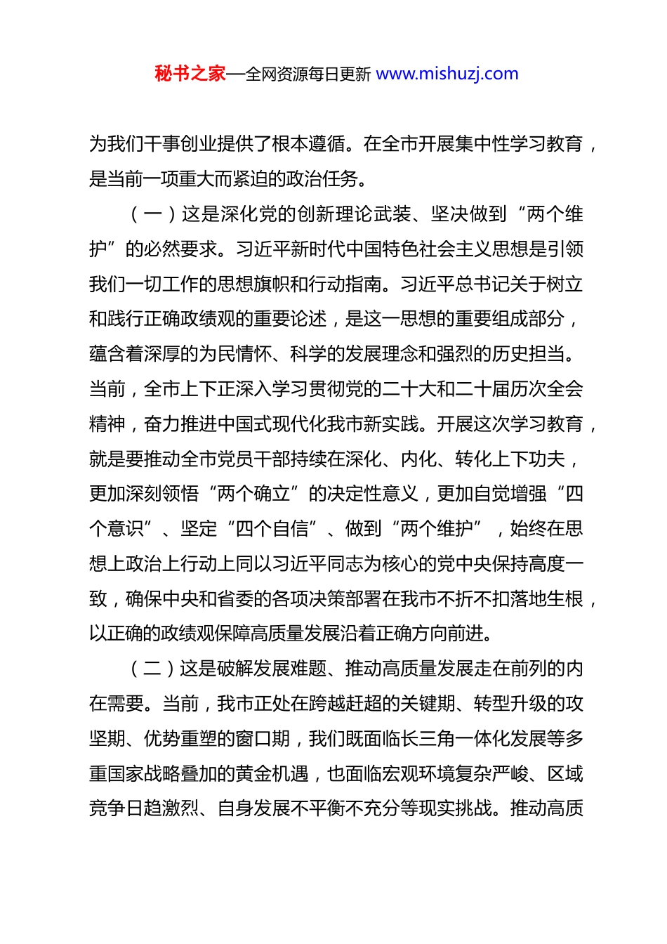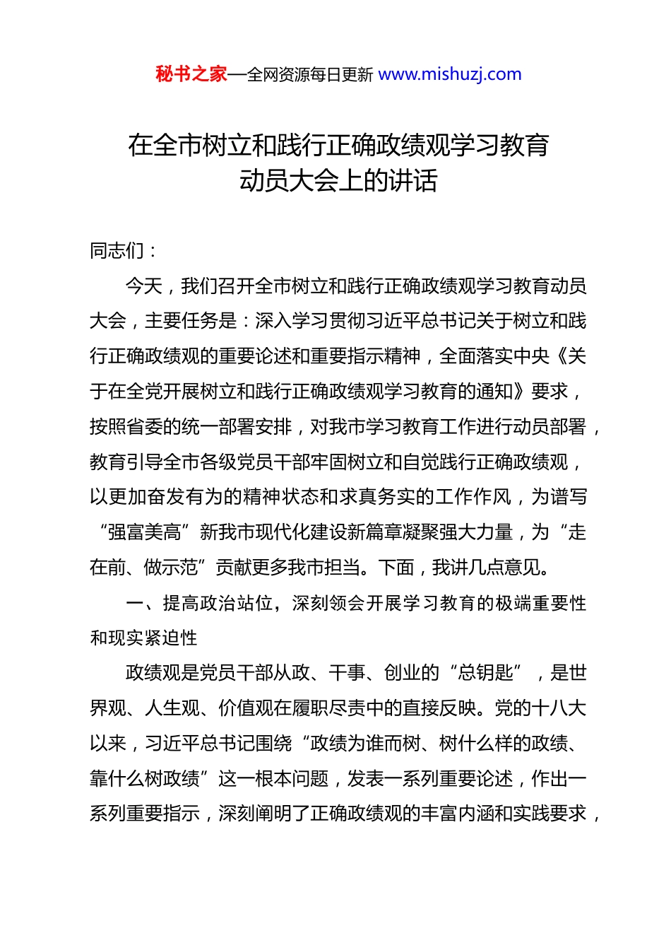 秘书之家—全网资源每日更新 www.mishuzj.com在全市树立和践行正确政绩观学习教育动员大会上的讲话 同志们:今天,我们召开全市树立和践行正确政绩观学习教育动员大会,主要任务是:深入学习贯彻习近平总书记关于树立和践行正确政绩观的重要论述和重要指示精神,全面落实中央《关于在全党开展树立和践行正确政绩观学习教育的通知》要求,按照省委的统一部署安排,对我市学习教育工作进行动员部署,教育引导全市各级党员干部牢固树立和自觉践行正确政绩观,以更加奋发有为的精神状态和求真务实的工作作风,为谱写“强富美高”新我市现代化建设新篇章凝聚强大力量,为“走在前、做示范”贡献更多我市担当。下面,我讲几点意见。一、提高政治站位,深刻领会开展学习教育的极端重要性和现实紧迫性政绩观是党员干部从政、干事、创业的“总钥匙”,是世界观、人生观、价值观在履职尽责中的直接反映。党的十八大以来,习近平总书记围绕“政绩为谁而树、树什么样的政绩、靠什么树政绩”这一根本问题,发表一系列重要论述,作出一系列重要指示,深刻阐明了正确政绩观的丰富内涵和实践要求,秘书之家—全网资源每日更新 www.mishuzj.com为我们干事创业提供了根本遵循。在全市开展集中性学习教育,是当前一项重大而紧迫的政治任务。(一)这是深化党的创新理论武装、坚决做到“两个维护”的必然要求。习近平新时代中国特色社会主义思想是引领我们一切工作的思想旗帜和行动指南。习近平总书记关于树立和践行正确政绩观的重要论述,是这一思想的重要组成部分,蕴含着深厚的为民情怀、科学的发展理念和强烈的历史担当。当前,全市上下正深入学习贯彻党的二十大和二十届历次全会精神,奋力推进中国式现代化我市新实践。开展这次学习教育,就是要推动全市党员干部持续在深化、内化、转化上下功夫,更加深刻领悟“两个确立”的决定性意义,更加自觉增强“四个意识”、坚定“四个自信”、做到“两个维护”,始终在思想上政治上行动上同以习近平同志为核心的党中央保持高度一致,确保中央和省委的各项决策部署在我市不折不扣落地生根,以正确的政绩观保障高质量发展沿着正确方向前进。(二)这是破解发展难题、推动高质量发展走在前列的内在需要。当前,我市正处在跨越赶超的关键期、转型升级的攻坚期、优势重塑的窗口期,我们既面临长三角一体化发展等多重国家战略叠加的黄金机遇,也面临宏观环境复杂严峻、区域竞争日趋激烈、自身发展不平衡不充分等现实挑战。推动高质秘书之家—全网资源每日更新 www.mishuzj.com量发展,实现“一枢纽五城市”主攻方向,尤其需要科学的发展观和正确的政绩观来引领。必须清醒看到,我市少数干部在政绩观上还存在一些偏差和误区:一是急功近利、脱离实际。有的热衷于“显绩”,对打基础、利长远的事不够上心;有的规划论证不充分,盲目上项目、铺摊子,留下“半拉子”工程或后遗症。二是作风不实、担当不足。有的遇到矛盾绕道走,不敢动真碰硬,历史遗留问题久拖不决;有的落实工作重“痕”不重“绩”,搞“盆景”式调研、材料式落实。三是宗旨不牢、脱离群众。有的解决群众急难愁盼问题不用心、不尽力,对信访矛盾被动应付;有的在民生项目中优先考虑“视觉效果”,而非群众实际获得感。四是数据不实、弄虚作假。极个别地方或领域仍有统计造假、数字注水的风险苗头。这些问题虽然发生在少数人身上,但危害甚广,不仅浪费宝贵的发展资源,挫伤干部群众的积极性,更会侵蚀党的执政根基,必须通过这次学习教育来一次彻底的大排查、大检修、大扫除。(三)这是锻造高素质干部队伍、激励干部担当作为的关键举措。正确的政绩观是干部敢于担当、善于作为的思想基石。干部队伍的政绩观端正了,发展的指导思想就端正了,干事创业的“内驱力”就强了。开展学习教育,就是要引导广大干部深刻认识到,真正的政绩是“潜绩”与“显绩”的统一,是经秘书之家—全网资源每日更新 www.mishuzj.com济发展与民生改善的协调,是当前效益与长远福祉的兼顾。要大力倡导“功成不必在我、功成必定有我”的境界,把全部心思和精力凝聚到为我市谋发展、为人民谋幸福上来。通过学习教育,进...