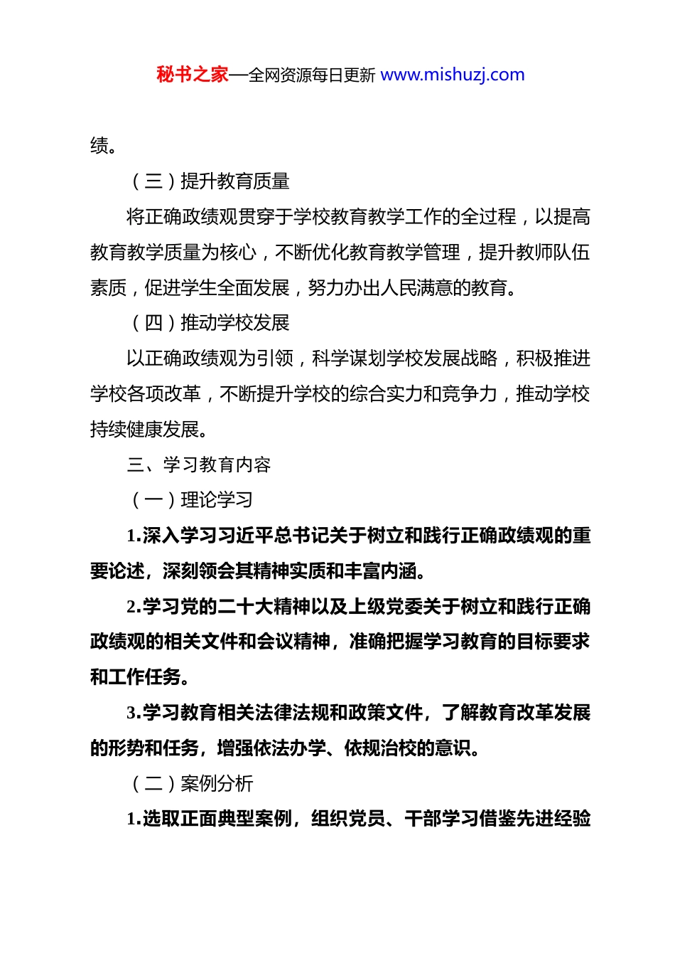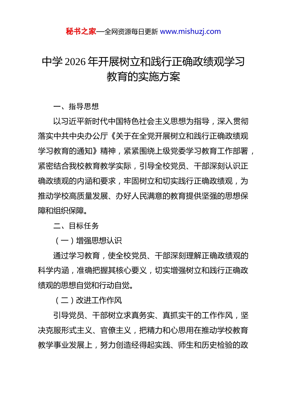 秘书之家—全网资源每日更新 www.mishuzj.com中学 2026 年开展树立和践行正确政绩观学习教育的实施方案 一、指导思想以习近平新时代中国特色社会主义思想为指导,深入贯彻落实中共中央办公厅《关于在全党开展树立和践行正确政绩观学习教育的通知》精神,紧紧围绕上级党委学习教育工作部署,紧密结合我校教育教学实际,引导全校党员、干部深刻认识正确政绩观的内涵和要求,牢固树立和切实践行正确政绩观,为推动学校高质量发展、办好人民满意的教育提供坚强的思想保障和组织保障。二、目标任务(一)增强思想认识通过学习教育,使全校党员、干部深刻理解正确政绩观的科学内涵,准确把握其核心要义,切实增强树立和践行正确政绩观的思想自觉和行动自觉。(二)改进工作作风引导党员、干部树立求真务实、真抓实干的工作作风,坚决克服形式主义、官僚主义,把精力和心思用在推动学校教育教学事业发展上,努力创造经得起实践、师生和历史检验的政秘书之家—全网资源每日更新 www.mishuzj.com绩。(三)提升教育质量将正确政绩观贯穿于学校教育教学工作的全过程,以提高教育教学质量为核心,不断优化教育教学管理,提升教师队伍素质,促进学生全面发展,努力办出人民满意的教育。(四)推动学校发展以正确政绩观为引领,科学谋划学校发展战略,积极推进学校各项改革,不断提升学校的综合实力和竞争力,推动学校持续健康发展。三、学习教育内容(一)理论学习1.深入学习习近平总书记关于树立和践行正确政绩观的重要论述,深刻领会其精神实质和丰富内涵。2.学习党的二十大精神以及上级党委关于树立和践行正确政绩观的相关文件和会议精神,准确把握学习教育的目标要求和工作任务。3.学习教育相关法律法规和政策文件,了解教育改革发展的形势和任务,增强依法办学、依规治校的意识。(二)案例分析1.选取正面典型案例,组织党员、干部学习借鉴先进经验秘书之家—全网资源每日更新 www.mishuzj.com和做法,激励他们积极进取、勇于担当,努力创造优异的工作业绩。2.剖析反面典型案例,深刻分析其错误政绩观的表现和危害,引导党员、干部从中吸取教训,引以为戒,自觉抵制错误政绩观的影响。(三)专题研讨围绕“什么是正确政绩观”“如何树立和践行正确政绩观”“怎样创造经得起实践、师生和历史检验的政绩”等主题,组织党员、干部开展专题研讨,交流学习心得和体会,深化对正确政绩观的认识和理解。(四)实地调研组织党员、干部深入教学一线、学生中间开展实地调研,了解师生的需求和期望,查找学校教育教学工作中存在的问题和不足,为制定科学合理的工作方案和措施提供依据。四、实施步骤(一)动员部署阶段([具体时间区间 1])1.成立学习教育领导小组,明确职责分工,加强对学习教育工作的组织领导。2.制定学习教育实施方案,明确学习教育的目标任务、内容形式、方法步骤和工作要求。秘书之家—全网资源每日更新 www.mishuzj.com3.召开动员大会,传达学习上级党委关于树立和践行正确政绩观学习教育的文件和会议精神,对学习教育工作进行全面动员部署。(二)学习教育阶段([具体时间区间 2])1.个人自学党员、干部要根据学习教育方案的要求,制定个人学习计划,认真学习指定的学习内容,做好学习笔记,撰写学习心得。2.集中学习采取专题讲座、辅导报告、观看教育片等形式,组织党员干部进行集中学习,邀请专家学者、先进典型进行授课,深入解读正确政绩观的内涵和要求。3.小组讨论以党支部为单位,组织党员、干部开展小组讨论,围绕学习内容和专题研讨主题,结合自身工作实际,交流学习心得和体会,提出意见和建议。4.实地调研组织党员、干部深入教学一线、学生中间开展实地调研,了解师生的需求和期望,查找学校教育教学工作中存在的问题和不足,撰写调研报告。(三)对照检查阶段([具体时间区间 3])秘书之家—全网资源每日更新 www.mishuzj.com1.自我剖析党员、干部要对照正确政绩观的要求,认真查找自身在思想认识、工作作风、工作业绩等方面存在的问题和不足,深刻剖析原因,撰写自我剖析材料。2.征求意见通过召开座谈会、发放征求意见表、设置意见箱等方式,广泛征求师...