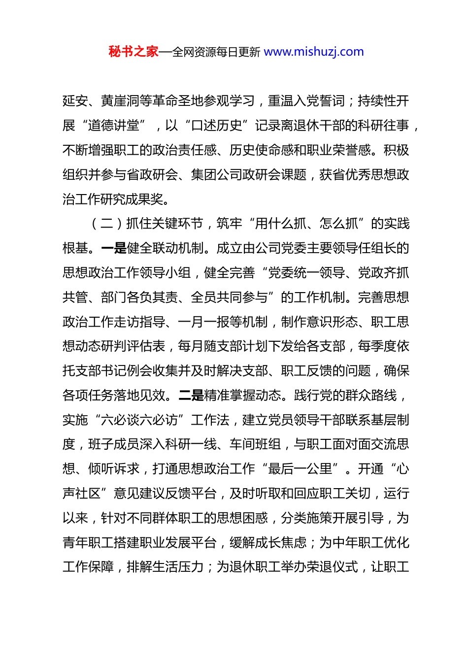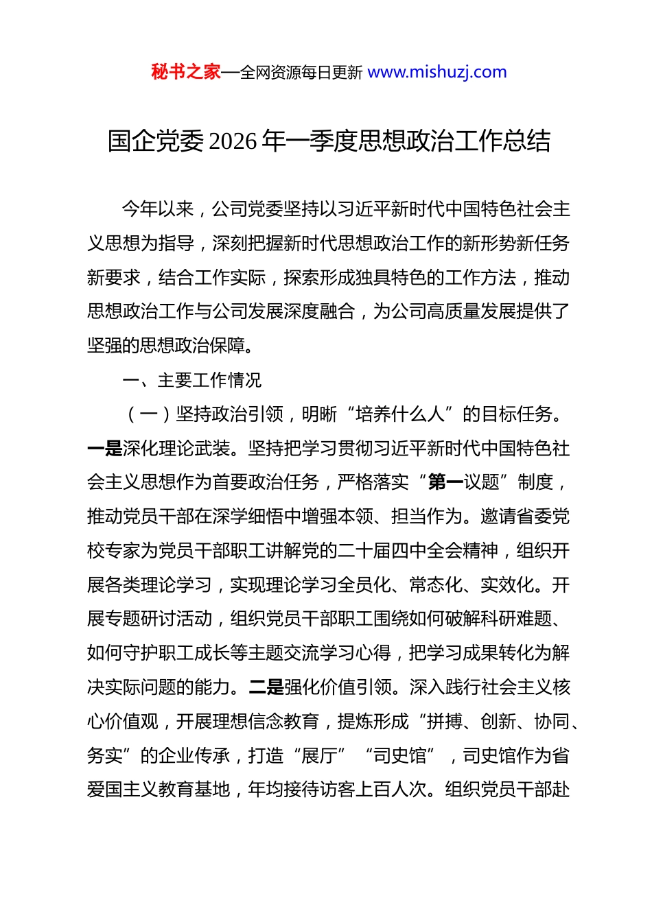 秘书之家—全网资源每日更新 www.mishuzj.com国企党委 2026 年一季度思想政治工作总结 今年以来,公司党委坚持以习近平新时代中国特色社会主义思想为指导,深刻把握新时代思想政治工作的新形势新任务新要求,结合工作实际,探索形成独具特色的工作方法,推动思想政治工作与公司发展深度融合,为公司高质量发展提供了坚强的思想政治保障。一、主要工作情况(一)坚持政治引领,明晰“培养什么人”的目标任务。一是深化理论武装。坚持把学习贯彻习近平新时代中国特色社会主义思想作为首要政治任务,严格落实“第一议题”制度,推动党员干部在深学细悟中增强本领、担当作为。邀请省委党校专家为党员干部职工讲解党的二十届四中全会精神,组织开展各类理论学习,实现理论学习全员化、常态化、实效化。开展专题研讨活动,组织党员干部职工围绕如何破解科研难题、如何守护职工成长等主题交流学习心得,把学习成果转化为解决实际问题的能力。二是强化价值引领。深入践行社会主义核心价值观,开展理想信念教育,提炼形成“拼搏、创新、协同、务实”的企业传承,打造“展厅”“司史馆”,司史馆作为省爱国主义教育基地,年均接待访客上百人次。组织党员干部赴秘书之家—全网资源每日更新 www.mishuzj.com延安、黄崖洞等革命圣地参观学习,重温入党誓词;持续性开展“道德讲堂”,以“口述历史”记录离退休干部的科研往事,不断增强职工的政治责任感、历史使命感和职业荣誉感。积极组织并参与省政研会、集团公司政研会课题,获省优秀思想政治工作研究成果奖。(二)抓住关键环节,筑牢“用什么抓、怎么抓”的实践根基。一是健全联动机制。成立由公司党委主要领导任组长的思想政治工作领导小组,健全完善“党委统一领导、党政齐抓共管、部门各负其责、全员共同参与”的工作机制。完善思想政治工作走访指导、一月一报等机制,制作意识形态、职工思想动态研判评估表,每月随支部计划下发给各支部,每季度依托支部书记例会收集并及时解决支部、职工反馈的问题,确保各项任务落地见效。二是精准掌握动态。践行党的群众路线,实施“六必谈六必访”工作法,建立党员领导干部联系基层制度,班子成员深入科研一线、车间班组,与职工面对面交流思想、倾听诉求,打通思想政治工作“最后一公里”。开通“心声社区”意见建议反馈平台,及时听取和回应职工关切,运行以来,针对不同群体职工的思想困惑,分类施策开展引导,为青年职工搭建职业发展平台,缓解成长焦虑;为中年职工优化工作保障,排解生活压力;为退休职工举办荣退仪式,让职工秘书之家—全网资源每日更新 www.mishuzj.com感受到组织的温暖与重视。(三)突出实践重点,激活“聚人心、强合力”的内生动力。一是打造文化品牌。结合工作实际,创新提出“五家文化”(工业之家、创新之家、人文之家、温暖之家、活力之家)品牌建设,不断擦亮“全国模范职工之家”招牌。深化“全国学雷锋示范点”建设,组建 1200 余人的志愿服务队,对离退休老干部实施“一对一”全生命周期关怀,结合重要节点开展“科普进校园、进社区”等志愿服务活动。以品牌建设为抓手,完善职工福利保障体系,打造职工文化活动中心,解决职工子女上学问题并安排校车接送上下学;开展青年职工联谊活动,并为促成的青年才俊举办“缘定北方自控”集体婚礼;组织家属开放日活动,解决职工急难愁盼问题。二是选树先进典型。建立先进典型选树机制,定期开展优秀党员、先进工作者、劳动模范、最佳新锐等评选活动,深入挖掘科研一线、志愿服务、乡村全面振兴等领域的先进事迹,通过内网、微信公众号、表彰大会等方式进行广泛宣传。高天成同志荣获“全国先进工作者”,张钟铮家庭获“全国文明家庭”提名,还有多名职工荣获省级、集团级表彰,形成学习先进、争当先进的浓厚氛围。三是丰富文体生活。扎实开展“我为群众办实事”实践活动,组织开展职工运动会、文艺汇演、演讲比赛等文体活秘书之家—全网资源每日更新 www.mishuzj.com动,职工自创歌曲《公司牵着我的心》在集团微信公众号展播,原创诗歌朗诵《他们是谁》获得 290 万网友好评,选派职工参加省主题演讲比赛,获青...