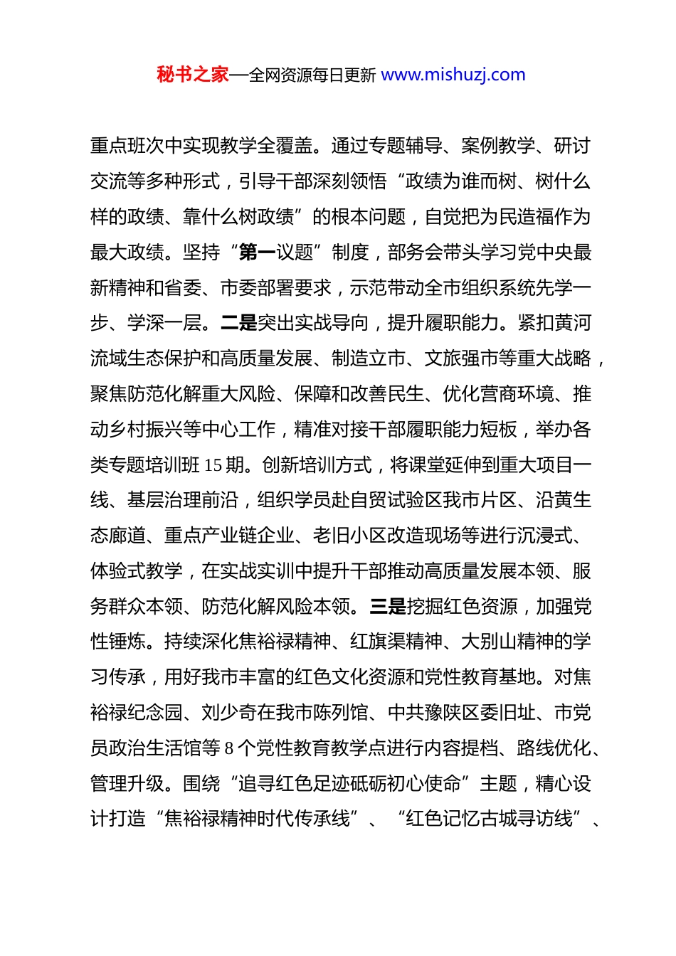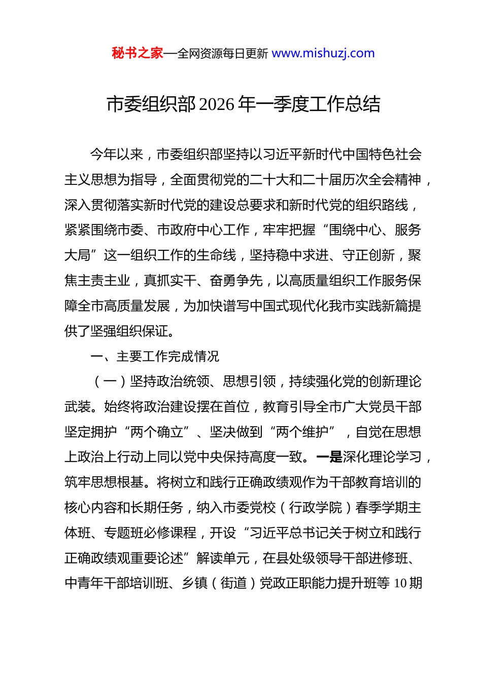 秘书之家—全网资源每日更新 www.mishuzj.com市委组织部 2026 年一季度工作总结 今年以来,市委组织部坚持以习近平新时代中国特色社会主义思想为指导,全面贯彻党的二十大和二十届历次全会精神,深入贯彻落实新时代党的建设总要求和新时代党的组织路线,紧紧围绕市委、市政府中心工作,牢牢把握“围绕中心、服务大局”这一组织工作的生命线,坚持稳中求进、守正创新,聚焦主责主业,真抓实干、奋勇争先,以高质量组织工作服务保障全市高质量发展,为加快谱写中国式现代化我市实践新篇提供了坚强组织保证。一、主要工作完成情况(一)坚持政治统领、思想引领,持续强化党的创新理论武装。始终将政治建设摆在首位,教育引导全市广大党员干部坚定拥护“两个确立”、坚决做到“两个维护”,自觉在思想上政治上行动上同以党中央保持高度一致。一是深化理论学习,筑牢思想根基。将树立和践行正确政绩观作为干部教育培训的核心内容和长期任务,纳入市委党校(行政学院)春季学期主体班、专题班必修课程,开设“习近平总书记关于树立和践行正确政绩观重要论述”解读单元,在县处级领导干部进修班、中青年干部培训班、乡镇(街道)党政正职能力提升班等 10 期秘书之家—全网资源每日更新 www.mishuzj.com重点班次中实现教学全覆盖。通过专题辅导、案例教学、研讨交流等多种形式,引导干部深刻领悟“政绩为谁而树、树什么样的政绩、靠什么树政绩”的根本问题,自觉把为民造福作为最大政绩。坚持“第一议题”制度,部务会带头学习党中央最新精神和省委、市委部署要求,示范带动全市组织系统先学一步、学深一层。二是突出实战导向,提升履职能力。紧扣黄河流域生态保护和高质量发展、制造立市、文旅强市等重大战略,聚焦防范化解重大风险、保障和改善民生、优化营商环境、推动乡村振兴等中心工作,精准对接干部履职能力短板,举办各类专题培训班 15 期。创新培训方式,将课堂延伸到重大项目一线、基层治理前沿,组织学员赴自贸试验区我市片区、沿黄生态廊道、重点产业链企业、老旧小区改造现场等进行沉浸式、体验式教学,在实战实训中提升干部推动高质量发展本领、服务群众本领、防范化解风险本领。三是挖掘红色资源,加强党性锤炼。持续深化焦裕禄精神、红旗渠精神、大别山精神的学习传承,用好我市丰富的红色文化资源和党性教育基地。对焦裕禄纪念园、刘少奇在我市陈列馆、中共豫陕区委旧址、市党员政治生活馆等 8 个党性教育教学点进行内容提档、路线优化、管理升级。围绕“追寻红色足迹砥砺初心使命”主题,精心设计打造“焦裕禄精神时代传承线”、“红色记忆古城寻访线”、秘书之家—全网资源每日更新 www.mishuzj.com“乡村振兴实践观摩线”、“高质量发展创新探索线”等 4 条精品教学线路,增强了党性教育的吸引力和感染力。四是拓展培训载体,延伸学习触角。持续办好“菊城大讲堂”,邀请知名专家学者、先进典型人物、领导干部授课,目前已举办 3 期。推动“一把手”进党校上讲台,安排县区、市直单位主要负责同志结合工作实际宣讲政策、分享经验。组织业务骨干开展“政策解读进基层”活动。利用“党建云”平台、“我市组工”微信公众号等线上阵地,以及机关、社区、企业“红色影院”等线下载体,开展“光影铸魂”主题活动,展播优秀主旋律影片和党员教育电视片,以生动形式推动党的创新理论“飞入寻常百姓家”。本季度累计组织各类社会化培训 80 余个班次,培训各领域人员约 4000 人次。(二)突出事业为上、以事择人,着力锻造堪当发展重任的高素质干部队伍。认真落实新时期好干部标准,树牢重实干、重实绩、重担当的鲜明用人导向,着力优化干部选育管用工作,激发干部队伍生机活力。一是平稳有序完成市、县(区)领导班子换届工作。坚决贯彻落实党中央、省委关于换届工作的部署要求和市委具体安排,把坚持和加强党的全面领导贯穿换届全过程。严格政治标准,严把资格条件,严密程序步骤,突出“六个既看又看”(既看政治表现、又看专业能力,既看日常秘书之家—全网资源每日更新 www.mishuzj.com表现、又看关键时刻担当,既看工作实绩、又看群众口碑,既看显绩...