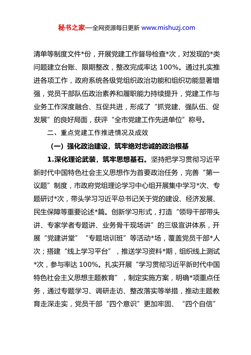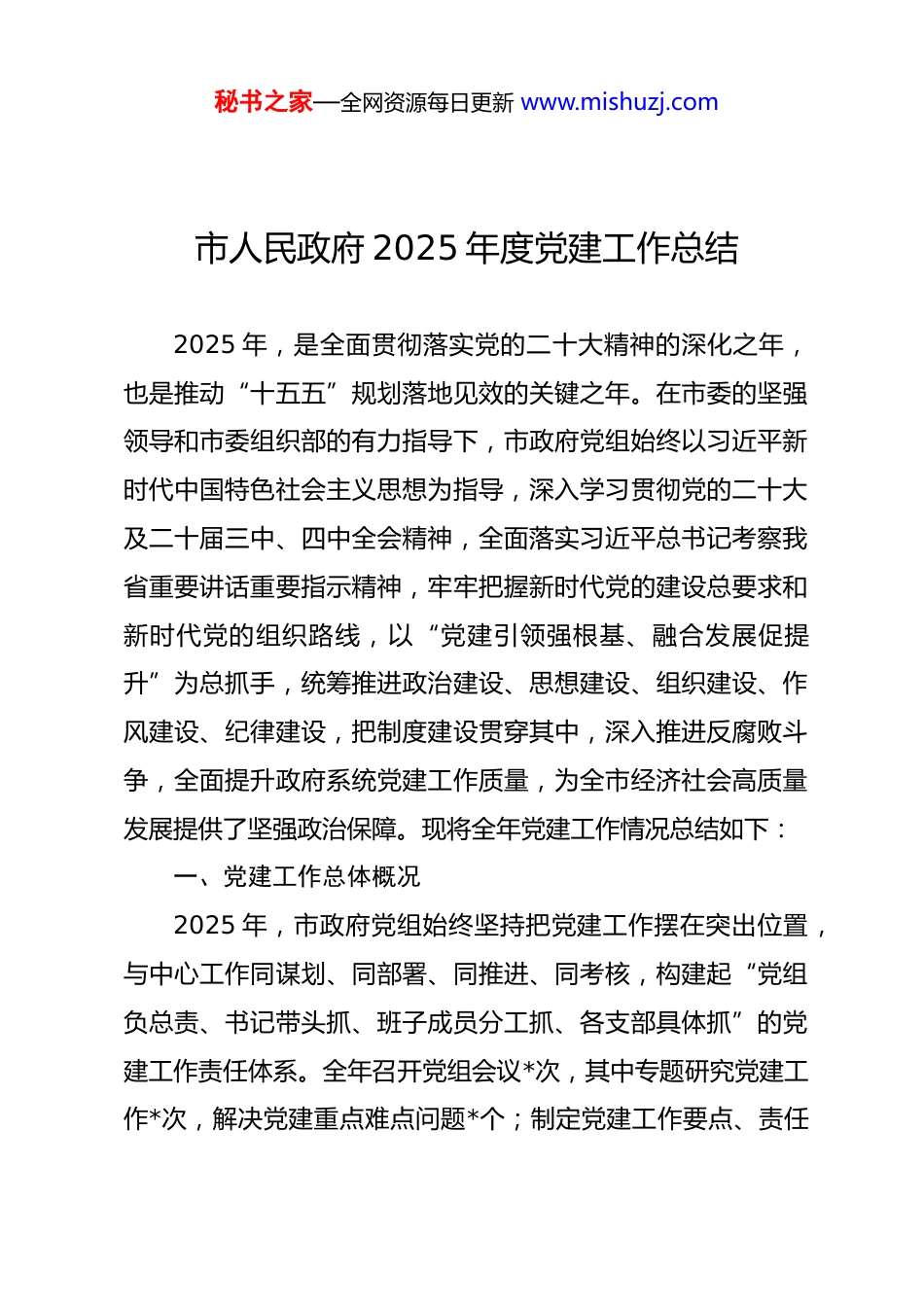 秘书之家—全网资源每日更新 www.mishuzj.com市人民政府 2025 年度党建工作总结2025 年,是全面贯彻落实党的二十大精神的深化之年,也是推动“十五五”规划落地见效的关键之年。在市委的坚强领导和市委组织部的有力指导下,市政府党组始终以习近平新时代中国特色社会主义思想为指导,深入学习贯彻党的二十大及二十届三中、四中全会精神,全面落实习近平总书记考察我省重要讲话重要指示精神,牢牢把握新时代党的建设总要求和新时代党的组织路线,以“党建引领强根基、融合发展促提升”为总抓手,统筹推进政治建设、思想建设、组织建设、作风建设、纪律建设,把制度建设贯穿其中,深入推进反腐败斗争,全面提升政府系统党建工作质量,为全市经济社会高质量发展提供了坚强政治保障。现将全年党建工作情况总结如下:一、党建工作总体概况2025 年,市政府党组始终坚持把党建工作摆在突出位置,与中心工作同谋划、同部署、同推进、同考核,构建起“党组负总责、书记带头抓、班子成员分工抓、各支部具体抓”的党建工作责任体系。全年召开党组会议*次,其中专题研究党建工作*次,解决党建重点难点问题*个;制定党建工作要点、责任秘书之家—全网资源每日更新 www.mishuzj.com清单等制度文件*份,开展党建工作督导检查*次,对发现的*类问题建立台账、限期整改,整改完成率达 100%。通过扎实推进各项工作,政府系统各级党组织政治功能和组织功能显著增强,党员干部队伍政治素养和履职能力持续提升,党建工作与业务工作深度融合、互促共进,形成了“抓党建、强队伍、促发展”的良好局面,获评“全市党建工作先进单位”称号。二、重点党建工作推进情况及成效(一)强化政治建设,筑牢绝对忠诚的政治根基1.深化理论武装,筑牢思想基石。坚持把学习贯彻习近平新时代中国特色社会主义思想作为首要政治任务,完善“第一议题”制度,市政府党组理论学习中心组开展集中学习*次、专题研讨*次,带头学习习近平总书记关于党的建设、经济发展、民生保障等重要论述*篇。创新学习形式,打造“领导干部带头讲、专家学者专题讲、业务骨干现场讲”的三级宣讲体系,开展“党建讲堂”“专题培训班”等活动*场,覆盖党员干部*人次;搭建“线上学习平台”,推送学习资料*期,组织线上测试*次,参与率达 100%。扎实开展“学习贯彻习近平新时代中国特色社会主义思想主题教育”,制定实施方案,明确*项重点任务,通过专题学习、调研走访、整改落实等举措,推动主题教育走深走实,党员干部“四个意识”更加牢固、“四个自信”秘书之家—全网资源每日更新 www.mishuzj.com更加坚定、“两个维护”更加自觉。2.严明政治纪律,强化政治忠诚。始终把政治纪律和政治规矩挺在前面,组织开展“政治纪律和政治规矩教育月”活动,通过专题党课、案例警示、知识竞赛等形式,引导党员干部严守“五个必须”、杜绝“七个有之”。严格执行重大事项请示报告制度,市政府党组全年向市委请示报告工作*次,涉及重大决策、重要工作、重点项目等方面*项,确保各项工作始终在市委领导下推进。加强政治能力建设,组织党员干部开展政治能力专题培训*场,围绕“提升政治判断力、政治领悟力、政治执行力”开展研讨交流*次,推动党员干部在贯彻落实上级决策部署中彰显政治担当。3.规范政治生活,提升政治功能。严格落实新形势下党内政治生活的若干准则,规范召开民主生活会和组织生活会,市政府党组带头召开民主生活会*次,查摆问题*个,制定整改措施*条,已全部整改到位;指导下属*个党支部召开组织生活会*次,开展批评与自我批评*人次。认真落实“三会一课”、主题党日等制度,各支部全年召开支部党员大会*次、支委会*次、党小组会*次,上专题党课*堂,开展“重温入党誓词”“红色教育基地研学”等主题党日活动*次,参与党员*人次,党内政治生活的政治性、时代性、原则性、战斗性不断增强。秘书之家—全网资源每日更新 www.mishuzj.com(二)强化组织建设,构建坚强有力的组织体系1.健全组织架构,筑牢基层堡垒。坚持“应建尽建、设置规范、作用发挥”原则,根据机构改革、人员调整等情况,及时优化调整基层党组织设置,新建党支部*个...