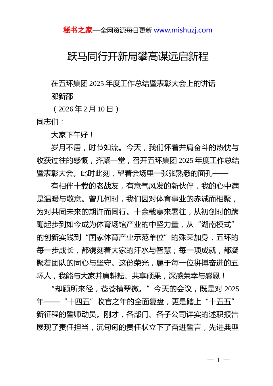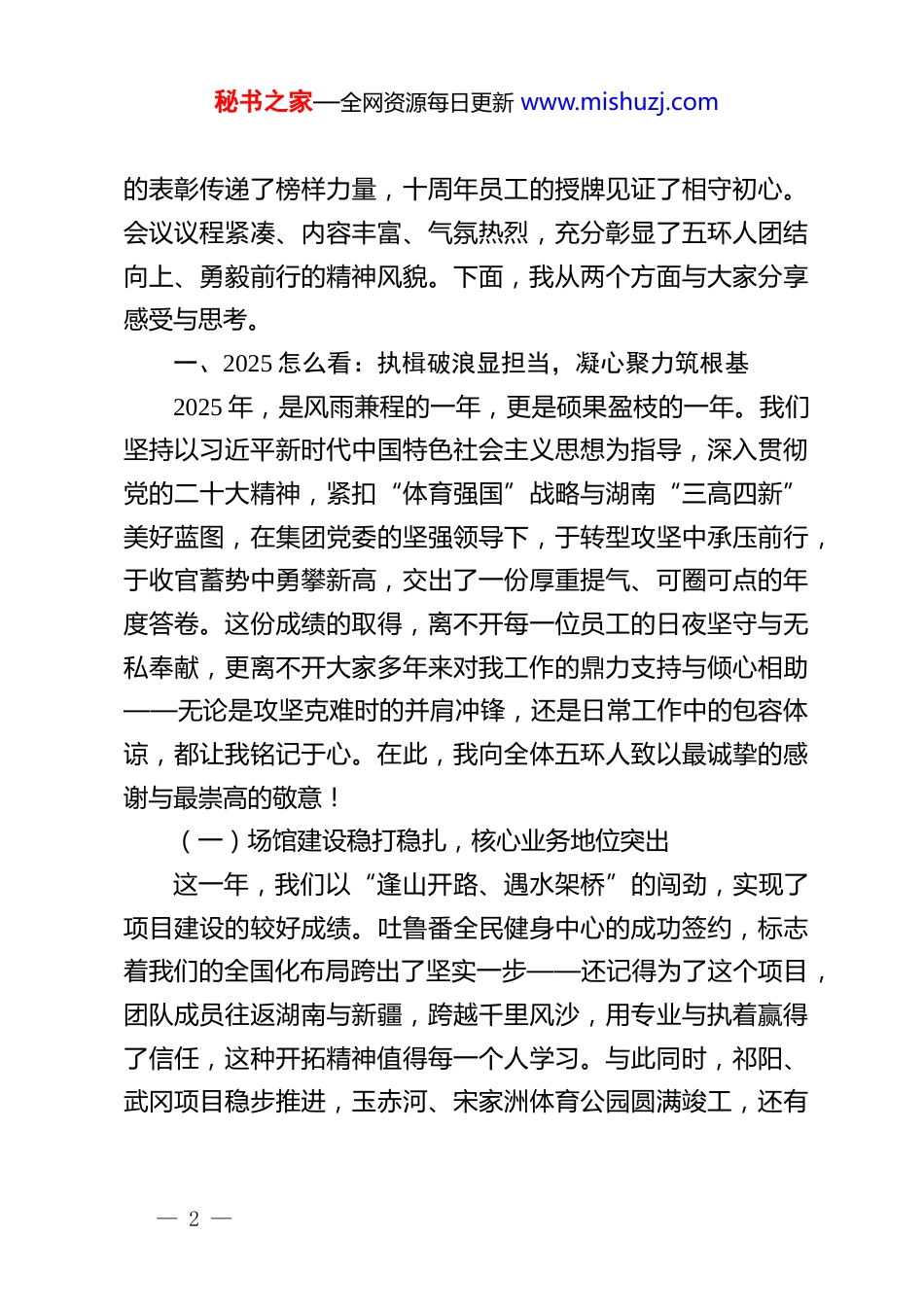 秘书之家—全网资源每日更新 www.mishuzj.com跃马同行开新局攀高谋远启新程在五环集团 2025 年度工作总结暨表彰大会上的讲话邬新邵(2026 年 2 月 10 日)同志们:大家下午好!岁月不居,时节如流。今天,我们怀着并肩奋斗的热忱与收获过往的感慨,齐聚一堂,召开五环集团 2025 年度工作总结暨表彰大会。此时此刻,望着会场里一张张熟悉的面孔——有相伴十载的老战友,有意气风发的新伙伴,我的心中满是温暖与敬意。曾几何时,我们因对体育事业的赤诚而相聚,为对共同未来的期许而同行。十余载寒来暑往,从初创时的蹒跚起步到如今成为体育场馆产业的中坚力量,从“湖南模式”的创新实践到“国家体育产业示范单位”的殊荣加身,五环的每一步成长,都镌刻着大家的汗水与智慧;每一项成就,都凝聚着团队的同心与坚守。这份荣光,属于每一位拼搏奋进的五环人,我能与大家并肩耕耘、共享硕果,深感荣幸与感恩!“却顾所来径,苍苍横翠微。”今天的会议,既是对 2025年——“十四五”收官之年的全面复盘,更是踏上“十五五”新征程的誓师动员。刚才,各部门、各子公司详实的述职报告展现了责任担当,沉甸甸的责任状立下了奋进誓言,先进典型— 1 —秘书之家—全网资源每日更新 www.mishuzj.com的表彰传递了榜样力量,十周年员工的授牌见证了相守初心。会议议程紧凑、内容丰富、气氛热烈,充分彰显了五环人团结向上、勇毅前行的精神风貌。下面,我从两个方面与大家分享感受与思考。一、2025 怎么看:执楫破浪显担当,凝心聚力筑根基2025 年,是风雨兼程的一年,更是硕果盈枝的一年。我们坚持以习近平新时代中国特色社会主义思想为指导,深入贯彻党的二十大精神,紧扣“体育强国”战略与湖南“三高四新”美好蓝图,在集团党委的坚强领导下,于转型攻坚中承压前行,于收官蓄势中勇攀新高,交出了一份厚重提气、可圈可点的年度答卷。这份成绩的取得,离不开每一位员工的日夜坚守与无私奉献,更离不开大家多年来对我工作的鼎力支持与倾心相助——无论是攻坚克难时的并肩冲锋,还是日常工作中的包容体谅,都让我铭记于心。在此,我向全体五环人致以最诚挚的感谢与最崇高的敬意!(一)场馆建设稳打稳扎,核心业务地位突出这一年,我们以“逢山开路、遇水架桥”的闯劲,实现了项目建设的较好成绩。吐鲁番全民健身中心的成功签约,标志着我们的全国化布局跨出了坚实一步——还记得为了这个项目,团队成员往返湖南与新疆,跨越千里风沙,用专业与执着赢得了信任,这种开拓精神值得每一个人学习。与此同时,祁阳、武冈项目稳步推进,玉赤河、宋家洲体育公园圆满竣工,还有— 2 —秘书之家—全网资源每日更新 www.mishuzj.com10 余个新项目达成了合作意向,项目储备持续充盈。每一个项目的推进,都是五环人“敢啃硬骨头、敢涉险滩”的生动写照,更是我们深耕体育场馆产业的坚实根基。(二)场馆运营焕新提质,品牌影响持续升级这一年,我们积极响应省委、省政府“以赛兴城、以赛兴旅”的部署,让体育场馆成为城市活力的“发动机”。成功引进承办 CBA 俱乐部杯赛,精心运营湖南省“公仆杯”、湖南省乡村气排球赛等品牌赛事,每一场精彩纷呈的活动背后,都凝聚着运营团队的专业与用心——是你们熬夜打磨方案,是你们现场全力保障,让体育的魅力感染更多人,既提升了公司品牌影响力,更带动了周边消费活力。而长沙市工人文化宫(一宫)项目的成功中标,更为我们轻资产运营模式的推广打开了全新空间,让“五环运营”的品牌价值愈发凸显。(三)风险化解成效显著,发展底气更加充足这一年,我们以“不回避、不退缩”的勇气,直面历史遗留问题,累计完成回款 2.36 亿元。谈及邵阳片区的回款工作,我由衷为大家的付出感到自豪——邵阳片区公司的同志们,一次次沟通协调,一遍遍攻坚突破,最终实现邵阳体育中心 BT回款 14495.5 万元、紫霞星苑安置房回款 2500 万元;岳阳城陵矶项目的突破性进展,更是团队智慧的结晶,不仅完成收储回款 5291 万元,更就项目再建达成共识。正是这份“钉钉子”精神,让我们卸下了部分包袱,为后续发展注入了强劲现金流。— 3 —秘书之家—全...