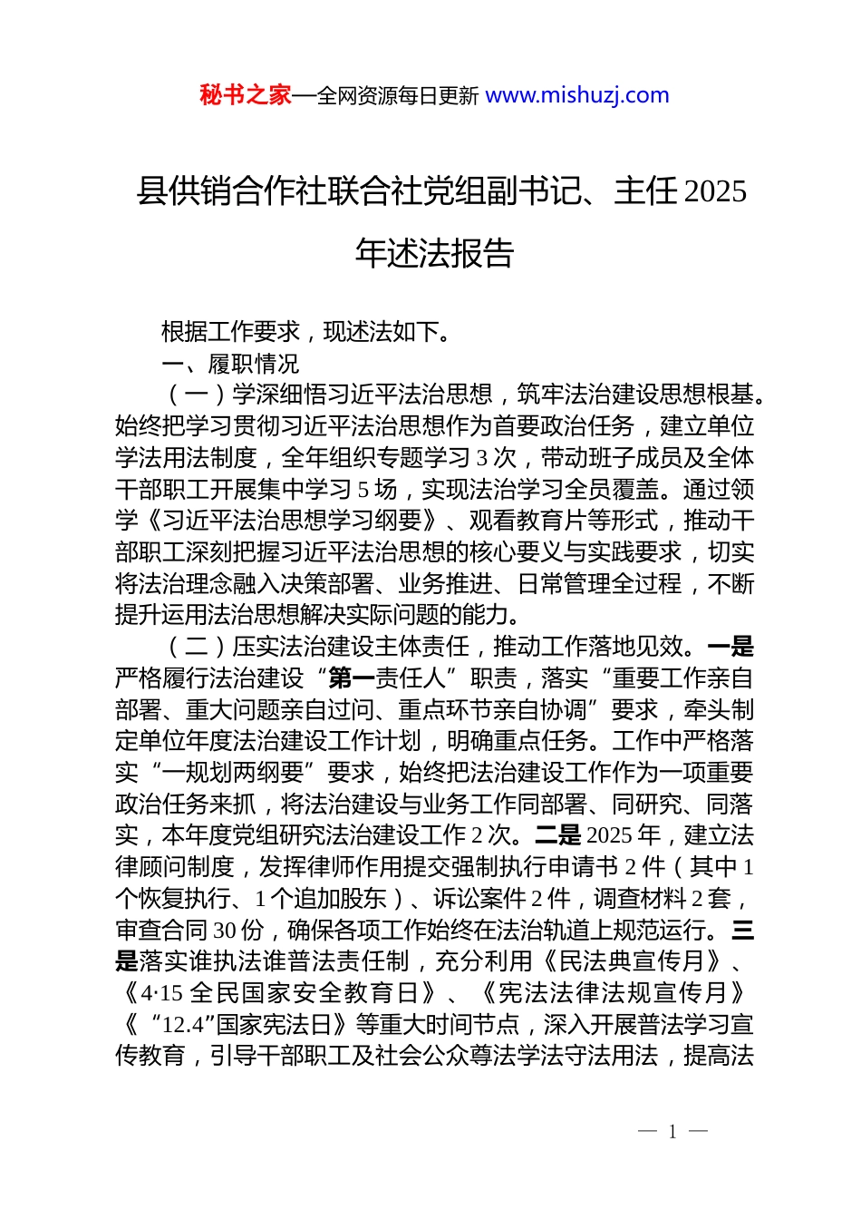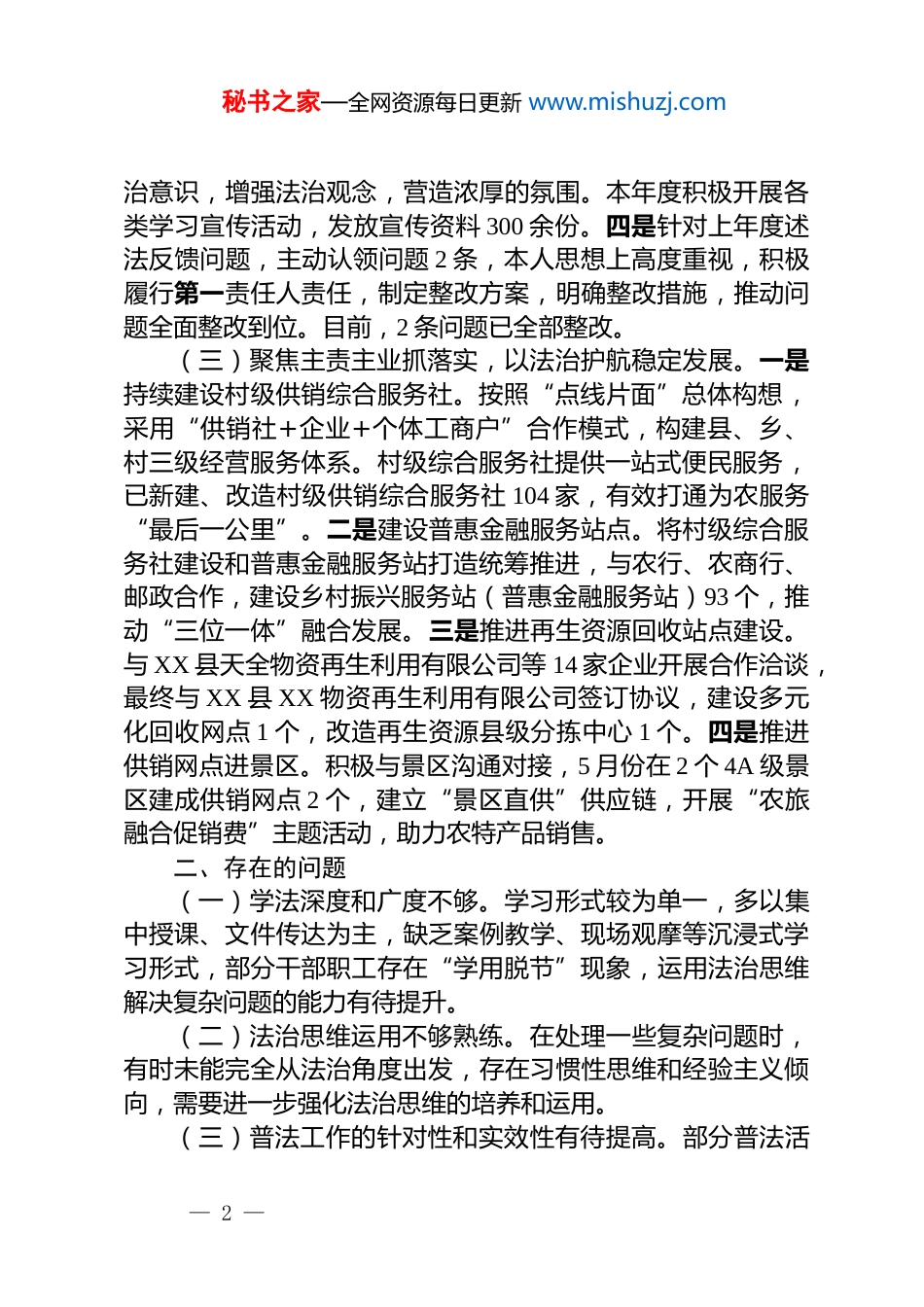 秘书之家—全网资源每日更新 www.mishuzj.com县供销合作社联合社党组副书记、主任 2025年述法报告根据工作要求,现述法如下。一、履职情况(一)学深细悟习近平法治思想,筑牢法治建设思想根基。始终把学习贯彻习近平法治思想作为首要政治任务,建立单位学法用法制度,全年组织专题学习 3 次,带动班子成员及全体干部职工开展集中学习 5 场,实现法治学习全员覆盖。通过领学《习近平法治思想学习纲要》、观看教育片等形式,推动干部职工深刻把握习近平法治思想的核心要义与实践要求,切实将法治理念融入决策部署、业务推进、日常管理全过程,不断提升运用法治思想解决实际问题的能力。(二)压实法治建设主体责任,推动工作落地见效。一是严格履行法治建设“第一责任人”职责,落实“重要工作亲自部署、重大问题亲自过问、重点环节亲自协调”要求,牵头制定单位年度法治建设工作计划,明确重点任务。工作中严格落实“一规划两纲要”要求,始终把法治建设工作作为一项重要政治任务来抓,将法治建设与业务工作同部署、同研究、同落实,本年度党组研究法治建设工作 2 次。二是 2025 年,建立法律顾问制度,发挥律师作用提交强制执行申请书 2 件(其中 1个恢复执行、1 个追加股东)、诉讼案件 2 件,调查材料 2 套,审查合同 30 份,确保各项工作始终在法治轨道上规范运行。三是落实谁执法谁普法责任制,充分利用《民法典宣传月》、《4·15 全民国家安全教育日》、《宪法法律法规宣传月》《“12.4”国家宪法日》等重大时间节点,深入开展普法学习宣传教育,引导干部职工及社会公众尊法学法守法用法,提高法— 1 —秘书之家—全网资源每日更新 www.mishuzj.com治意识,增强法治观念,营造浓厚的氛围。本年度积极开展各类学习宣传活动,发放宣传资料 300 余份。四是针对上年度述法反馈问题,主动认领问题 2 条,本人思想上高度重视,积极履行第一责任人责任,制定整改方案,明确整改措施,推动问题全面整改到位。目前,2 条问题已全部整改。(三)聚焦主责主业抓落实,以法治护航稳定发展。一是持续建设村级供销综合服务社。按照“点线片面”总体构想,采用“供销社+企业+个体工商户”合作模式,构建县、乡、村三级经营服务体系。村级综合服务社提供一站式便民服务,已新建、改造村级供销综合服务社 104 家,有效打通为农服务“最后一公里”。二是建设普惠金融服务站点。将村级综合服务社建设和普惠金融服务站打造统筹推进,与农行、农商行、邮政合作,建设乡村振兴服务站(普惠金融服务站)93 个,推动“三位一体”融合发展。三是推进再生资源回收站点建设。与 XX 县天全物资再生利用有限公司等 14 家企业开展合作洽谈,最终与 XX 县 XX 物资再生利用有限公司签订协议,建设多元化回收网点 1 个,改造再生资源县级分拣中心 1 个。四是推进供销网点进景区。积极与景区沟通对接,5 月份在 2 个 4A 级景区建成供销网点 2 个,建立“景区直供”供应链,开展“农旅融合促销费”主题活动,助力农特产品销售。二、存在的问题(一)学法深度和广度不够。学习形式较为单一,多以集中授课、文件传达为主,缺乏案例教学、现场观摩等沉浸式学习形式,部分干部职工存在“学用脱节”现象,运用法治思维解决复杂问题的能力有待提升。(二)法治思维运用不够熟练。在处理一些复杂问题时,有时未能完全从法治角度出发,存在习惯性思维和经验主义倾向,需要进一步强化法治思维的培养和运用。(三)普法工作的针对性和实效性有待提高。部分普法活— 2 —秘书之家—全网资源每日更新 www.mishuzj.com动形式较为单一,对不同群体的差异化需求关注不够,需要进一步创新普法内容和形式,提高普法的精准性和吸引力。三、下一步工作(一)深化法治学习教育,提升法治素养。丰富学习形式,采取“线上+线下”“理论+案例”相结合的方式,邀请律师开展专题讲座,组织干部职工参与法治案例研讨、模拟调解等活动,推动法治学习往深里走、往实里走,切实提升全员依法履职能力。(二)强化法治思维,提升法治思维和法治水平。在工作中自觉运用法治思维和法治方式...