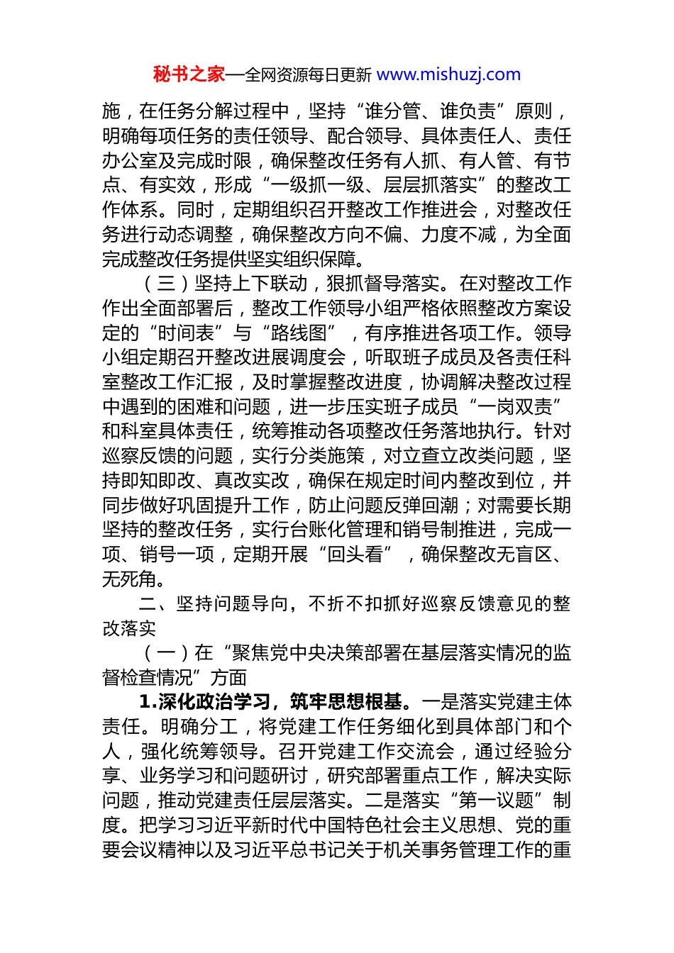 秘书之家—全网资源每日更新 www.mishuzj.com县机关事务服务中心关于县委巡察组反馈意见整改进展情况报告据县委统一部署,2024 年 X 月 X 日至 X 月 XX 日,县委第四巡察组对县机关事务服务中心党支部进行了巡察。2024 年 XX 月 XX 日,县委第四巡察组向县人民政府办公室党支部(机关事务服务中心)反馈了巡察意见。按照巡察工作有关要求,现将巡察整改进展情况予报告如下。一、强化责任担当,把巡察整改作为重大政治任务抓紧抓实抓好(一)提高思想认识,把握整改要求。巡察反馈会后,县人民政府办公室党支部(机关事务服务中心)第一时间召开专题会议,全面传达学习巡察反馈意见,深入研究部署整改工作。会议深刻剖析巡察反馈问题根源,强调要以此次巡察整改为契机,切实解决工作中的短板弱项。通过层层传达学习、专题研讨交流,单位上下进一步统一思想、强化认识,深刻认识到巡察整改是检验“四个意识”的试金石,必须以坚决态度、有效办法、果断措施,不折不扣把巡察整改作为重大政治任务抓实抓好,确保件件有着落、事事有回音。(二)加强组织领导,明确整改任务。为确保整改工作有力推进,成立了以党支部书记为组长,中心主任为副组长,其他班子成员及各科室负责人为成员的整改工作领导小组,形成“主要领导亲自抓、分管领导具体抓、全体人员共同参与”的工作格局。下设办公室,由专人负责整改工作的统筹协调及督促落实,为整改落地提供组织保障。依据《XX 县委第四巡察组巡察反馈意见的整改方案》,严格对照整改方案和问题台账,聚焦薄弱环节强化责任落实。通过对整改方案逐项分解,精准制定整改措秘书之家—全网资源每日更新 www.mishuzj.com施,在任务分解过程中,坚持“谁分管、谁负责”原则,明确每项任务的责任领导、配合领导、具体责任人、责任办公室及完成时限,确保整改任务有人抓、有人管、有节点、有实效,形成“一级抓一级、层层抓落实”的整改工作体系。同时,定期组织召开整改工作推进会,对整改任务进行动态调整,确保整改方向不偏、力度不减,为全面完成整改任务提供坚实组织保障。(三)坚持上下联动,狠抓督导落实。在对整改工作作出全面部署后,整改工作领导小组严格依照整改方案设定的“时间表”与“路线图”,有序推进各项工作。领导小组定期召开整改进展调度会,听取班子成员及各责任科室整改工作汇报,及时掌握整改进度,协调解决整改过程中遇到的困难和问题,进一步压实班子成员“一岗双责”和科室具体责任,统筹推动各项整改任务落地执行。针对巡察反馈的问题,实行分类施策,对立查立改类问题,坚持即知即改、真改实改,确保在规定时间内整改到位,并同步做好巩固提升工作,防止问题反弹回潮;对需要长期坚持的整改任务,实行台账化管理和销号制推进,完成一项、销号一项,定期开展“回头看”,确保整改无盲区、无死角。二、坚持问题导向,不折不扣抓好巡察反馈意见的整改落实(一)在“聚焦党中央决策部署在基层落实情况的监督检查情况”方面1.深化政治学习,筑牢思想根基。一是落实党建主体责任。明确分工,将党建工作任务细化到具体部门和个人,强化统筹领导。召开党建工作交流会,通过经验分享、业务学习和问题研讨,研究部署重点工作,解决实际问题,推动党建责任层层落实。二是落实“第一议题”制度。把学习习近平新时代中国特色社会主义思想、党的重要会议精神以及习近平总书记关于机关事务管理工作的重秘书之家—全网资源每日更新 www.mishuzj.com要指示批示作为重点。每次学习后随机安排干部研讨发言,分享心得,促进理论与实践结合。巡察反馈后,开展29 次集中学习、17 次中央八项规定专题学习、6 次主题党日,为整改工作奠定思想基础。三是丰富学习形式。结合“党旗映天山”主题党日,围绕习近平总书记关于机关事务管理工作的论述开展多样学习。组织本县党员干部“走出去”,学习其他市县先进模式,观摩市级干部周转房维修改造、绿色食堂建设及公务仓建设,通过现场交流提升干部业务能力。2.聚焦服务保障,提升服务效能。一是开展宣传与整治。在办公楼设置卫生宣传标语和分类垃圾桶,引导干部职工养成良好习惯。...