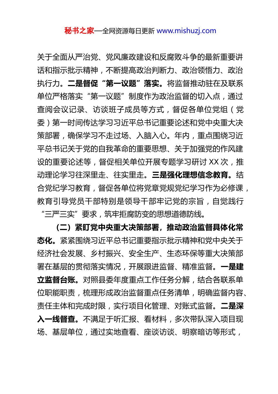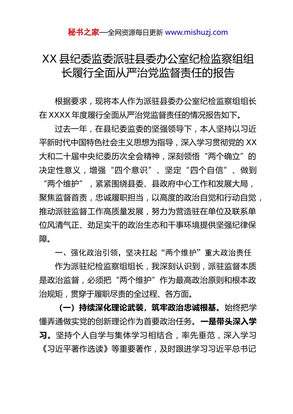 秘书之家—全网资源每日更新 www.mishuzj.comXX 县纪委监委派驻县委办公室纪检监察组组长履行全面从严治党监督责任的报告根据要求,现将本人作为派驻县委办公室纪检监察组组长在 XXXX 年度履行全面从严治党监督责任的情况报告如下。过去一年,在县纪委监委的坚强领导下,本人坚持以习近平新时代中国特色社会主义思想为指导,深入学习贯彻党的 XX大和二十届中央纪委历次全会精神,深刻领悟“两个确立”的决定性意义,增强“四个意识”、坚定“四个自信”、做到“两个维护”,紧紧围绕县委、县政府中心工作和发展大局,聚焦监督首责,忠诚履职担当,以高度的政治自觉和行动自觉,推动派驻监督工作高质量发展,努力为营造驻在单位及联系单位风清气正、劲足实干的政治生态和干事环境提供坚强纪律保障。一、强化政治引领,坚决扛起“两个维护”重大政治责任作为派驻纪检监察组组长,我深刻认识到,派驻监督本质是政治监督,必须把“两个维护”作为最高政治原则和根本政治规矩,贯穿于履职尽责的全过程、各方面。(一)持续深化理论武装,筑牢政治忠诚根基。始终把学懂弄通做实党的创新理论作为首要政治任务。一是带头深入学习。坚持个人自学与集体学习相结合,率先垂范,深入学习《习近平著作选读》等重要著作,及时跟进学习习近平总书记秘书之家—全网资源每日更新 www.mishuzj.com关于全面从严治党、党风廉政建设和反腐败斗争的最新重要讲话和指示批示精神,不断提高政治判断力、政治领悟力、政治执行力。二是督促“第一议题”落实。将监督推动驻在及联系单位严格落实“第一议题”制度作为政治监督的切入点,通过查阅会议记录、访谈班子成员等方式,督促各单位党组(党委)第一时间传达学习习近平总书记重要论述和党中央重大决策部署,确保学习不走过场、入脑入心。年内,重点围绕习近平总书记关于党的自我革命的重要思想、关于加强党的作风建设的重要论述等,督促相关单位开展专题学习研讨 XX 次,推动理论学习往深里走、往实里走。三是强化理想信念教育。结合党纪学习教育,督促各单位将党章党规党纪学习作为必修课,教育引导党员干部特别是领导干部牢记党的宗旨,自觉践行“三严三实”要求,筑牢拒腐防变的思想道德防线。(二)紧盯党中央重大决策部署,推动政治监督具体化常态化。紧紧围绕习近平总书记重要指示批示精神和党中央关于经济社会发展、乡村振兴、安全生产、生态环保等重大决策部署在基层的贯彻落实情况,开展跟进监督、精准监督。一是建立监督台账。对照县委年度重点工作任务分解,结合各联系单位职能职责,梳理形成政治监督重点任务清单,明确监督内容、责任主体和完成时限,实行项目化管理、对账式监督。二是深入一线督查。不满足于听汇报、看材料,多次带队深入项目现场、基层单位,通过实地查看、座谈访谈、明察暗访等形式,秘书之家—全网资源每日更新 www.mishuzj.com了解真实情况,发现并推动解决政策落实中的“中梗阻”问题。例如,在围绕乡村振兴领域政策落实监督中,发现个别项目资金拨付不及时问题,及时向主管部门发出提醒函,督促限期整改,确保了惠农政策精准落地。三是严明政治纪律和政治规矩。高度关注并坚决纠治在贯彻落实党中央决策部署上打折扣、搞变通、做选择等问题,以及对党不忠诚不老实,口是心非、阳奉阴违等行为,维护政令畅通。二、聚焦关键环节,压紧压实全面从严治党主体责任全面从严治党,关键是抓住主体责任这个“牛鼻子”。我组将督促各联系单位党组织履行好管党治党政治责任作为监督工作的重中之重。(一)推动主体责任层层传导。一是强化压力传导。通过参加或列席各单位党组(党委)会议、党风廉政建设专题会议等,及时传达上级关于全面从严治党的新精神新要求,提醒督促“一把手”和领导班子成员切实履行“第一责任人”责任和“一岗双责”。年初,督促各联系单位制定全面从严治党主体责任清单和年度任务安排,将责任细化到岗、落实到人。二是开展履责约谈。年内,围绕落实主体责任、加强廉洁风险防控、抓好作风建设等主题,与各联系单位“一把手”开展谈心谈话XX 人次,与领导班子其他成员、重点岗位负责人开展工作约谈X...