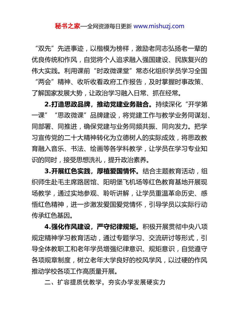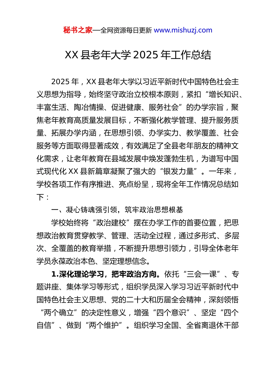 秘书之家—全网资源每日更新 www.mishuzj.comXX 县老年大学 2025 年工作总结2025 年,XX 县老年大学以习近平新时代中国特色社会主义思想为指导,始终坚守政治立校根本原则,紧扣“增长知识、丰富生活、陶冶情操、促进健康、服务社会”的办学宗旨,聚焦老年教育高质量发展目标,不断强化教学管理、提升服务质量、拓展办学内涵,在思想引领、办学实力、教学覆盖、社会服务等方面取得显著成效,有效满足了全县老年朋友的精神文化需求,让老年教育在县域发展中焕发蓬勃生机,为谱写中国式现代化 XX 县新篇章凝聚了强大的“银发力量”。一年来,学校各项工作有序推进、亮点纷呈,现将全年工作情况总结如下:一、凝心铸魂强引领,筑牢政治思想根基学校始终将“政治建校”摆在办学工作的首要位置,把思想政治教育贯穿教学、管理、活动全过程,通过多形式、多层次、全覆盖的教育举措,不断提升思想引领力,引导全体老年学员永葆政治本色、坚定理想信念。1.深化理论学习,把牢政治方向。依托“三会一课”、专题讲座、集体学习等形式,组织学员深入学习习近平新时代中国特色社会主义思想、党的二十大和历届全会精神,深刻领悟“两个确立”的决定性意义,增强“四个意识”、坚定“四个自信”、做到“两个维护”。组织学习全国、全省离退休干部秘书之家—全网资源每日更新 www.mishuzj.com“双先”先进事迹,以楷模为榜样,激励老同志弘扬老一辈的优良传统和作风,自觉将个人追求融入强国建设、民族复兴的伟大实践。利用课前“时政微课堂”常态化组织学员学习全国“两会”精神、收听收看政府工作报告,及时掌握时事政策、了解国家发展大势,让政治学习融入日常、抓在经常。2.打造思政品牌,推动党建业务融合。持续深化“开学第一课”“思政微课”品牌建设,将党建工作与教学业务同谋划、同部署、同推进,确保党建与业务同频共振、同向发力。把学习宣传党的二十大精神转化为立德树人的实际成效,将思政教育融入音乐、书法、绘画等各学科教学,让学员在学习专业知识的同时,接受思想洗礼,提升政治素养。3.开展红色实践,厚植爱国情怀。结合主题教育活动,组织师生赴毛主席路居馆、阳明堡飞机场等红色教育基地开展现场教学,通过实地参观、聆听讲解,让学员重温革命历史、感悟红色精神,进一步激发爱国爱党情怀,引导学员以实际行动传承红色基因。4.强化作风建设,严守纪律规矩。积极开展贯彻中央八项规定精神学习教育活动,通过专题学习、交流研讨等形式,引导全体教职工和老年学员增强纪律意识、规矩意识,自觉遵守各项规章制度,树立老年大学良好的校风学风,以过硬的作风推动学校各项工作高质量开展。二、扩容提质优教学,夯实办学发展硬实力秘书之家—全网资源每日更新 www.mishuzj.com针对老年学员的年龄特点、学习需求和接收能力,学校坚持“打基础、强素质、促提升”的办学思路,不断创新教学方法、丰富教学内容、打造特色活动,全面提升教学质量和办学水平,让老年大学真正成为学员们增长知识、陶冶情操的“幸福家园”。1.创新教学方法,适配老年学习需求。摒弃传统单一的教学模式,采用示范引领、互动交流、实操演练等灵活多样的教学方法,充分考虑老年学员的学习节奏和接受能力,做到“慢讲、细解、多练”。在书法、绘画等课程中,通过一对一指导、作品互评等方式提升学员实操能力;在智能手机摄影等实用课程中,以现场教学、案例讲解为主,让学员快速掌握操作技巧,极大激发了学员的学习积极性和主动性。2.丰富教学内容,覆盖多元学习领域。围绕老年朋友的兴趣爱好和实际需求,开设音乐、书法、绘画、诗词、摄影等多个专业课程,合理设置教学课时和教学内容,兼顾专业性和实用性。其中,智能手机摄影课程成为年度热门课程,通过系统教学,学员们熟练掌握了摄影构图、后期修图等技巧,不仅丰富了个人生活,更能用镜头记录生活美好。全年各项教学任务圆满完成,学员的专业技能和综合素养得到全面提升。3.打造特色活动,展现教学丰硕成果。以活动为载体,为学员搭建展示学习成果的平台,成功举办重阳节书画展,全校师生积极参与,用笔墨丹青描绘伟大祖国的繁荣昌盛,歌颂 XX...