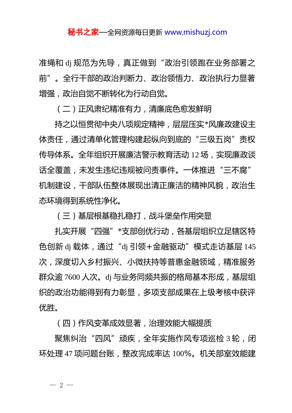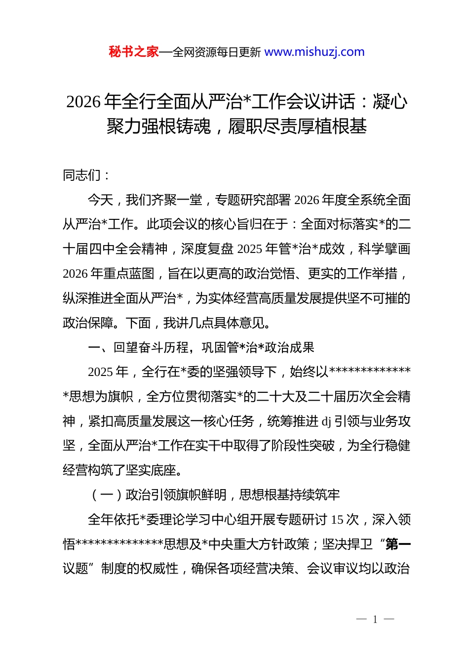 秘书之家—全网资源每日更新 www.mishuzj.com2026 年全行全面从严治*工作会议讲话:凝心聚力强根铸魂,履职尽责厚植根基同志们:今天,我们齐聚一堂,专题研究部署 2026 年度全系统全面从严治*工作。此项会议的核心旨归在于:全面对标落实*的二十届四中全会精神,深度复盘 2025 年管*治*成效,科学擘画2026 年重点蓝图,旨在以更高的政治觉悟、更实的工作举措,纵深推进全面从严治*,为实体经营高质量发展提供坚不可摧的政治保障。下面,我讲几点具体意见。一、回望奋斗历程,巩固管*治*政治成果2025 年,全行在*委的坚强领导下,始终以**************思想为旗帜,全方位贯彻落实*的二十大及二十届历次全会精神,紧扣高质量发展这一核心任务,统筹推进 dj 引领与业务攻坚,全面从严治*工作在实干中取得了阶段性突破,为全行稳健经营构筑了坚实底座。(一)政治引领旗帜鲜明,思想根基持续筑牢全年依托*委理论学习中心组开展专题研讨 15 次,深入领悟**************思想及*中央重大方针政策;坚决捍卫“第一议题”制度的权威性,确保各项经营决策、会议审议均以政治— 1 —秘书之家—全网资源每日更新 www.mishuzj.com准绳和 dj 规范为先导,真正做到“政治引领跑在业务部署之前”。全行干部的政治判断力、政治领悟力、政治执行力显著增强,政治自觉不断转化为行动自觉。(二)正风肃纪精准有力,清廉底色愈发鲜明持之以恒贯彻中央八项规定精神,层层压实*风廉政建设主体责任,通过清单化管理构建起纵向到底的“三级五岗”责权传导体系。全年组织开展廉洁警示教育活动 12 场,实现廉政谈话全覆盖,未发生违纪违规被问责事件。一体推进“三不腐”机制建设,干部队伍整体展现出清正廉洁的精神风貌,政治生态环境得到系统性净化。(三)基层根基稳扎稳打,战斗堡垒作用突显扎实开展“四强”*支部创优行动,各基层组织立足辖区特色创新 dj 载体,通过“dj 引领+金融驱动”模式走访基层 145次,深度切入乡村振兴、小微扶持等普惠金融领域,精准服务群众逾 7600 人次。dj 与业务同频共振的格局基本形成,基层组织的政治功能得到有力彰显,多项支部成果在上级考核中获评优胜。(四)作风变革成效显著,治理效能大幅提质聚焦纠治“四风”顽疾,全年实施作风专项巡检 3 轮,闭环处理 47 项问题台账,整改完成率达 100%。机关部室效能建— 2 —秘书之家—全网资源每日更新 www.mishuzj.com设显著提速,对基层一线的支撑响应率大幅提升,员工满意度指数较往年增长 6.2 个百分点。合规文化深度嵌入日常管理流程,全行运营质量呈现稳中有升的良好态势。在肯定成绩的同时,我们也要清醒意识到,对照上级*委的标准及高质量发展的要求,我行全面从严治*仍存薄弱环节:部分支部 dj 与经营的融合路径不够宽,品牌转化效能有待释放;少数*员干部学习的深度、广度不足,运用政治眼光破解业务难题的能力尚需磨炼;廉洁防控的颗粒度还不够细,制度执行的末端感知仍有空白。对此,我们必须采取有力措施予以解决。二、审视当前形势,强化从严治*的政治自觉置身于复杂多变的金融博弈环境,面对金融供给侧结构性改革的深度要求,全面从严治*不仅是政治要求,更是农商银行实现高质量发展的“硬支撑”与“主心骨”。从外部环境看,金融监管力度持续加大,监管层级对 dj 融入公司治理的颗粒度提出了更高、更细的要求;从内部转型看,我行正处于跨越发展的关键窗口期,改革举措能否落地生根,根本上取决于*组织的号召力和战斗力。实践反复证明,dj 抓得实,业务发展的成色就足;纪律树得牢,干事创业的氛围就浓。我们必须站在政治高度审视 dj 工作,以强烈的政治责任感推动管*治*走深走实。— 3 —秘书之家—全网资源每日更新 www.mishuzj.com三、锚定关键环节,谱写全面从严治*新篇章2026 年,全行全面从严治*工作要以**************思想为指引,紧跟*中央决策部署,结合经营实操,重点抓好以下五个维度。(一)强化政治统领,涵养忠诚政治品格始终将政治建设放在首位。持续完善“第一议题”学习机制,确保*委会“逢会必学政治、部署必析政治”。深入推进********...