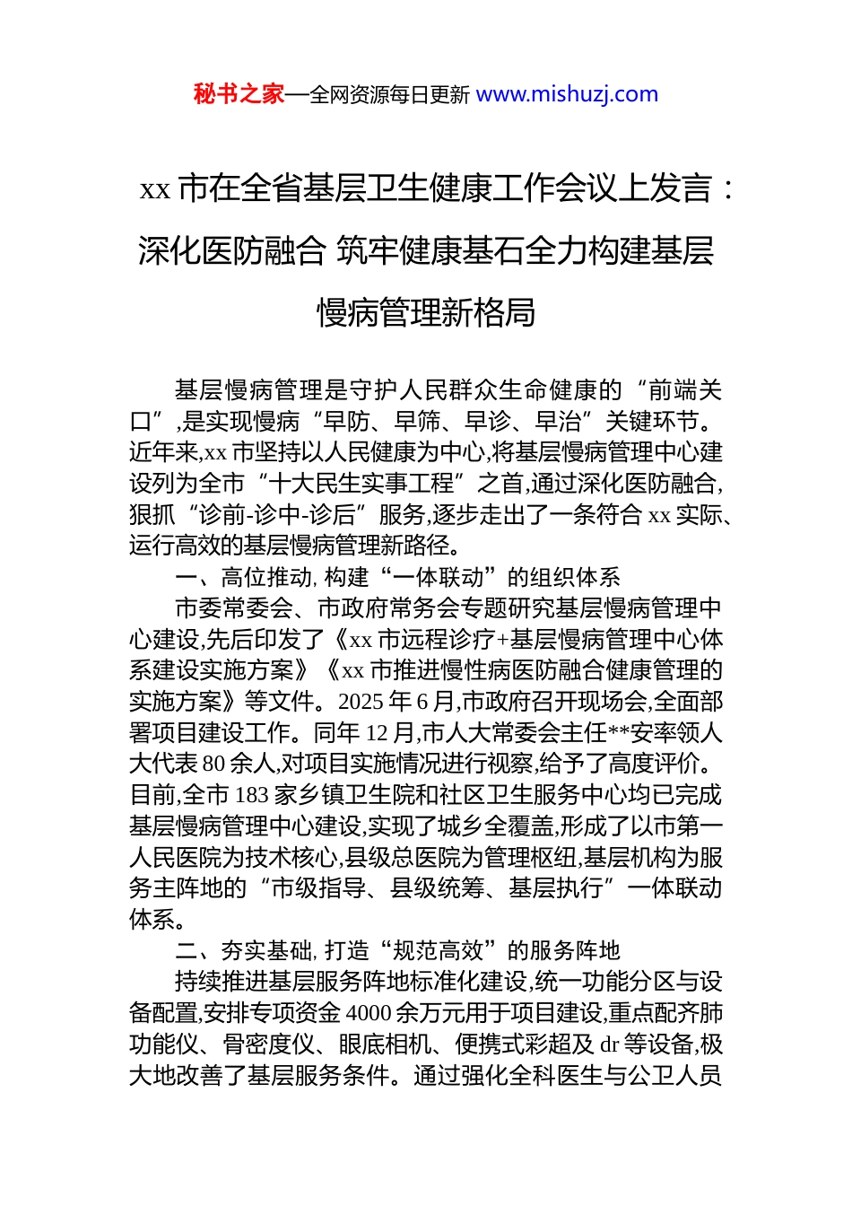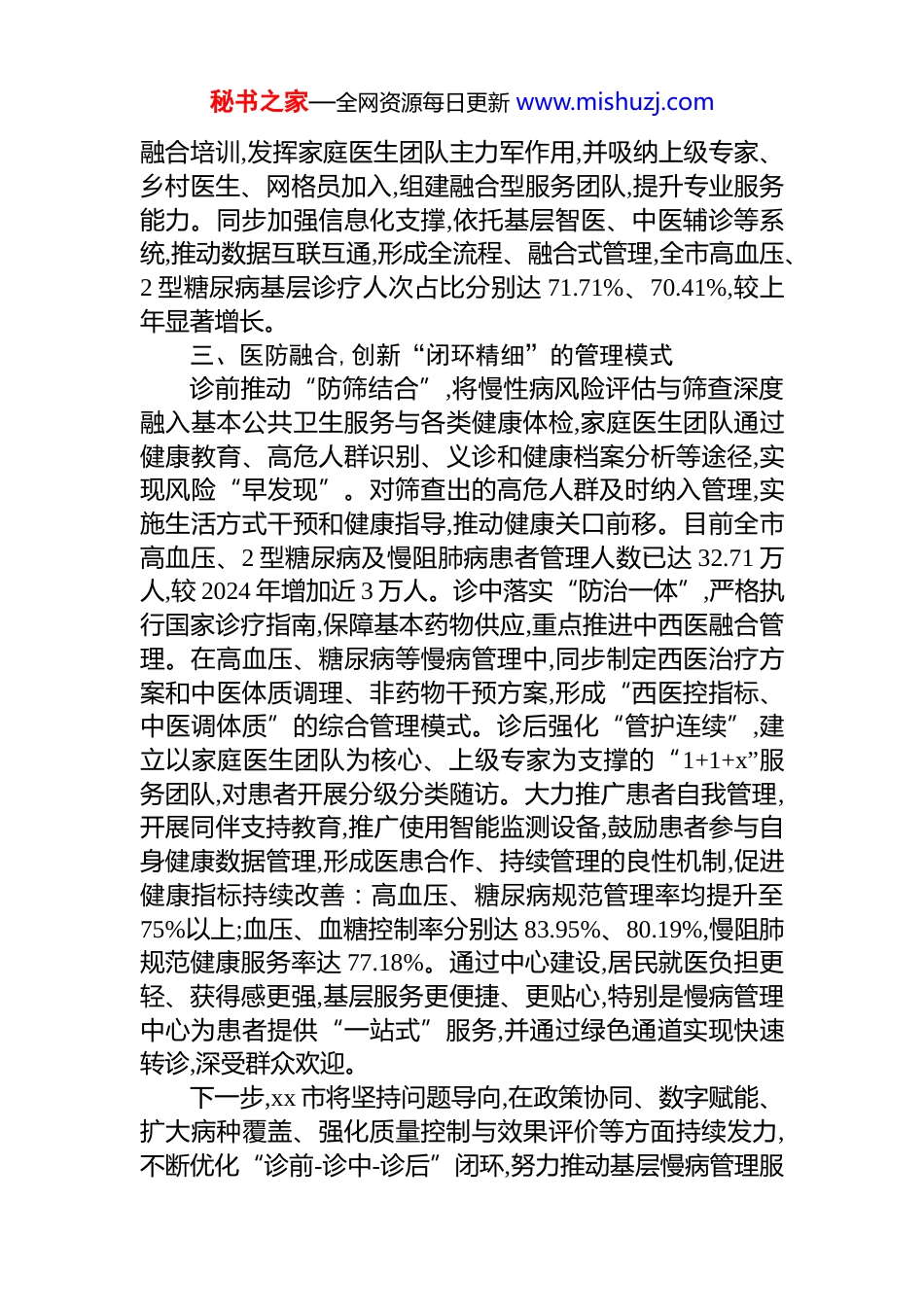 秘书之家—全网资源每日更新 www.mishuzj.comxx 市在全省基层卫生健康工作会议上发言:深化医防融合 筑牢健康基石全力构建基层慢病管理新格局基层慢病管理是守护人民群众生命健康的“前端关口”,是实现慢病“早防、早筛、早诊、早治”关键环节。近年来,xx 市坚持以人民健康为中心,将基层慢病管理中心建设列为全市“十大民生实事工程”之首,通过深化医防融合,狠抓“诊前-诊中-诊后”服务,逐步走出了一条符合 xx 实际、运行高效的基层慢病管理新路径。一、高位推动,构建“一体联动”的组织体系市委常委会、市政府常务会专题研究基层慢病管理中心建设,先后印发了《xx 市远程诊疗+基层慢病管理中心体系建设实施方案》《xx 市推进慢性病医防融合健康管理的实施方案》等文件。2025 年 6 月,市政府召开现场会,全面部署项目建设工作。同年 12 月,市人大常委会主任**安率领人大代表 80 余人,对项目实施情况进行视察,给予了高度评价。目前,全市 183 家乡镇卫生院和社区卫生服务中心均已完成基层慢病管理中心建设,实现了城乡全覆盖,形成了以市第一人民医院为技术核心,县级总医院为管理枢纽,基层机构为服务主阵地的“市级指导、县级统筹、基层执行”一体联动体系。二、夯实基础,打造“规范高效”的服务阵地持续推进基层服务阵地标准化建设,统一功能分区与设备配置,安排专项资金 4000 余万元用于项目建设,重点配齐肺功能仪、骨密度仪、眼底相机、便携式彩超及 dr 等设备,极大地改善了基层服务条件。通过强化全科医生与公卫人员秘书之家—全网资源每日更新 www.mishuzj.com融合培训,发挥家庭医生团队主力军作用,并吸纳上级专家、乡村医生、网格员加入,组建融合型服务团队,提升专业服务能力。同步加强信息化支撑,依托基层智医、中医辅诊等系统,推动数据互联互通,形成全流程、融合式管理,全市高血压、2 型糖尿病基层诊疗人次占比分别达 71.71%、70.41%,较上年显著增长。三、医防融合,创新“闭环精细”的管理模式诊前推动“防筛结合”,将慢性病风险评估与筛查深度融入基本公共卫生服务与各类健康体检,家庭医生团队通过健康教育、高危人群识别、义诊和健康档案分析等途径,实现风险“早发现”。对筛查出的高危人群及时纳入管理,实施生活方式干预和健康指导,推动健康关口前移。目前全市高血压、2 型糖尿病及慢阻肺病患者管理人数已达 32.71 万人,较 2024 年增加近 3 万人。诊中落实“防治一体”,严格执行国家诊疗指南,保障基本药物供应,重点推进中西医融合管理。在高血压、糖尿病等慢病管理中,同步制定西医治疗方案和中医体质调理、非药物干预方案,形成“西医控指标、中医调体质”的综合管理模式。诊后强化“管护连续”,建立以家庭医生团队为核心、上级专家为支撑的“1+1+x”服务团队,对患者开展分级分类随访。大力推广患者自我管理,开展同伴支持教育,推广使用智能监测设备,鼓励患者参与自身健康数据管理,形成医患合作、持续管理的良性机制,促进健康指标持续改善:高血压、糖尿病规范管理率均提升至75%以上;血压、血糖控制率分别达 83.95%、80.19%,慢阻肺规范健康服务率达 77.18%。通过中心建设,居民就医负担更轻、获得感更强,基层服务更便捷、更贴心,特别是慢病管理中心为患者提供“一站式”服务,并通过绿色通道实现快速转诊,深受群众欢迎。下一步,xx 市将坚持问题导向,在政策协同、数字赋能、扩大病种覆盖、强化质量控制与效果评价等方面持续发力,不断优化“诊前-诊中-诊后”闭环,努力推动基层慢病管理服秘书之家—全网资源每日更新 www.mishuzj.com务提质增效,为人民群众提供更加优质、连续、便捷的健康管理服务,为健康江西建设贡献更多 xx 实践与基层智慧。