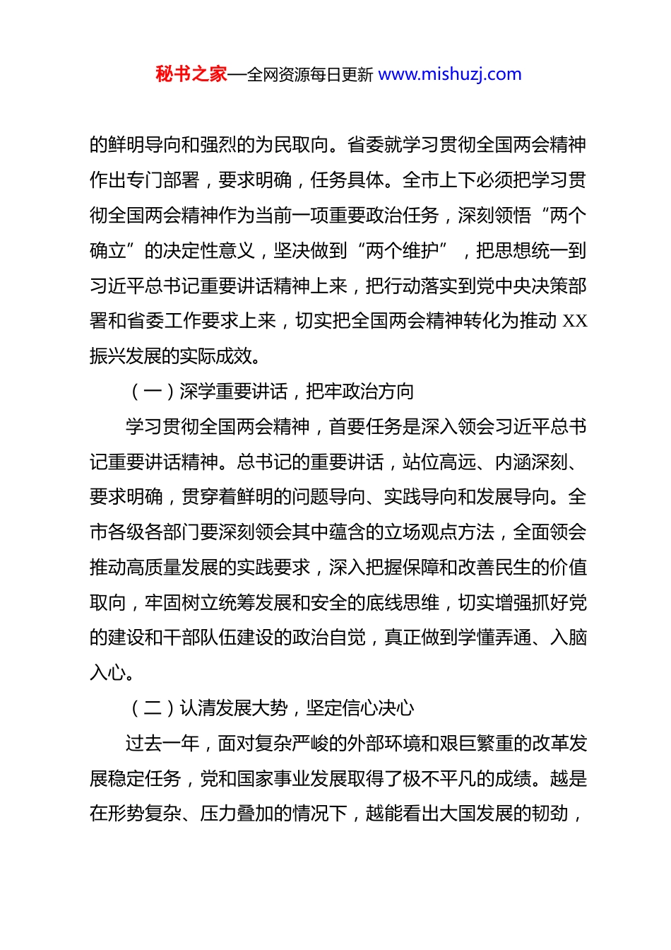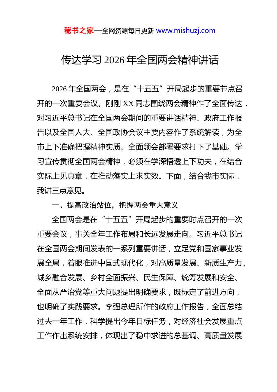 秘书之家—全网资源每日更新 www.mishuzj.com传达学习 2026 年全国两会精神讲话 2026 年全国两会,是在“十五五”开局起步的重要节点召开的一次重要会议。刚刚 XX 同志围绕两会精神作了全面传达,对习近平总书记在全国两会期间的重要讲话精神、政府工作报告以及全国人大、全国政协会议主要内容作了系统解读,为全市上下准确把握精神实质、全面领会部署要求打下了基础。学习宣传贯彻全国两会精神,必须在学深悟透上下功夫,在结合实际上见真章,在推动落实上求实效。下面,结合我市实际,我讲三点意见。一、提高政治站位,把握两会重大意义全国两会是在“十五五”开局起步的重要时点召开的一次重要会议,事关全年工作布局和长远发展走向。习近平总书记在全国两会期间发表的一系列重要讲话,立足党和国家事业发展全局,着眼推进中国式现代化,对高质量发展、新质生产力、城乡融合发展、乡村全面振兴、民生保障、统筹发展和安全、全面从严治党等重大问题提出明确要求,既标定了前进方向,也明确了实践要求。李强总理所作的政府工作报告,全面总结过去一年工作,科学提出今年目标任务,对经济社会发展重点工作作出系统安排,体现出了稳中求进的总基调、高质量发展秘书之家—全网资源每日更新 www.mishuzj.com的鲜明导向和强烈的为民取向。省委就学习贯彻全国两会精神作出专门部署,要求明确,任务具体。全市上下必须把学习贯彻全国两会精神作为当前一项重要政治任务,深刻领悟“两个确立”的决定性意义,坚决做到“两个维护”,把思想统一到习近平总书记重要讲话精神上来,把行动落实到党中央决策部署和省委工作要求上来,切实把全国两会精神转化为推动 XX振兴发展的实际成效。(一)深学重要讲话,把牢政治方向学习贯彻全国两会精神,首要任务是深入领会习近平总书记重要讲话精神。总书记的重要讲话,站位高远、内涵深刻、要求明确,贯穿着鲜明的问题导向、实践导向和发展导向。全市各级各部门要深刻领会其中蕴含的立场观点方法,全面领会推动高质量发展的实践要求,深入把握保障和改善民生的价值取向,牢固树立统筹发展和安全的底线思维,切实增强抓好党的建设和干部队伍建设的政治自觉,真正做到学懂弄通、入脑入心。(二)认清发展大势,坚定信心决心过去一年,面对复杂严峻的外部环境和艰巨繁重的改革发展稳定任务,党和国家事业发展取得了极不平凡的成绩。越是在形势复杂、压力叠加的情况下,越能看出大国发展的韧劲,秘书之家—全网资源每日更新 www.mishuzj.com也越能看出党中央驾驭全局、应对风险、推动发展的能力和定力。对我市来说,学习领会这些成绩,关键是从中看到前进的方向、发展的支撑和工作的着力点,进一步坚定信心、保持清醒,既要善于在大局中把握机遇,也要勇于在发展中正视短板,始终立足实际谋工作、抓落实。(三)紧扣目标任务,明晰工作重点全国两会对今年工作的部署,政策取向清晰,任务安排具体,许多部署与我市发展需求高度契合。无论是培育新质生产力、推进“人工智能+”行动,还是扩大有效需求、推进设备更新和消费品以旧换新,抑或是抓好黑土地保护、完善民生保障体系,都为我们争取政策、谋划项目、推动发展提供了重要依据。全市各级各部门要紧扣两会部署,结合自身职责,认真研究政策指向,系统梳理工作重点,找准与我市产业转型、乡村振兴、民生改善、安全稳定等工作的结合点,尽快把政策机遇转化为工作抓手,把部署要求转化为落实清单,把目标任务转化为发展实绩,确保全国两会精神在 XX 落到实处、见到实效。二、紧扣两会部署,扛牢发展重点任务学习贯彻全国两会精神,关键在落实,重点在见效。各级各部门要紧扣党中央决策部署和政府工作报告明确的目标任务,立足“十五五”开局起步这个重要节点,把稳增长、调结构、秘书之家—全网资源每日更新 www.mishuzj.com促改革、惠民生、防风险、强党建各项工作统筹起来,把政策要求细化为工作举措,把任务部署落实到具体项目,推动高质量发展不断取得新成效。(一)抓项目扩投资,夯实发展支撑项目和投资始终是稳增长、强后劲的重要抓手。要把项目建设摆在更加突出的位置,围绕政策导向、...