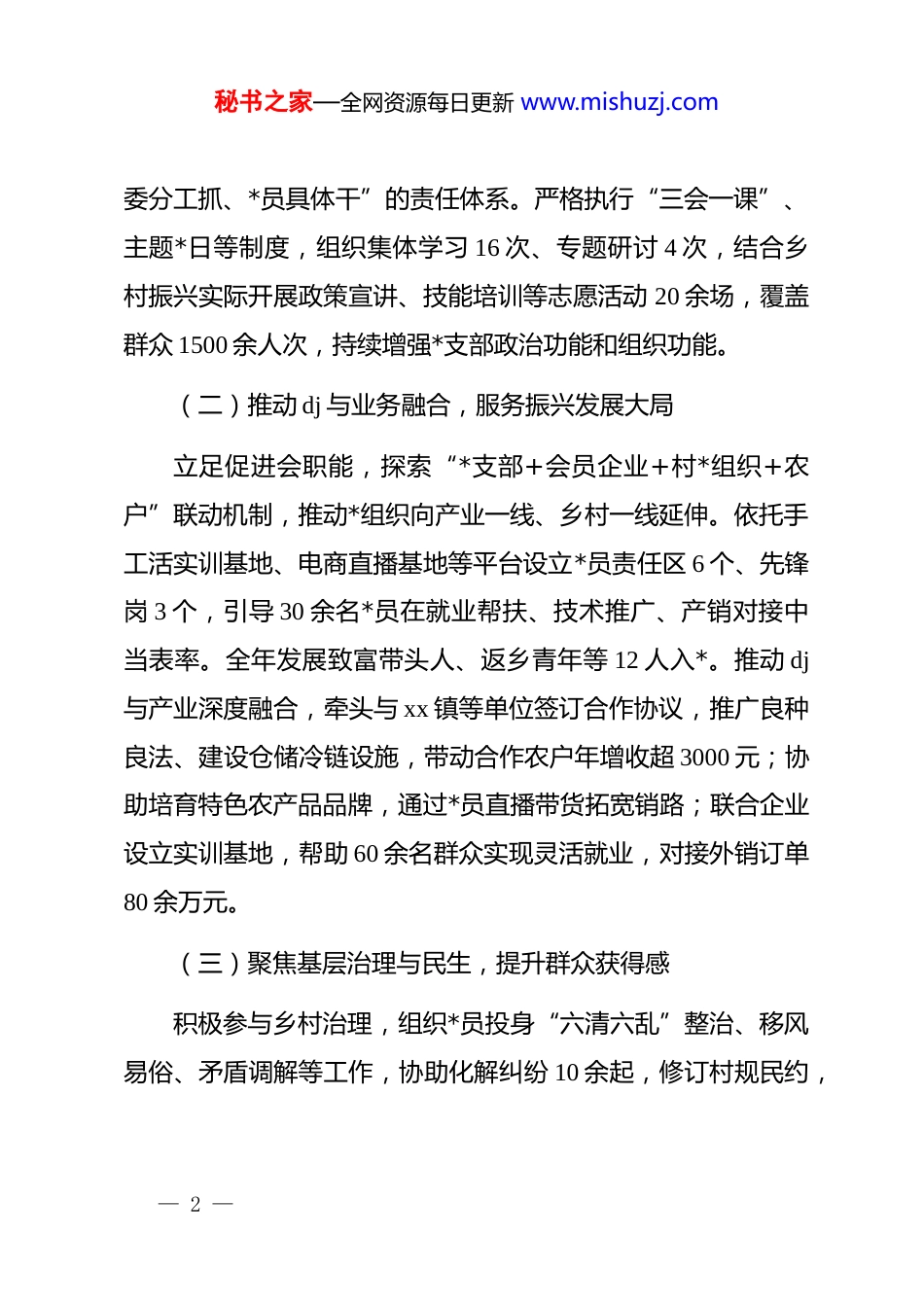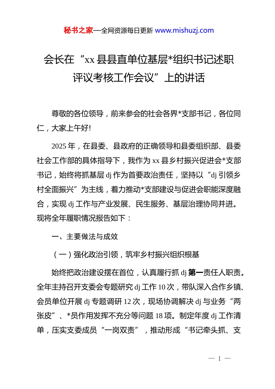 秘书之家—全网资源每日更新 www.mishuzj.com会长在“xx 县县直单位基层*组织书记述职评议考核工作会议”上的讲话尊敬的各位领导,前来参会的社会各界*支部书记,各位同仁,大家上午好!2025 年,在县委、县政府的正确领导和县委组织部、县委社会工作部的具体指导下,我作为 xx 县乡村振兴促进会*支部书记,始终将抓基层 dj 作为首要政治责任,坚持以“dj 引领乡村全面振兴”为主线,着力推动*支部建设与促进会职能深度融合,实现 dj 工作与产业发展、民生服务、基层治理协同并进。现将全年履职情况报告如下:一、主要做法与成效(一)强化政治引领,筑牢乡村振兴组织根基始终把政治建设摆在首位,认真履行抓 dj 第一责任人职责。全年主持召开支委会专题研究 dj 工作 10 次,带队深入合作乡镇、会员单位开展 dj 专题调研 12 次,现场协调解决 dj 与业务“两张皮”、*员作用发挥不充分等问题 18 项。制定年度 dj 工作清单,压实支委成员“一岗双责”,推动形成“书记牵头抓、支— 1 —秘书之家—全网资源每日更新 www.mishuzj.com委分工抓、*员具体干”的责任体系。严格执行“三会一课”、主题*日等制度,组织集体学习 16 次、专题研讨 4 次,结合乡村振兴实际开展政策宣讲、技能培训等志愿活动 20 余场,覆盖群众 1500 余人次,持续增强*支部政治功能和组织功能。(二)推动 dj 与业务融合,服务振兴发展大局立足促进会职能,探索“*支部+会员企业+村*组织+农户”联动机制,推动*组织向产业一线、乡村一线延伸。依托手工活实训基地、电商直播基地等平台设立*员责任区 6 个、先锋岗 3 个,引导 30 余名*员在就业帮扶、技术推广、产销对接中当表率。全年发展致富带头人、返乡青年等 12 人入*。推动 dj与产业深度融合,牵头与 xx 镇等单位签订合作协议,推广良种良法、建设仓储冷链设施,带动合作农户年增收超 3000 元;协助培育特色农产品品牌,通过*员直播带货拓宽销路;联合企业设立实训基地,帮助 60 余名群众实现灵活就业,对接外销订单80 余万元。(三)聚焦基层治理与民生,提升群众获得感积极参与乡村治理,组织*员投身“六清六乱”整治、移风易俗、矛盾调解等工作,协助化解纠纷 10 余起,修订村规民约,— 2 —秘书之家—全网资源每日更新 www.mishuzj.com倡树文明新风。扎实开展“我为群众办实事”活动,组织*员开展关爱留守儿童志愿帮扶,惠及 200 余人;举办就业援助招聘会 4 场,帮助 120 余人达成就业意向;为 10 家困难商户提供电商技能培训、联合我县多家银行向实体经营商家对接银行低息贷款及返乡创业贴息贷款,组织网红大力宣传本地商家,助力商业街区营业额提升 30%,切实以 dj 实效服务群众、凝聚民心,2025 年冬至当天 xx 县乡村振兴促进会在 xx 县委社会工作部的正确指导和鼓励下在 xx 县老广场举行饺子宴活动,活动当天发放饺子 2000 多碗,给我县需要招工及其产品展销的企业提供免费宣传平台,县委社会工作部钟祖利部长前去站台致辞给我们鼓劲,领导有担当,我们有信心,领导有温度,我们有归属。人民有需求,我们有响应。二、存在的主要问题(一)dj 与业务融合机制仍需深化,部分工作仍存在“重业务轻 dj”现象,dj 引领产业发展的抓手不够丰富,*员在乡村振兴中的模范作用有待进一步凸显。(二)*员教育管理形式较为单一,学习内容与乡村振兴实践结合不够紧密,对流动*员、青年*员的管理服务不够精准有效。— 3 —秘书之家—全网资源每日更新 www.mishuzj.com(三)dj 工作品牌创建意识不强,特色亮点总结提炼不足,典型经验的示范引领作用未能充分发挥。三、下一步工作打算(一)持续强化政治引领,健全 dj 与业务同谋划、同部署、同考核机制,围绕良种推广、技能培训、农民工就业、手工活下乡、产销对接等设立*员攻坚项目,推动 dj 深度融入乡村振兴各环节。(二)创新*员教育管理模式,开展“订单式”培训,组织实践观摩、技能比武,用好线上平台加强流动*员管理,提升队伍整体素质和归属感。(三)着力打造 dj 品牌,深入总结“dj+产业”“dj+治理”等...