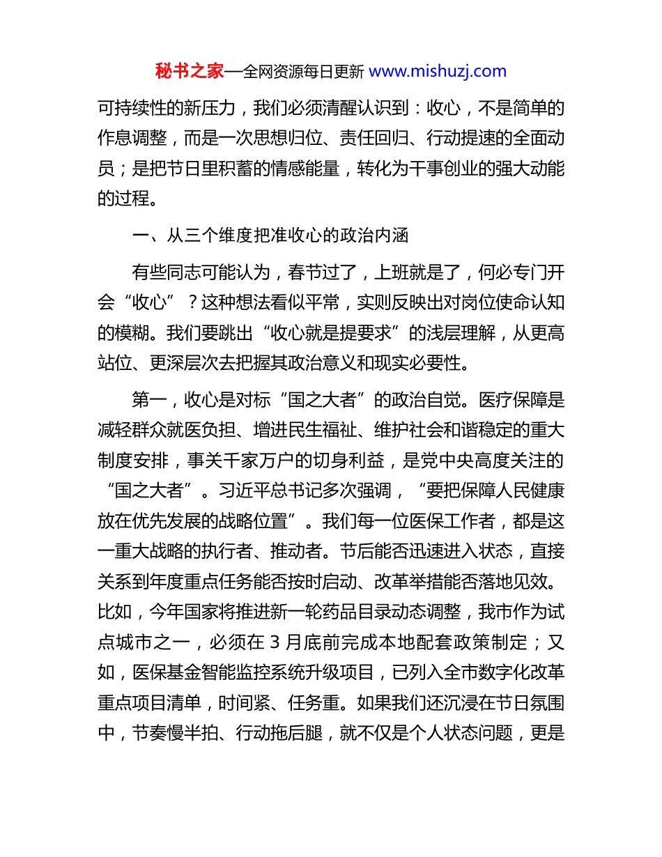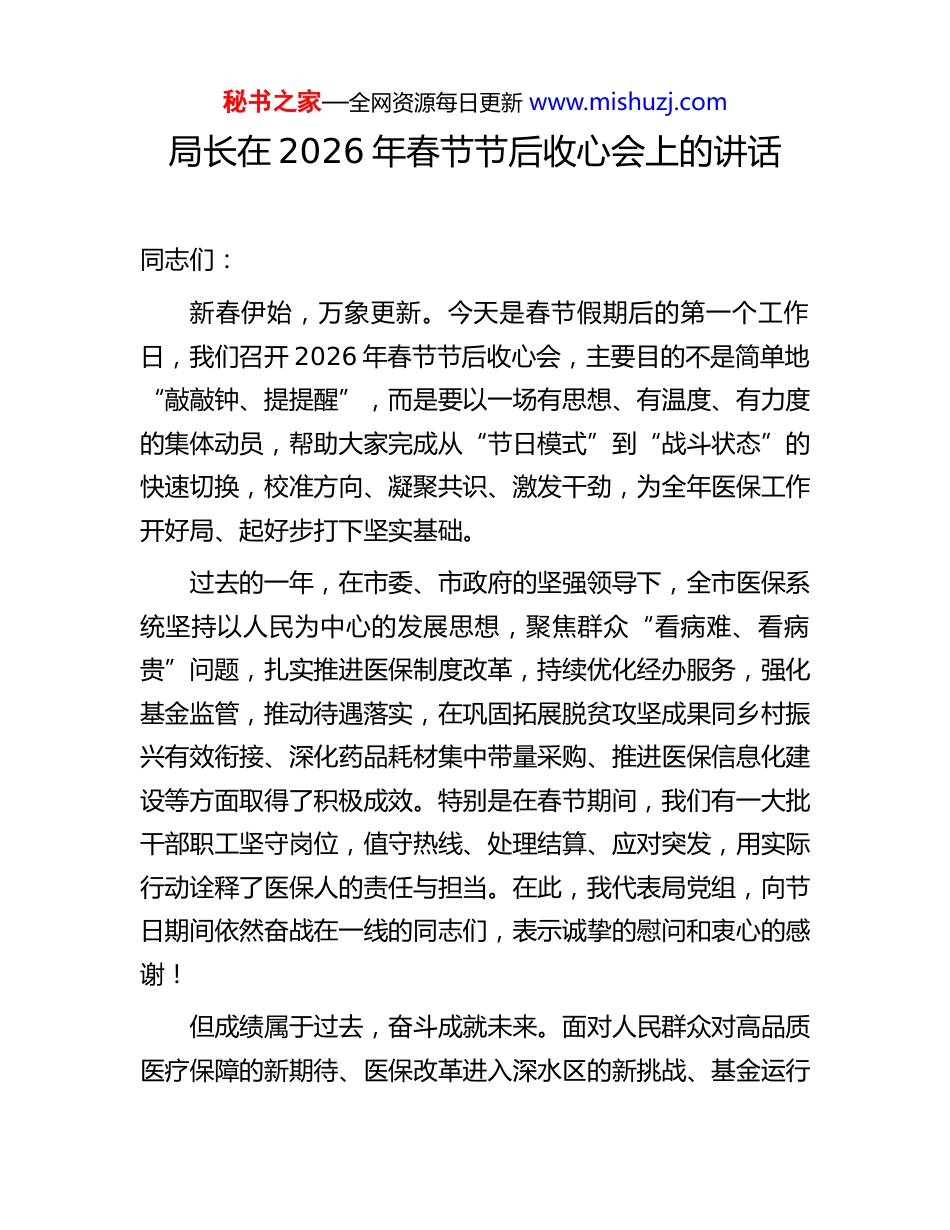 秘书之家—全网资源每日更新 www.mishuzj.com局长在 2026 年春节节后收心会上的讲话同志们:新春伊始,万象更新。今天是春节假期后的第一个工作日,我们召开 2026 年春节节后收心会,主要目的不是简单地“敲敲钟、提提醒”,而是要以一场有思想、有温度、有力度的集体动员,帮助大家完成从“节日模式”到“战斗状态”的快速切换,校准方向、凝聚共识、激发干劲,为全年医保工作开好局、起好步打下坚实基础。过去的一年,在市委、市政府的坚强领导下,全市医保系统坚持以人民为中心的发展思想,聚焦群众“看病难、看病贵”问题,扎实推进医保制度改革,持续优化经办服务,强化基金监管,推动待遇落实,在巩固拓展脱贫攻坚成果同乡村振兴有效衔接、深化药品耗材集中带量采购、推进医保信息化建设等方面取得了积极成效。特别是在春节期间,我们有一大批干部职工坚守岗位,值守热线、处理结算、应对突发,用实际行动诠释了医保人的责任与担当。在此,我代表局党组,向节日期间依然奋战在一线的同志们,表示诚挚的慰问和衷心的感谢!但成绩属于过去,奋斗成就未来。面对人民群众对高品质医疗保障的新期待、医保改革进入深水区的新挑战、基金运行秘书之家—全网资源每日更新 www.mishuzj.com可持续性的新压力,我们必须清醒认识到:收心,不是简单的作息调整,而是一次思想归位、责任回归、行动提速的全面动员;是把节日里积蓄的情感能量,转化为干事创业的强大动能的过程。一、从三个维度把准收心的政治内涵有些同志可能认为,春节过了,上班就是了,何必专门开会“收心”?这种想法看似平常,实则反映出对岗位使命认知的模糊。我们要跳出“收心就是提要求”的浅层理解,从更高站位、更深层次去把握其政治意义和现实必要性。第一,收心是对标“国之大者”的政治自觉。医疗保障是减轻群众就医负担、增进民生福祉、维护社会和谐稳定的重大制度安排,事关千家万户的切身利益,是党中央高度关注的“国之大者”。习近平总书记多次强调,“要把保障人民健康放在优先发展的战略位置”。我们每一位医保工作者,都是这一重大战略的执行者、推动者。节后能否迅速进入状态,直接关系到年度重点任务能否按时启动、改革举措能否落地见效。比如,今年国家将推进新一轮药品目录动态调整,我市作为试点城市之一,必须在 3 月底前完成本地配套政策制定;又如,医保基金智能监控系统升级项目,已列入全市数字化改革重点项目清单,时间紧、任务重。如果我们还沉浸在节日氛围中,节奏慢半拍、行动拖后腿,就不仅是个人状态问题,更是秘书之家—全网资源每日更新 www.mishuzj.com对政治责任的懈怠。因此,收心首先是讲政治的具体体现,是对标党中央决策部署的实际行动。第二,收心是回应“民之关切”的初心践行。春节期间,走亲访友中听到最多的是什么?是亲戚朋友抱怨异地就医报销手续烦琐,是慢性病患者担心药价波动,是灵活就业人员咨询参保政策……这些看似琐碎的“家长里短”,恰恰是我们工作的“国计民生”。群众过节,我们过关。节日期间,12393医保服务热线共接到咨询电话 2876 件,其中异地备案、门诊慢特病认定、生育津贴申领等问题占比较高。这说明,群众的需求不因节日而停歇,我们的服务更不能“放假”。节后第一时间梳理群众反映集中的堵点、难点问题,拿出解决方案,正是我们践行“人民医保为人民”初心的直接检验。收心,就是要让我们的心始终与群众的心同频共振,把群众的“急难愁盼”作为我们工作的“风向标”和“动力源”。第三,收心是破解“发展难题”的现实需要。当前,我市医保工作面临多重挑战:一方面,人口老龄化加速,慢性病发病率上升,基金支出压力持续加大;另一方面,新技术、新药品不断涌现,群众医疗需求日益增长,对医保支付能力提出更高要求。与此同时,欺诈骗保行为仍时有发生,基金安全风险不容忽视。这些问题,都不是轻轻松松、敲锣打鼓就能解决的。我们必须以“等不起”的紧迫感、“慢不得”的危机感、“坐不住”的责任感,立即投入工作。比如,针对基金穿底风秘书之家—全网资源每日更新 www.mishuzj.com险较高的县区,必须在一季度内完成专项调研并提出...