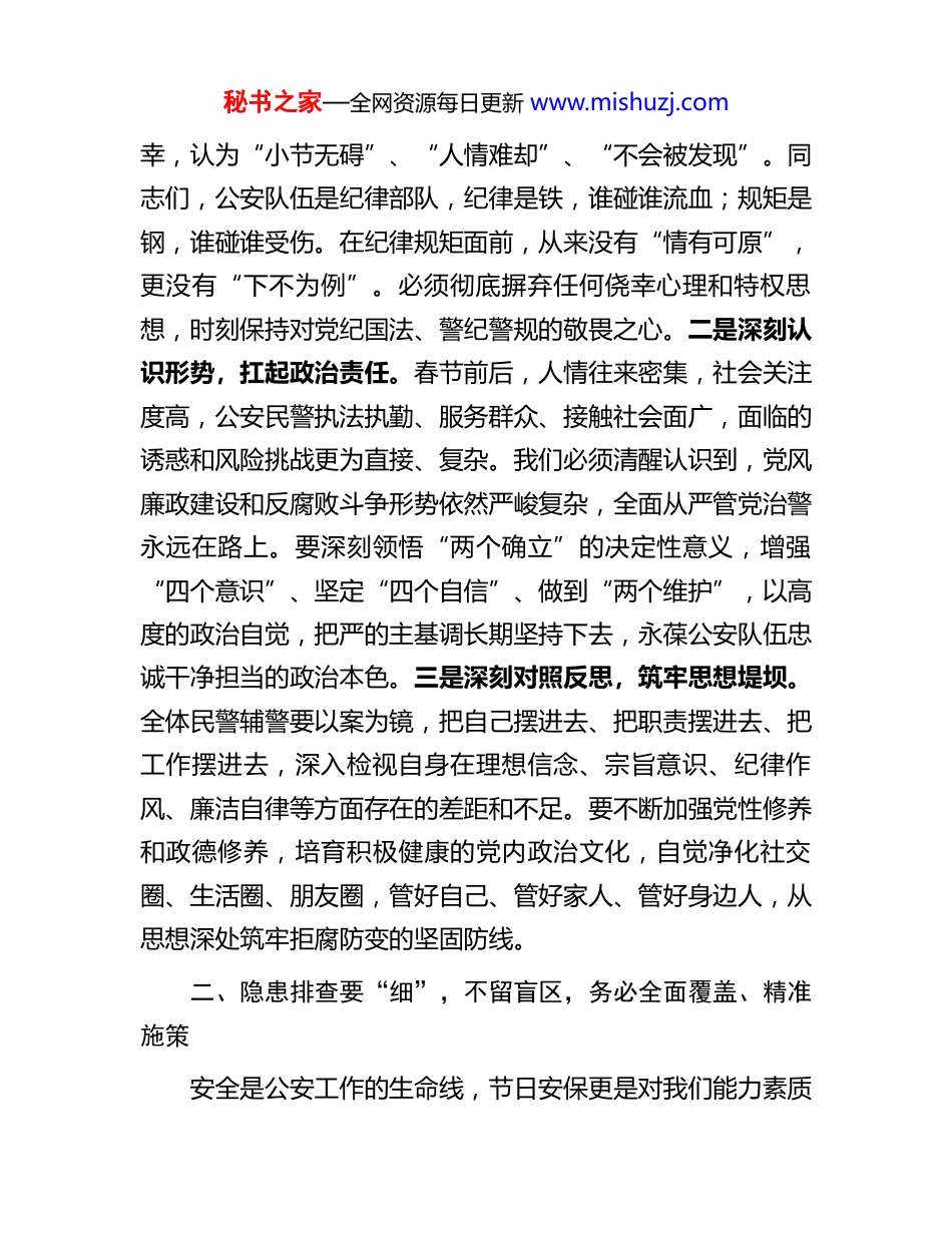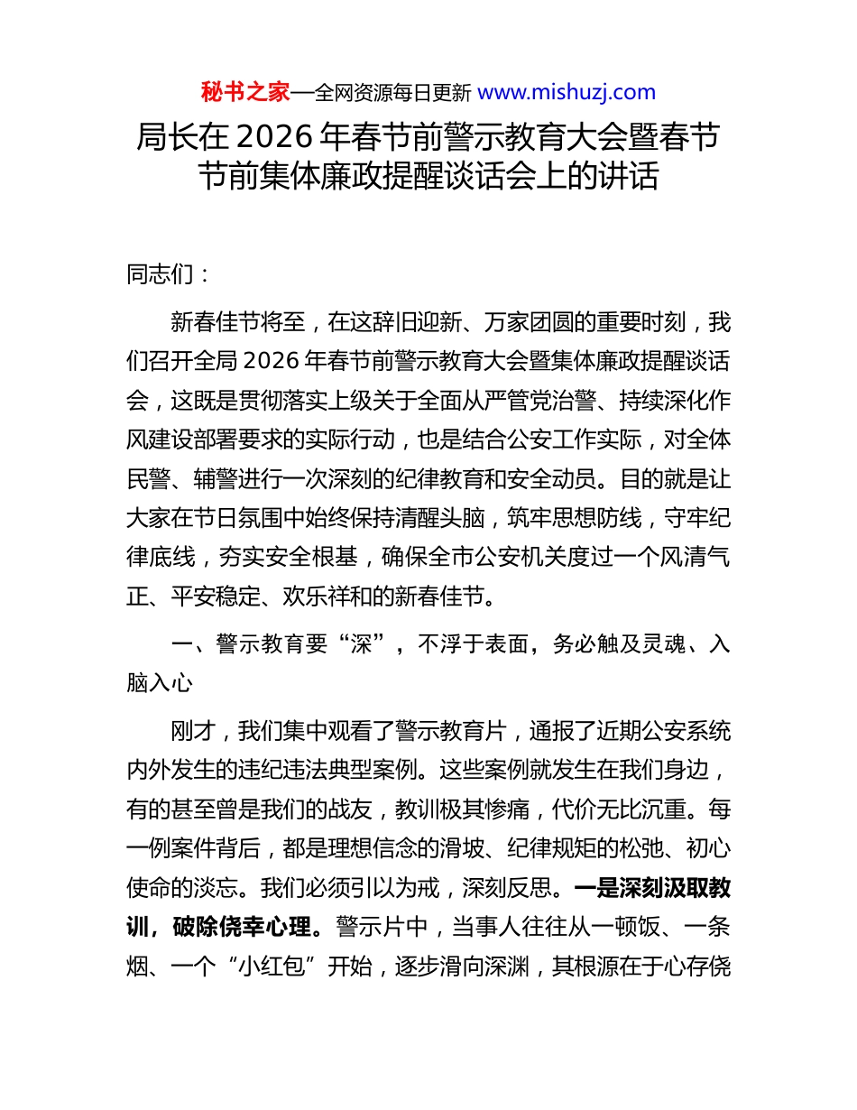 秘书之家—全网资源每日更新 www.mishuzj.com局长在 2026 年春节前警示教育大会暨春节节前集体廉政提醒谈话会上的讲话同志们:新春佳节将至,在这辞旧迎新、万家团圆的重要时刻,我们召开全局 2026 年春节前警示教育大会暨集体廉政提醒谈话会,这既是贯彻落实上级关于全面从严管党治警、持续深化作风建设部署要求的实际行动,也是结合公安工作实际,对全体民警、辅警进行一次深刻的纪律教育和安全动员。目的就是让大家在节日氛围中始终保持清醒头脑,筑牢思想防线,守牢纪律底线,夯实安全根基,确保全市公安机关度过一个风清气正、平安稳定、欢乐祥和的新春佳节。一、警示教育要“深”,不浮于表面,务必触及灵魂、入脑入心刚才,我们集中观看了警示教育片,通报了近期公安系统内外发生的违纪违法典型案例。这些案例就发生在我们身边,有的甚至曾是我们的战友,教训极其惨痛,代价无比沉重。每一例案件背后,都是理想信念的滑坡、纪律规矩的松弛、初心使命的淡忘。我们必须引以为戒,深刻反思。一是深刻汲取教训,破除侥幸心理。警示片中,当事人往往从一顿饭、一条烟、一个“小红包”开始,逐步滑向深渊,其根源在于心存侥秘书之家—全网资源每日更新 www.mishuzj.com幸,认为“小节无碍”、“人情难却”、“不会被发现”。同志们,公安队伍是纪律部队,纪律是铁,谁碰谁流血;规矩是钢,谁碰谁受伤。在纪律规矩面前,从来没有“情有可原”,更没有“下不为例”。必须彻底摒弃任何侥幸心理和特权思想,时刻保持对党纪国法、警纪警规的敬畏之心。二是深刻认识形势,扛起政治责任。春节前后,人情往来密集,社会关注度高,公安民警执法执勤、服务群众、接触社会面广,面临的诱惑和风险挑战更为直接、复杂。我们必须清醒认识到,党风廉政建设和反腐败斗争形势依然严峻复杂,全面从严管党治警永远在路上。要深刻领悟“两个确立”的决定性意义,增强“四个意识”、坚定“四个自信”、做到“两个维护”,以高度的政治自觉,把严的主基调长期坚持下去,永葆公安队伍忠诚干净担当的政治本色。三是深刻对照反思,筑牢思想堤坝。全体民警辅警要以案为镜,把自己摆进去、把职责摆进去、把工作摆进去,深入检视自身在理想信念、宗旨意识、纪律作风、廉洁自律等方面存在的差距和不足。要不断加强党性修养和政德修养,培育积极健康的党内政治文化,自觉净化社交圈、生活圈、朋友圈,管好自己、管好家人、管好身边人,从思想深处筑牢拒腐防变的坚固防线。二、隐患排查要“细”,不留盲区,务必全面覆盖、精准施策安全是公安工作的生命线,节日安保更是对我们能力素质秘书之家—全网资源每日更新 www.mishuzj.com的全面检验。必须树立“万无一失、一失万无”的标准和“细致、精致、极致”的作风,全面排查各类风险隐患。一是细查执法办案风险。要紧盯接处警、受立案、侦查取证、强制措施适用、涉案财物管理等关键环节,排查是否存在有案不立、压案不查、降格处理、违规处置等执法突出问题,是否存在程序不规范、取证不合法、管理不严格等隐患,确保执法权力在法治轨道上规范运行。二是细查内部管理风险。要对枪、弹、酒、车、密、网以及办公场所、办案区、监管场所、宿舍区等进行拉网式排查。严格枪支弹药管理使用规定,严防丢失、被盗、滥用;严格执行禁酒令,杜绝酒后驾车、酒后执勤等行为;加强车辆安全管理,杜绝公车私用、违规驾驶;强化保密纪律教育,严防失泄密事件;排查办公区域消防、电气、防盗等安全隐患,确保内部绝对安全。三是细查队伍廉政风险。要聚焦节日易发多发的“四风”问题,重点排查违规收送礼品礼金、违规接受宴请、违规使用公款、违规发放津补贴或福利、借节日之机跑官要官、说情打招呼等风险点。同时,关注民警辅警“八小时外”活动情况,及时发现和纠正苗头性、倾向性问题。四是细查社会面防控风险。结合春节治安特点,深入排查公共安全、大型活动安保、道路交通、危爆物品管理、重点人员管控、矛盾纠纷化解等领域存在的风险隐患,做到底数清、情况明,并制定针对性防控措施。三、队伍管理要“实”,不务虚功,务必严在平时、管在秘书之家—全网资源每日更新 w...
