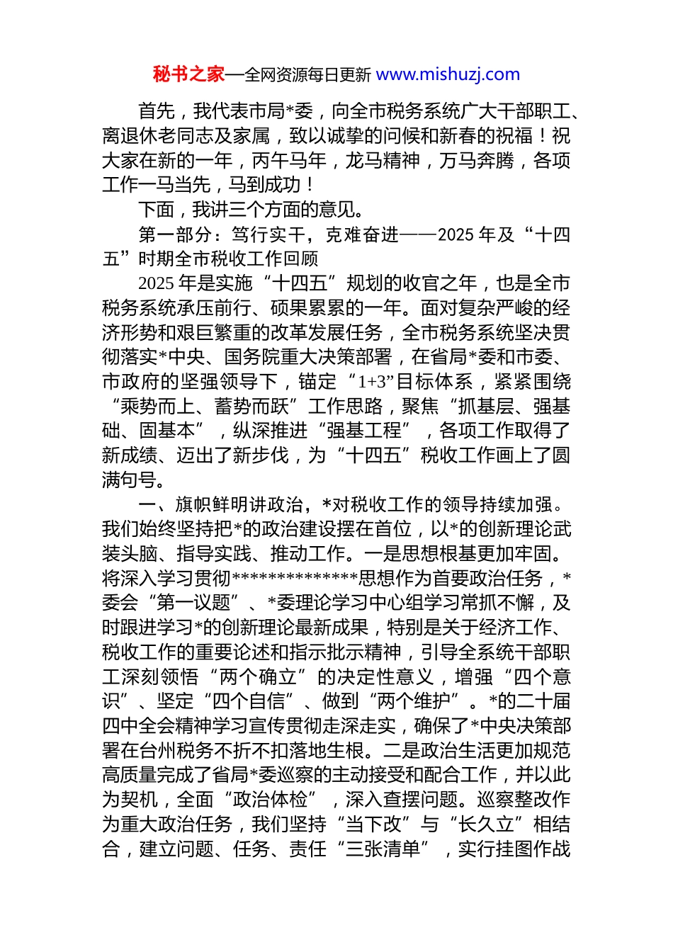 秘书之家—全网资源每日更新 www.mishuzj.com市税务局局长在 2026 年全市税务工作会上的讲话汇编(3 篇)目录1.xx 市税务局局长在 2026 年全市税务工作会上的讲话............................................................................22.xx 市税务局局长在 2026 年全市税务工作会上的讲话..........................................................................213.xx 市税务局局长在 2026 年全市税务工作会上的讲话..........................................................................44xx 市税务局局长在 2026 年全市税务工作会上的讲话同志们:这次全市税务工作会议的主要任务是:以**************思想为指导,深入学习贯彻*的二十大、二十届历次全会精神,认真落实全国、全省税务工作会议和市六届五次*代会、市“两会”部署要求,总结 2025 年及“十四五”时期税收工作,分析当前形势,部署 2026 年重点任务,动员全市税务系统广大干部职工锚定目标、接续奋斗,以“强定力、强基础、强责任”的扎实作风,奋力接续打造中国式现代化税务实践的台州样板。秘书之家—全网资源每日更新 www.mishuzj.com首先,我代表市局*委,向全市税务系统广大干部职工、离退休老同志及家属,致以诚挚的问候和新春的祝福!祝大家在新的一年,丙午马年,龙马精神,万马奔腾,各项工作一马当先,马到成功!下面,我讲三个方面的意见。第一部分:笃行实干,克难奋进——2025 年及“十四五”时期全市税收工作回顾2025 年是实施“十四五”规划的收官之年,也是全市税务系统承压前行、硕果累累的一年。面对复杂严峻的经济形势和艰巨繁重的改革发展任务,全市税务系统坚决贯彻落实*中央、国务院重大决策部署,在省局*委和市委、市政府的坚强领导下,锚定“1+3”目标体系,紧紧围绕“乘势而上、蓄势而跃”工作思路,聚焦“抓基层、强基础、固基本”,纵深推进“强基工程”,各项工作取得了新成绩、迈出了新步伐,为“十四五”税收工作画上了圆满句号。一、旗帜鲜明讲政治,*对税收工作的领导持续加强。我们始终坚持把*的政治建设摆在首位,以*的创新理论武装头脑、指导实践、推动工作。一是思想根基更加牢固。将深入学习贯彻**************思想作为首要政治任务,*委会“第一议题”、*委理论学习中心组学习常抓不懈,及时跟进学习*的创新理论最新成果,特别是关于经济工作、税收工作的重要论述和指示批示精神,引导全系统干部职工深刻领悟“两个确立”的决定性意义,增强“四个意识”、坚定“四个自信”、做到“两个维护”。*的二十届四中全会精神学习宣传贯彻走深走实,确保了*中央决策部署在台州税务不折不扣落地生根。二是政治生活更加规范高质量完成了省局*委巡察的主动接受和配合工作,并以此为契机,全面“政治体检”,深入查摆问题。巡察整改作为重大政治任务,我们坚持“当下改”与“长久立”相结合,建立问题、任务、责任“三张清单”,实行挂图作战秘书之家—全网资源每日更新 www.mishuzj.com对账销号,整改工作取得了阶段性明显成效。深入贯彻中央八项规定精神学习教育扎实开展,通过“学查改促”一体化推进,广大*员干部的纪律规矩意识显著增强。三是基层组织更加有力。“双争”行动实践路径不断拓宽,基层*组织政治功能和组织功能得到有效发挥。“四强”*支部建设全面发力,一批政治功能强、支部班子强、*员队伍强、作用发挥强的先进*支部脱颖而出,基层战斗堡垒更加坚固。二、严字当头抓纪律,正风肃纪反腐的力度持续加大。我们深刻认识全面从严治*永远在路上,*的自我革命永远在路上,始终保持严的基调、严的措施、严的氛围。一是责任链条全面压实。健全完善“四责协同”机制,制定全面从严治*主体责任清单,推动管*治*政治责任向基层分局、税务所延伸,形成了层层负责、齐抓共管的工作格局。全面部署并扎实推进“三化”建设年行动,着力提升纪检工作规范化、法治化、正规化水平,专责监督作用进一步凸显。二是政治监督精准聚焦。紧紧围绕*中央关于税费优惠政策落实、组织税费收入、深化税收征管改革等重大决策部署,以及省局、市委市政...