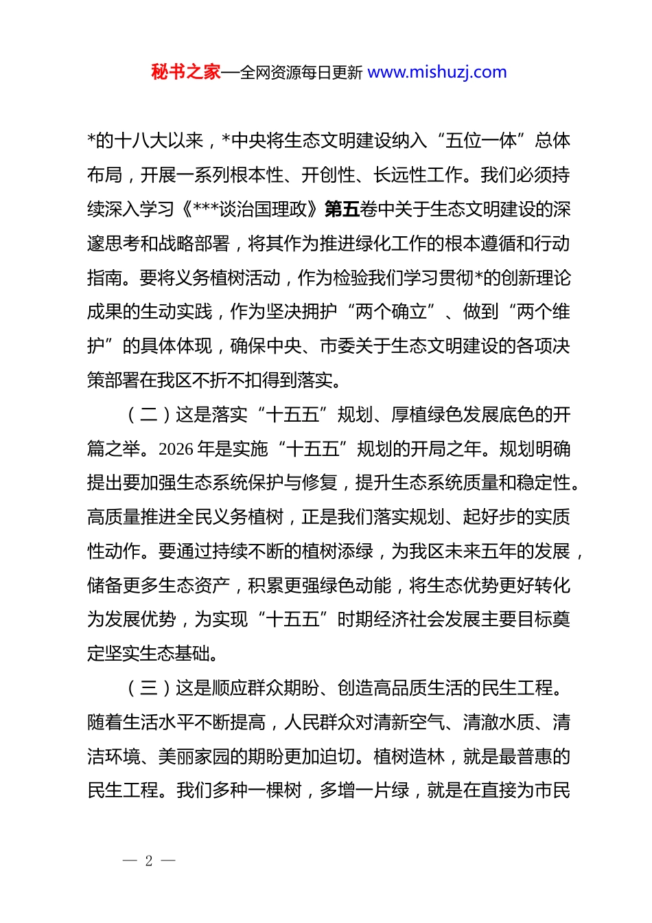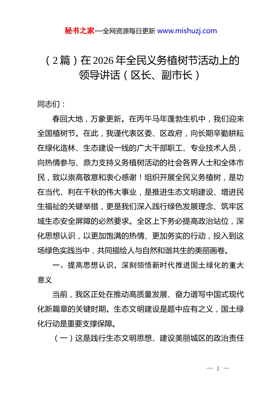 秘书之家—全网资源每日更新 www.mishuzj.com(2 篇)在 2026 年全民义务植树节活动上的领导讲话(区长、副市长)同志们:春回大地,万象更新。在丙午马年蓬勃生机中,我们迎来全国植树节。在此,我谨代表区委、区政府,向长期辛勤耕耘在绿化造林、生态建设一线的广大干部职工、专业技术人员,向热情参与、鼎力支持义务植树活动的社会各界人士和全体市民,致以崇高敬意和衷心感谢!组织开展全民义务植树,是功在当代、利在千秋的伟大事业,是推进生态文明建设、增进民生福祉的关键举措,更是我们深入践行绿色发展理念、筑牢区域生态安全屏障的必然要求。全区上下务必提高政治站位,深化思想认识,以更加饱满的热情、更加务实的行动,投入到这场绿色实践当中,共同描绘人与自然和谐共生的美丽画卷。一、提高思想认识,深刻领悟新时代推进国土绿化的重大意义当前,我区正处在推动高质量发展、奋力谱写中国式现代化新篇章的关键时期。生态文明建设是题中应有之义,国土绿化行动是重要支撑保障。(一)这是践行生态文明思想、建设美丽城区的政治责任— 1 —秘书之家—全网资源每日更新 www.mishuzj.com*的十八大以来,*中央将生态文明建设纳入“五位一体”总体布局,开展一系列根本性、开创性、长远性工作。我们必须持续深入学习《***谈治国理政》第五卷中关于生态文明建设的深邃思考和战略部署,将其作为推进绿化工作的根本遵循和行动指南。要将义务植树活动,作为检验我们学习贯彻*的创新理论成果的生动实践,作为坚决拥护“两个确立”、做到“两个维护”的具体体现,确保中央、市委关于生态文明建设的各项决策部署在我区不折不扣得到落实。(二)这是落实“十五五”规划、厚植绿色发展底色的开篇之举。2026 年是实施“十五五”规划的开局之年。规划明确提出要加强生态系统保护与修复,提升生态系统质量和稳定性。高质量推进全民义务植树,正是我们落实规划、起好步的实质性动作。要通过持续不断的植树添绿,为我区未来五年的发展,储备更多生态资产,积累更强绿色动能,将生态优势更好转化为发展优势,为实现“十五五”时期经济社会发展主要目标奠定坚实生态基础。(三)这是顺应群众期盼、创造高品质生活的民生工程。随着生活水平不断提高,人民群众对清新空气、清澈水质、清洁环境、美丽家园的期盼更加迫切。植树造林,就是最普惠的民生工程。我们多种一棵树,多增一片绿,就是在直接为市民— 2 —秘书之家—全网资源每日更新 www.mishuzj.com提供更多优质生态产品,就是在建设更宜居、更宜业、更宜游的城市环境。必须坚持以人民为中心的发展思想,将义务植树与公园城市建设、人居环境整治、乡村振兴等工作紧密结合,让人民群众在共建共享绿色成果中有更多获得感、幸福感、安全感。二、聚焦重点任务,全力以赴提升义务植树和国土绿化综合成效过去一年,在全区上下共同努力下,我区国土绿化工作取得新进展,但也应清醒看到,绿化空间拓展难度加大、绿化成果管护任务繁重等问题依然存在。我们必须坚持问题导向,精准发力,务求实效。(一)科学规划布局,拓展绿化空间。要坚持规划引领,紧密结合区域国土空间规划,科学划定并严守生态保护红线,合理安排绿化用地。一是向规划要空间。在城市更新、项目建设中严格执行绿地率规定,确保“还绿于民、留白增绿”。二是向闲置要空间。积极盘活拆迁腾退地、边角地、废弃地等,见缝插绿、拆违建绿、留白增绿。三是向立体要空间。鼓励发展屋顶绿化、垂直绿化、阳台绿化,丰富城市绿化层次,提高绿视率。四是向乡村要空间。持续推进乡村绿化美化,建设森林乡村、小微绿地,改善农村人居环境。— 3 —秘书之家—全网资源每日更新 www.mishuzj.com(二)提升绿化品质,建设精品工程。要转变“重栽植、轻管护,重数量、轻质量”的观念,推动绿化工作从规模速度型向质量效益型转变。一是坚持科学造林。遵循自然规律和经济规律,因地制宜选择树种草种,宜乔则乔、宜灌则灌、宜草则草,大力推广使用乡土树种、长寿树种、抗逆性强的树种,构建健康稳定的生态系统。二是打造绿化精品。围绕重点道路、河流、公园、窗口地区,精心设计、精...