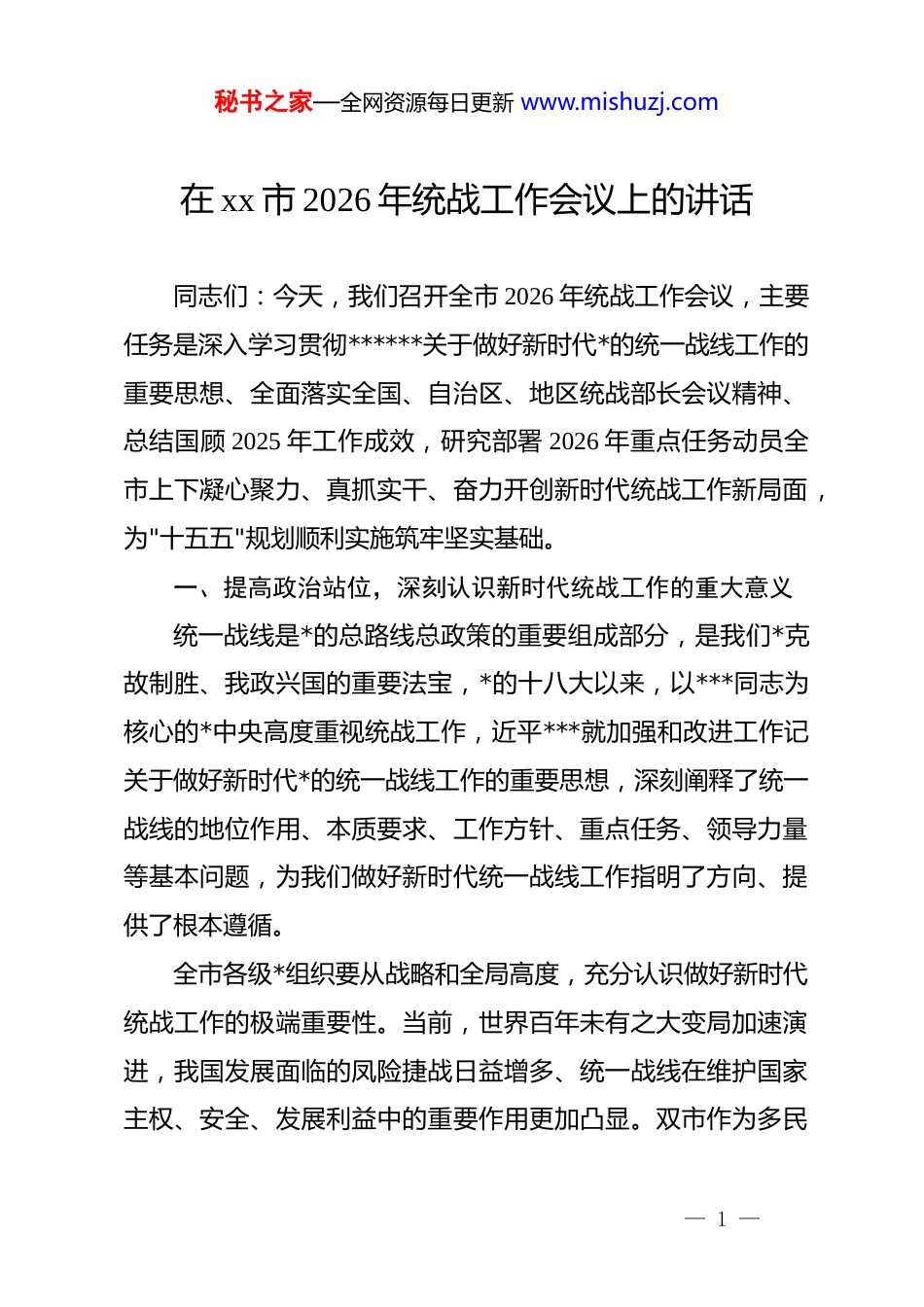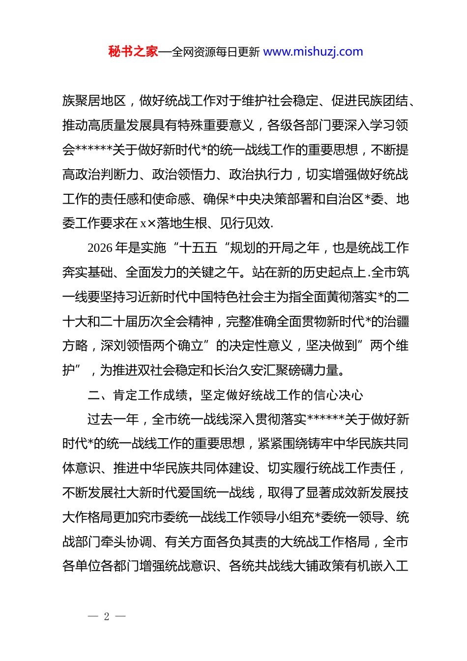 秘书之家—全网资源每日更新 www.mishuzj.com在 xx 市 2026 年统战工作会议上的讲话同志们:今天,我们召开全市 2026 年统战工作会议,主要任务是深入学习贯彻******关于做好新时代*的统一战线工作的重要思想、全面落实全国、自治区、地区统战部长会议精神、总结国顾 2025 年工作成效,研究部署 2026 年重点任务动员全市上下凝心聚力、真抓实干、奋力开创新时代统战工作新局面,为"十五五"规划顺利实施筑牢坚实基础。一、提高政治站位,深刻认识新时代统战工作的重大意义统一战线是*的总路线总政策的重要组成部分,是我们*克故制胜、我政兴国的重要法宝,*的十八大以来,以***同志为核心的*中央高度重视统战工作,近平***就加强和改进工作记关于做好新时代*的统一战线工作的重要思想,深刻阐释了统一战线的地位作用、本质要求、工作方针、重点任务、领导力量等基本问题,为我们做好新时代统一战线工作指明了方向、提供了根本遵循。全市各级*组织要从战略和全局高度,充分认识做好新时代统战工作的极端重要性。当前,世界百年未有之大变局加速演进,我国发展面临的凤险捷战日益增多、统一战线在维护国家主权、安全、发展利益中的重要作用更加凸显。双市作为多民— 1 —秘书之家—全网资源每日更新 www.mishuzj.com族聚居地区,做好统战工作对于维护社会稳定、促进民族团结、推动高质量发展具有特殊重要意义,各级各部门要深入学习领会******关于做好新时代*的统一战线工作的重要思想,不断提高政治判断力、政治领悟力、政治执行力,切实增强做好统战工作的责任感和使命感、确保*中央决策部署和自治区*委、地委工作要求在 x×落地生根、见行见效.2026 年是实施“十五五“规划的开局之年,也是统战工作奔实基础、全面发力的关键之午。站在新的历史起点上.全市筑一线要坚持习近新时代中国特色社会主为指全面黄彻落实*的二十大和二十届历次全会精神,完整准确全面贯物新时代*的治疆方略,深刘领悟两个确立”的决定性意义,坚决做到”两个维护”,为推进双社会稳定和长治久安汇聚磅礴力量。二、肯定工作成绩,坚定做好统战工作的信心决心过去一年,全市统一战线深入贯彻落实******关于做好新时代*的统一战线工作的重要思想,紧紧围绕铸牢中华民族共同体意识、推进中华民族共同体建设、切实履行统战工作责任,不断发展社大新时代爱国统一战线,取得了显著成效新发展技大作格局更加究市委统一战线工作领导小组充*委统一领导、统战部门牵头协调、有关方面各负其责的大统战工作格局,全市各单位各都门增强统战意识、各统共战线大铺政策有机嵌入工— 2 —秘书之家—全网资源每日更新 www.mishuzj.com作实践,统战工作责任制的落实更加有力有效。基层统战工作体系不断健金,组织设置更加规范,执行能力持续提升,统战工作覆盖面和影响力进一步扩大。我国中华民族共同体意识深入人心,全市上下以铸牢中华民族共同体意识为主线,深入开展民族团结进步创建活动,持续深化各民族交往交流交融。通过举办"三地四方"主题*日活动、传统文化进社区、民族团结进步教育月等系列活动,广大干部群众对伟大祖国、中华民族、中华文化、中国共产*、中国特色社会主义的认同不新深化,组织开展基层群众赴外地参观交流活动,推进兵地共建、油地共建,“最美家庭”交往交流交融等活动取得良好成效,独库中队被打造成为铸牢中华民族共同体意识京范点、并获评全国学雷锋活动示范点,典型引领作用充分发**事务治理能力稳步提升。坚持我国**中国化方向,全面贯彻*的**工作基本方针,依法管理**事务,积极引导**与社会主义社会相适应。**领域和谐稳定,**活动场所管理规范有序,**人士思想政治引领不断加强,**事务治理法治化水平持续提高,通过开展培训教育、政策宣讲等活动,**界人士和信教群众的国家意识、公民意识、法治意识明显增强。团结奋斗的时代主题更加彰显。广大统战成员围绕中心服务大局,在推动经济发展、维护社会稳定、促进民生改善等方— 3 —秘书之家—全网资源每日更新 www.mishuzj.com面发挥了积极作用,非公有制经济人士积极投身乡村振兴、公益慈善事业,展现了新时代民管企业...