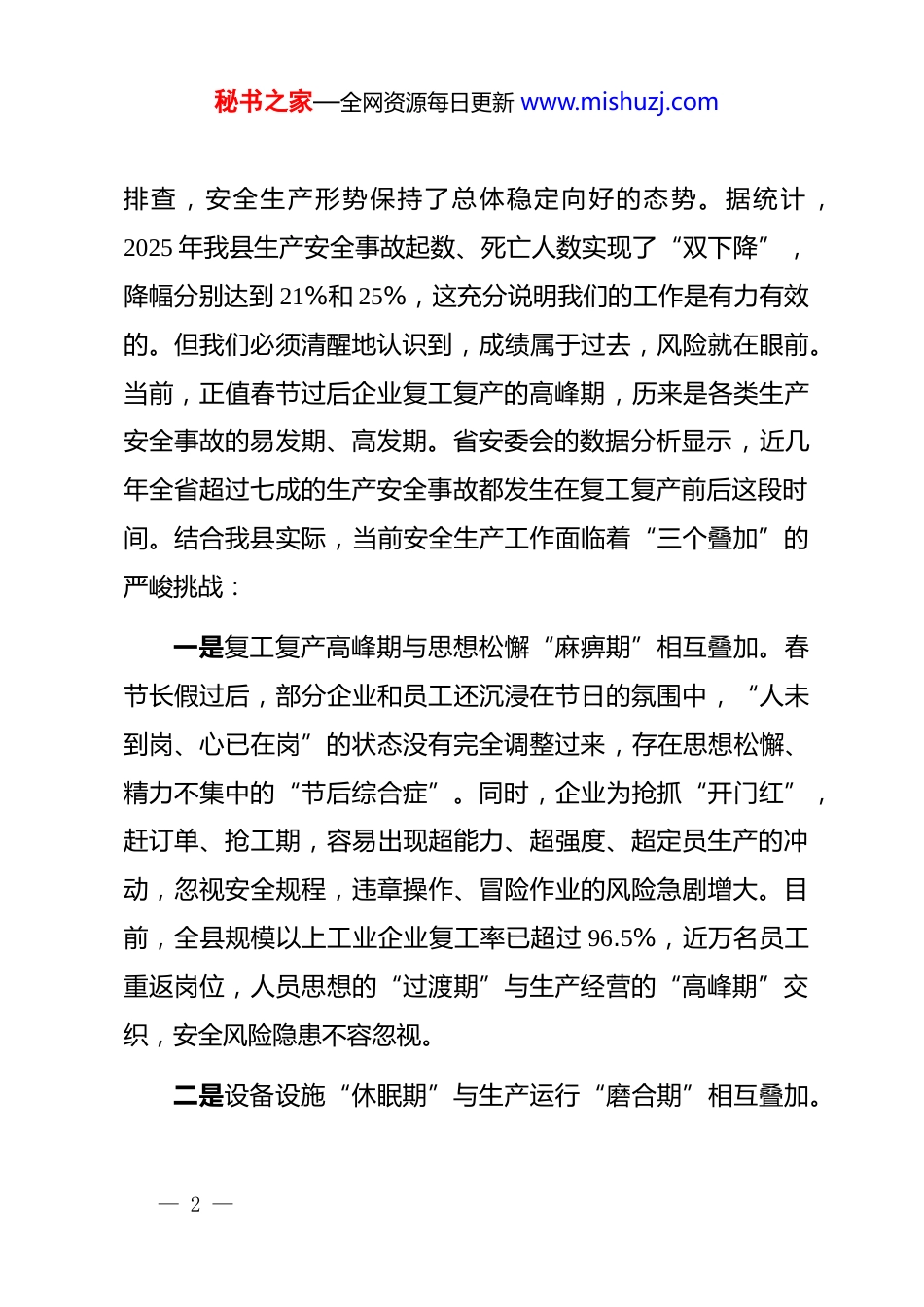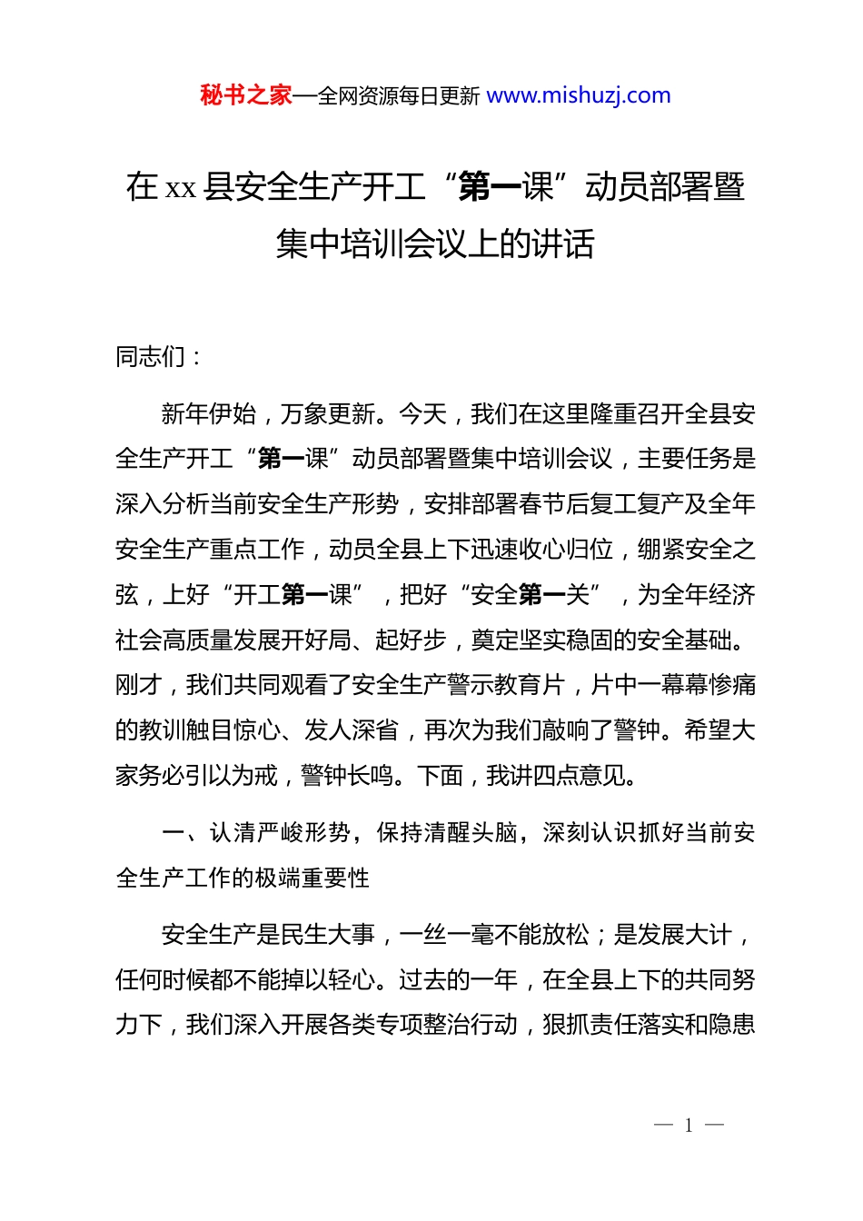 秘书之家—全网资源每日更新 www.mishuzj.com在 xx 县安全生产开工“第一课”动员部署暨集中培训会议上的讲话同志们:新年伊始,万象更新。今天,我们在这里隆重召开全县安全生产开工“第一课”动员部署暨集中培训会议,主要任务是深入分析当前安全生产形势,安排部署春节后复工复产及全年安全生产重点工作,动员全县上下迅速收心归位,绷紧安全之弦,上好“开工第一课”,把好“安全第一关”,为全年经济社会高质量发展开好局、起好步,奠定坚实稳固的安全基础。刚才,我们共同观看了安全生产警示教育片,片中一幕幕惨痛的教训触目惊心、发人深省,再次为我们敲响了警钟。希望大家务必引以为戒,警钟长鸣。下面,我讲四点意见。一、认清严峻形势,保持清醒头脑,深刻认识抓好当前安全生产工作的极端重要性安全生产是民生大事,一丝一毫不能放松;是发展大计,任何时候都不能掉以轻心。过去的一年,在全县上下的共同努力下,我们深入开展各类专项整治行动,狠抓责任落实和隐患— 1 —秘书之家—全网资源每日更新 www.mishuzj.com排查,安全生产形势保持了总体稳定向好的态势。据统计 ,2025 年我县生产安全事故起数、死亡人数实现了“双下降”,降幅分别达到 21%和 25%,这充分说明我们的工作是有力有效的。但我们必须清醒地认识到,成绩属于过去,风险就在眼前。当前,正值春节过后企业复工复产的高峰期,历来是各类生产安全事故的易发期、高发期。省安委会的数据分析显示,近几年全省超过七成的生产安全事故都发生在复工复产前后这段时间。结合我县实际,当前安全生产工作面临着“三个叠加”的严峻挑战:一是复工复产高峰期与思想松懈“麻痹期”相互叠加。春节长假过后,部分企业和员工还沉浸在节日的氛围中,“人未到岗、心已在岗”的状态没有完全调整过来,存在思想松懈、精力不集中的“节后综合症”。同时,企业为抢抓“开门红”,赶订单、抢工期,容易出现超能力、超强度、超定员生产的冲动,忽视安全规程,违章操作、冒险作业的风险急剧增大。目前,全县规模以上工业企业复工率已超过 96.5%,近万名员工重返岗位,人员思想的“过渡期”与生产经营的“高峰期”交织,安全风险隐患不容忽视。二是设备设施“休眠期”与生产运行“磨合期”相互叠加。— 2 —秘书之家—全网资源每日更新 www.mishuzj.com各类机器设备经过长时间停产闲置,一些零部件可能出现松动、锈蚀、老化,电气线路可能受潮或被鼠蚁啃咬,复产前若检查维护不到位,仓促启动运行,极易发生机械伤害、火灾、爆炸等事故。同时,一些新员工、转岗员工对岗位操作规程、安全风险不熟悉,老员工对操作流程也可能出现生疏,人机磨合、人员磨合不到位,也为安全生产埋下了巨大隐患。三是传统风险与新型风险相互叠加。一方面,非煤矿山、危险化学品、建筑施工、道路交通、城镇燃气、工贸等传统重点行业的固有风险依然存在,存量隐患尚未完全清零。另一方面,随着新产业、新业态、新模式的不断涌现,一些分租转租、“厂中厂”等混合生产经营场所消防安全管理责任不清、风险交织,平台经济、共享经济等带来的新风险日益凸显,对我们的监管能力提出了更高要求。面对这些风险挑战,全县各级各部门、各生产经营单位必须保持“成绩每天归零”的心态,时刻保持如履薄冰、如临深渊的警觉,深刻认识到抓安全生产就是抓发展、抓民生、抓稳定,是必须坚决扛起的重大政治责任。要坚决克服麻痹思想、侥幸心理和松劲心态,以“时时放心不下”的责任感和“睁眼睡觉”的警觉性,把复工复产安全生产工作抓实、抓细、抓到— 3 —秘书之家—全网资源每日更新 www.mishuzj.com位,坚决守住不发生重特大事故的底线。二、聚焦关键环节,落实刚性举措,全面筑牢复工复产安全防线一年之计在于春,安全之计在于严。做好复工复产安全工作,必须抓住关键、精准发力,用最严格的标准、最严密的措施,把好每一道关口。第一,必须把“开工第一课”作为复工复产的法定前置条件。讲好“开工第一课”,是统一思想、凝聚共识、强化意识的有效途径。各镇、各行业主管部门要严格督促企业落实“五必须”要求,即复工复产前必须召开一次安全生...