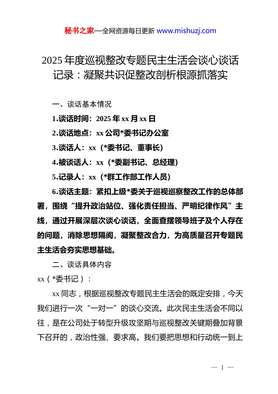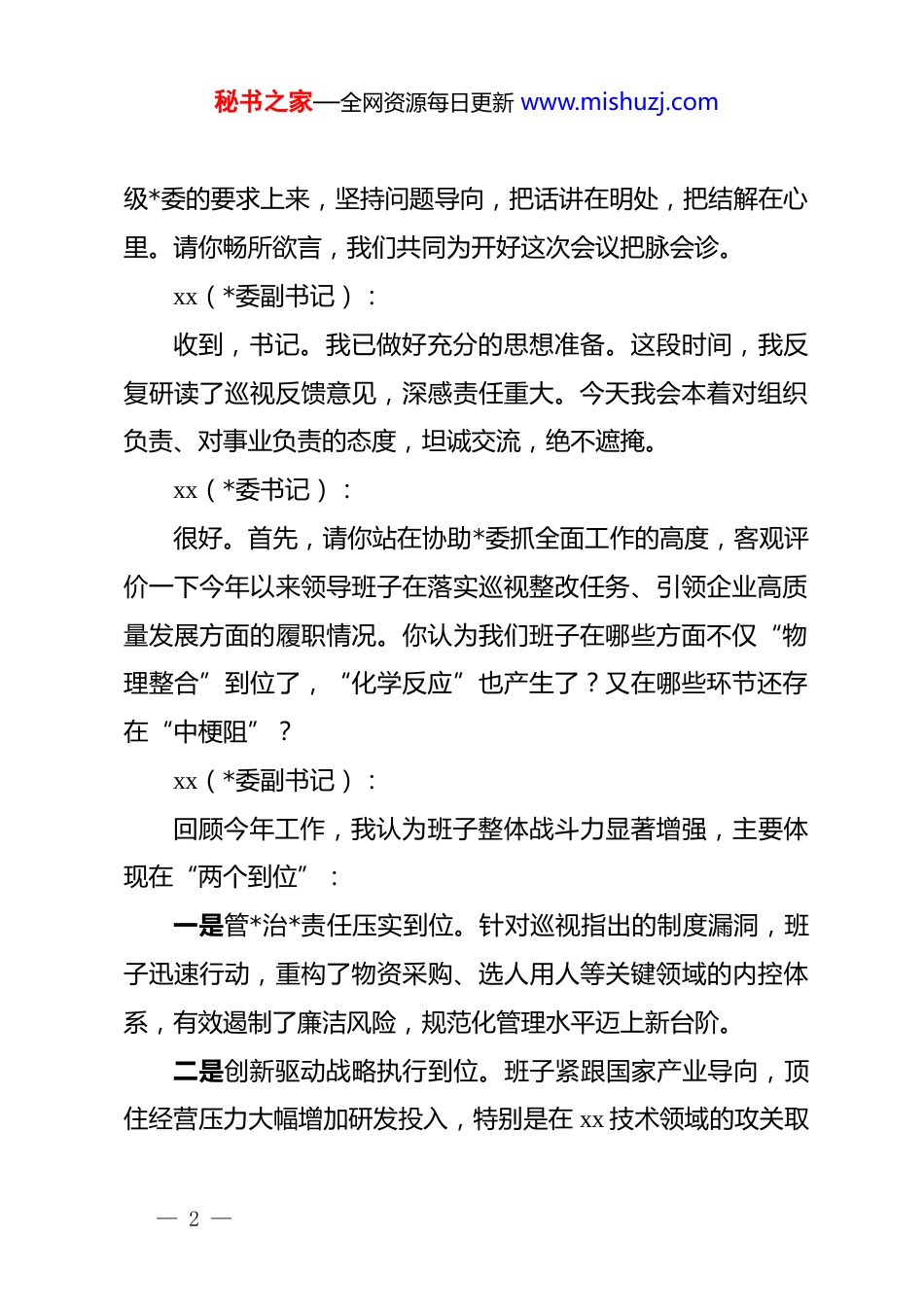 秘书之家—全网资源每日更新 www.mishuzj.com2025 年度巡视整改专题民主生活会谈心谈话记录:凝聚共识促整改剖析根源抓落实一、谈话基本情况1.谈话时间:2025 年 xx 月 xx 日2.谈话地点:xx 公司*委书记办公室3.谈话人:xx(*委书记、董事长)4.被谈话人:xx(*委副书记、总经理)5.记录人:xx(*群工作部工作人员)6.谈话主题:紧扣上级*委关于巡视巡察整改工作的总体部署,围绕“提升政治站位、强化责任担当、严明纪律作风”主线,通过开展深层次谈心谈话,全面查摆领导班子及个人存在的问题,消除思想隔阂,凝聚整改合力,为高质量召开专题民主生活会夯实思想基础。二、谈话具体内容xx(*委书记):xx 同志,根据巡视整改专题民主生活会的既定安排,今天我们进行一次“一对一”的谈心交流。此次民主生活会不同以往,是在公司处于转型升级攻坚期与巡视整改关键期叠加背景下召开的,政治性强、要求高。我们要把思想和行动统一到上— 1 —秘书之家—全网资源每日更新 www.mishuzj.com级*委的要求上来,坚持问题导向,把话讲在明处,把结解在心里。请你畅所欲言,我们共同为开好这次会议把脉会诊。xx(*委副书记):收到,书记。我已做好充分的思想准备。这段时间,我反复研读了巡视反馈意见,深感责任重大。今天我会本着对组织负责、对事业负责的态度,坦诚交流,绝不遮掩。xx(*委书记):很好。首先,请你站在协助*委抓全面工作的高度,客观评价一下今年以来领导班子在落实巡视整改任务、引领企业高质量发展方面的履职情况。你认为我们班子在哪些方面不仅“物理整合”到位了,“化学反应”也产生了?又在哪些环节还存在“中梗阻”?xx(*委副书记):回顾今年工作,我认为班子整体战斗力显著增强,主要体现在“两个到位”:一是管*治*责任压实到位。针对巡视指出的制度漏洞,班子迅速行动,重构了物资采购、选人用人等关键领域的内控体系,有效遏制了廉洁风险,规范化管理水平迈上新台阶。二是创新驱动战略执行到位。班子紧跟国家产业导向,顶住经营压力大幅增加研发投入,特别是在 xx 技术领域的攻关取— 2 —秘书之家—全网资源每日更新 www.mishuzj.com得实质性突破,不仅补齐了产业链短板,也为公司培育了新的利润增长极。但是,对标高标准严要求,仍存在两个层面的短板:一是整改工作的系统性不强,存在“表层化”倾向。比如在数字化转型整改中,虽然购置了大量硬件设施,但数据孤岛现象依然严重,业务流与数据流尚未真正打通,导致“重建设、轻应用”的问题依旧突出。二是贯彻新发展理念存在“温差”。部分班子成员和中层干部对传统路径依赖较重,面对新兴业务板块的拓展,思想上存有畏难情绪,跨部门协同作战的机制尚不灵活,一定程度上拖慢了转型步伐。xx(*委书记):你分析得很透彻,特别是关于数字化转型“虚火”和思想观念“温差”的问题,确实抓住了症结。接下来,请你结合履行“一岗双责”和分管领域工作,对自己进行一次“政治体检”。在执行*委决策部署、推动整改落地见效的过程中,你觉得自身还存在哪些差距?xx(*委副书记):经过深刻反思,我认为自己在三个方面仍需改进:一是学用结合的深度不够。虽然坚持参加理论中心组学习,— 3 —秘书之家—全网资源每日更新 www.mishuzj.com但在运用*的创新理论解决企业复杂经营难题时,有时还停留在生搬硬套层面,缺乏将政策红利转化为企业发展红利的敏锐度和操作能力。二是攻坚克难的韧劲不足。在推进 xx 项目等急难险重任务时,虽然初期声势很大,但在遇到体制机制深层阻力时,有时缺乏“钉钉子”精神,改革举措的连贯性和穿透力不够。三是联系群众的频度不高。平时忙于事务性工作,深入一线调研往往是“甚至”多、“蹲点”少,对基层职工在转型期的思想动态和实际困难掌握不够精准,工作作风还需进一步下沉。xx(*委书记):你的自我剖析见人见事,很有深度。班子团结是战斗力的源泉,而真诚的批评是团结的粘合剂。接下来,请你对班子其他成员以及我个人,提几条具体的意见建议。无论是工作配合上的瑕疵,还是作风建设上的盲点,都请直言不讳。xx(*委副书记):基于日常工作接触,我提几点...