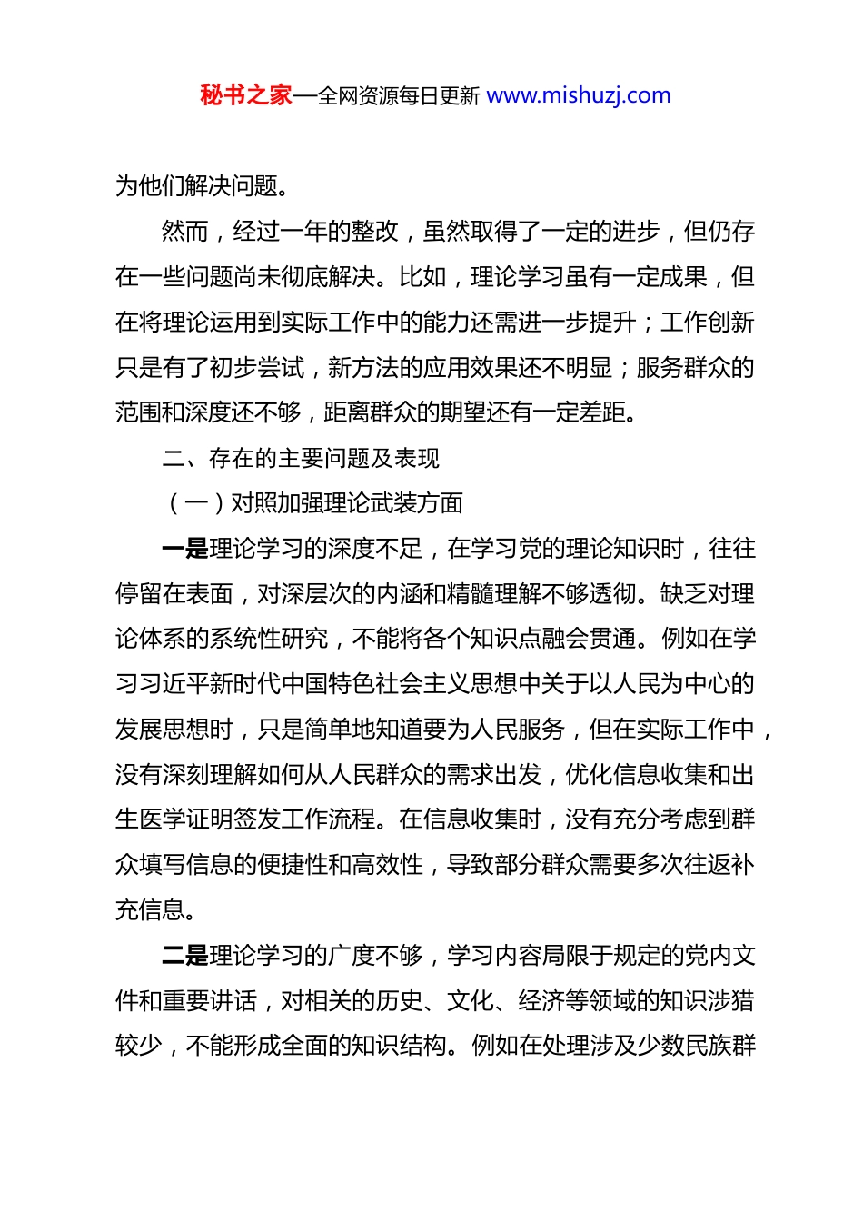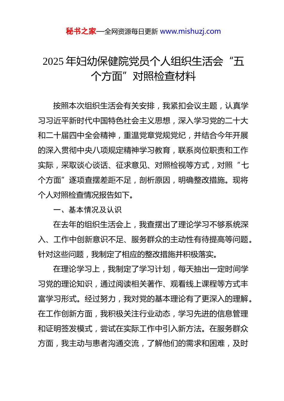 秘书之家—全网资源每日更新 www.mishuzj.com2025 年妇幼保健院党员个人组织生活会“五个方面”对照检查材料 按照本次组织生活会有关安排,我紧扣会议主题,认真学习习近平新时代中国特色社会主义思想,深入学习党的二十大和二十届四中全会精神,重温党章党规党纪,并结合今年开展的深入贯彻中央八项规定精神学习教育,联系岗位职责和工作实际,采取谈心谈话、征求意见、对照检视等方式,对照“七个方面”逐项查摆差距不足,剖析原因,明确整改措施。现将个人对照检查情况报告如下。一、基本情况及认识在去年的组织生活会上,我查摆出了理论学习不够系统深入、工作中创新意识不足、服务群众的主动性有待提高等问题。针对这些问题,我制定了相应的整改措施并积极落实。在理论学习上,我制定了学习计划,每天抽出一定时间学习党的理论知识,通过阅读相关著作、观看线上课程等方式丰富学习形式。经过努力,我对党的基本理论有了更深入的理解。在工作创新方面,我积极关注行业动态,学习先进的信息管理和证明签发模式,尝试在实际工作中引入新方法。在服务群众方面,我主动与患者沟通交流,了解他们的需求和困难,及时秘书之家—全网资源每日更新 www.mishuzj.com为他们解决问题。然而,经过一年的整改,虽然取得了一定的进步,但仍存在一些问题尚未彻底解决。比如,理论学习虽有一定成果,但在将理论运用到实际工作中的能力还需进一步提升;工作创新只是有了初步尝试,新方法的应用效果还不明显;服务群众的范围和深度还不够,距离群众的期望还有一定差距。二、存在的主要问题及表现(一)对照加强理论武装方面一是理论学习的深度不足,在学习党的理论知识时,往往停留在表面,对深层次的内涵和精髓理解不够透彻。缺乏对理论体系的系统性研究,不能将各个知识点融会贯通。例如在学习习近平新时代中国特色社会主义思想中关于以人民为中心的发展思想时,只是简单地知道要为人民服务,但在实际工作中,没有深刻理解如何从人民群众的需求出发,优化信息收集和出生医学证明签发工作流程。在信息收集时,没有充分考虑到群众填写信息的便捷性和高效性,导致部分群众需要多次往返补充信息。二是理论学习的广度不够,学习内容局限于规定的党内文件和重要讲话,对相关的历史、文化、经济等领域的知识涉猎较少,不能形成全面的知识结构。例如在处理涉及少数民族群秘书之家—全网资源每日更新 www.mishuzj.com众的信息收集和出生医学证明签发工作时,由于缺乏对少数民族文化和风俗的了解,导致在沟通和服务过程中出现了一些小的误解。例如,在询问一些少数民族群众的家庭信息时,没有注意到他们的特殊文化习惯,引起了部分群众的不满。三是理论联系实际不够紧密,不能很好地将所学的理论知识运用到实际工作中,遇到问题时不能从理论中寻找解决办法,导致工作效率不高。例如在面对信息科大量复杂的数据时,虽然学习了科学的数据分析方法和管理理论,但在实际操作中,仍然习惯于采用传统的方式进行处理,没有运用新的理论和方法提高数据处理的准确性和及时性。在一次紧急的数据上报任务中,由于数据处理方式落后,导致上报时间延误。(二)对照执行上级组织决定方面一是对上级决定的理解不够精准,在接到上级组织关于信息收集和出生医学证明签发工作的决定和要求时,没有深入研究其背景和目的,只是机械地按照条文执行,对一些关键内容理解不准确。例如上级要求对出生医学证明的签发流程进行优化,以提高服务效率。但我在执行过程中,只关注了文件中列出的表面流程,没有深入理解优化的核心是要减少群众等待时间和简化手续,导致在实际操作中,虽然流程有了一定调整,但群众并没有真正感受到便利。秘书之家—全网资源每日更新 www.mishuzj.com二是执行上级决定的力度不够坚决,在执行上级决定时,遇到困难和阻力容易产生动摇,不能坚定不移地推进工作。例如上级要求加强对妇幼数据信息的保密工作,需要对现有的信息系统进行安全升级。但在执行过程中,由于涉及到一定的资金和技术难题,我没有积极主动地去解决,而是产生了拖延心理,导致信息安全升级工作进展缓慢。三是执行过程中的反馈机制不...