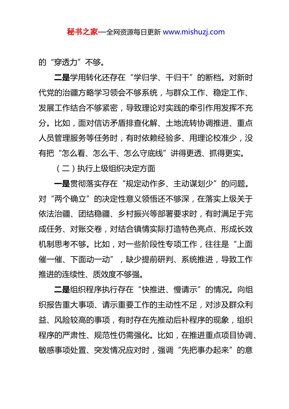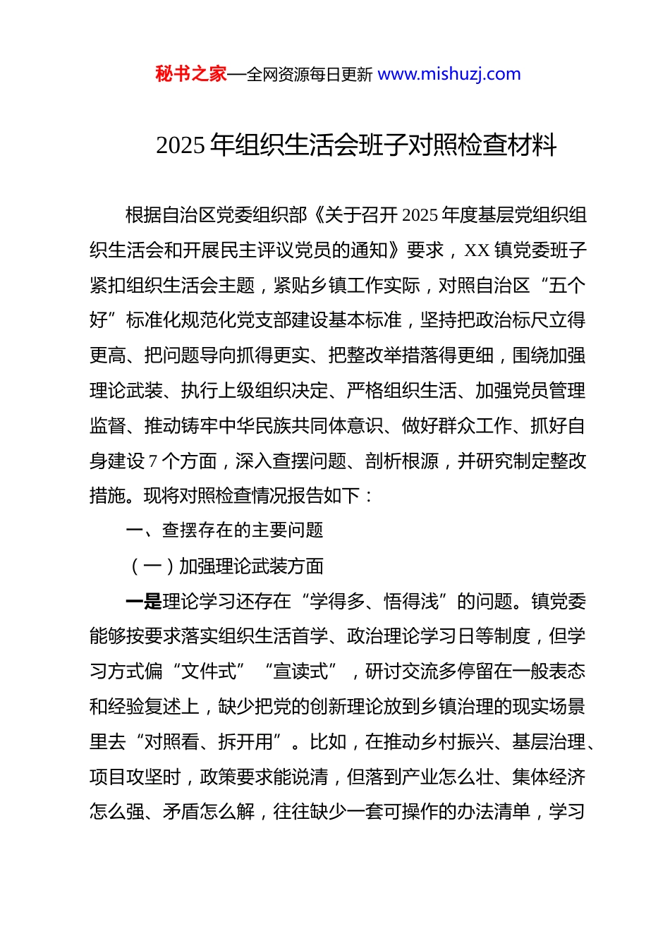秘书之家—全网资源每日更新 www.mishuzj.com2025 年组织生活会班子对照检查材料 根据自治区党委组织部《关于召开 2025 年度基层党组织组织生活会和开展民主评议党员的通知》要求,XX 镇党委班子紧扣组织生活会主题,紧贴乡镇工作实际,对照自治区“五个好”标准化规范化党支部建设基本标准,坚持把政治标尺立得更高、把问题导向抓得更实、把整改举措落得更细,围绕加强理论武装、执行上级组织决定、严格组织生活、加强党员管理监督、推动铸牢中华民族共同体意识、做好群众工作、抓好自身建设 7 个方面,深入查摆问题、剖析根源,并研究制定整改措施。现将对照检查情况报告如下:一、查摆存在的主要问题(一)加强理论武装方面一是理论学习还存在“学得多、悟得浅”的问题。镇党委能够按要求落实组织生活首学、政治理论学习日等制度,但学习方式偏“文件式”“宣读式”,研讨交流多停留在一般表态和经验复述上,缺少把党的创新理论放到乡镇治理的现实场景里去“对照看、拆开用”。比如,在推动乡村振兴、基层治理、项目攻坚时,政策要求能说清,但落到产业怎么壮、集体经济怎么强、矛盾怎么解,往往缺少一套可操作的办法清单,学习秘书之家—全网资源每日更新 www.mishuzj.com的“穿透力”不够。二是学用转化还存在“学归学、干归干”的断档。对新时代党的治疆方略学习领会不够系统,与群众工作、稳定工作、发展工作结合不够紧密,导致理论对实践的牵引作用发挥不充分。比如,面对信访矛盾排查化解、土地流转协调推进、重点人员管理服务等任务时,有时依赖经验多、用理论校准少,没有把“怎么看、怎么干、怎么守底线”讲得更透、抓得更实。(二)执行上级组织决定方面一是贯彻落实存在“规定动作多、主动谋划少”的问题。对“两个确立”的决定性意义领悟还不够深,在落实上级关于依法治疆、团结稳疆、乡村振兴等部署要求时,有时满足于完成任务、对账交卷,对结合镇情实际打造特色亮点、形成长效机制思考不够。比如,对一些阶段性专项工作,往往是“上面催一催、下面动一动”,缺少提前研判、系统推进,导致工作推进的连续性、质效度不够强。二是组织程序执行存在“快推进、慢请示”的情况。向组织报告重大事项、请示重要工作的主动性不足,对涉及群众利益、风险较高的事项,有时存在先推动后补程序的现象,组织程序的严肃性、规范性仍需强化。比如,在推进重点项目协调、敏感事项处置、突发情况应对时,强调“先把事办起来”的意秘书之家—全网资源每日更新 www.mishuzj.com识较强,而对政策边界、流程规范、风险预判考虑不够周全,容易增加后续协调成本。(三)严格组织生活方面一是组织生活质量还存在“开得起来、触动不深”的问题。“三会一课”“党旗映天山”主题党日等制度能够落实,但在主题聚焦、内容设计、问题导向上还不够硬,存在形式相对固定、教育针对性不足的情况。比如,部分主题党日更多停留在集中学习、重温誓词、拍照留痕,结合乡村振兴堵点、基层治理难点、作风建设痛点开展研讨不够,导致“活动有痕迹、思想少冲击”。二是批评和自我批评还存在“点到为止、辣味不足”的现象。谈心谈话多为常规沟通,触及思想深处不够;开展批评时顾虑较多,存在“绕着讲、轻轻放”的情况。比如,对少数干部担当不足、执行不力、作风漂浮等问题,更多是“提醒一下、强调一下”,没有真正做到把问题摆上桌、把责任压到肩,红脸出汗的效果不够明显。(四)加强党员管理监督方面一是日常教育管理还存在“宽松软、抓得不细”的问题。党员教育管理更多依靠集中学习和会议提醒,对日常表现的动态掌握不够精准,对苗头性倾向性问题发现不早、纠治不快。秘书之家—全网资源每日更新 www.mishuzj.com比如,对个别党员干部纪律规矩意识弱化、工作标准不高、服务群众不够耐心等苗头问题,提醒谈话跟进不够及时,容易让“小问题拖成老毛病”。二是先锋模范作用发挥还存在“亮身份不够、扛任务不硬”的短板。“三学三亮三比”争当先锋行动推进力度不够,载体抓手偏少,党员在急难险重任务中冲锋在前的氛围还不够浓。比如,在矛盾纠纷化解、人居环境整治、重点人群走访、应急处置...