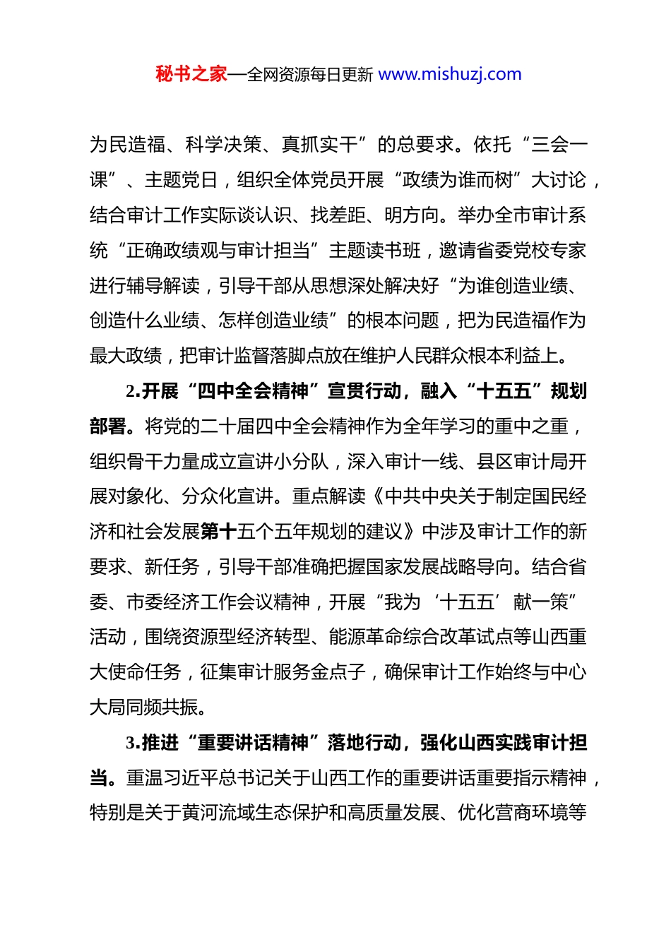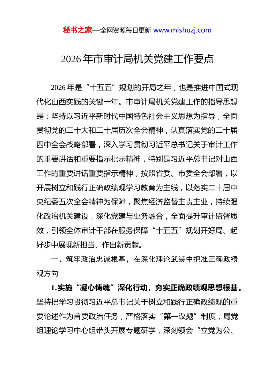 秘书之家—全网资源每日更新 www.mishuzj.com2026 年市审计局机关党建工作要点 2026 年是“十五五”规划的开局之年,也是推进中国式现代化山西实践的关键一年。市审计局机关党建工作的指导思想是:坚持以习近平新时代中国特色社会主义思想为指导,全面贯彻党的二十大和二十届历次全会精神,认真落实党的二十届四中全会战略部署,深入学习贯彻习近平总书记关于审计工作的重要讲话和重要指示批示精神,特别是习近平总书记对山西工作的重要讲话重要指示精神,按照省委、市委全会部署,以开展树立和践行正确政绩观学习教育为主线,以落实二十届中央纪委五次全会精神为保障,聚焦经济监督主责主业,持续强化政治机关建设,深化党建与业务融合,全面提升审计监督质效,引领全体审计干部在服务保障“十五五”规划开好局、起好步中展现新担当、作出新贡献。一、筑牢政治忠诚根基,在深化理论武装中把准正确政绩观方向1.实施“凝心铸魂”深化行动,夯实正确政绩观思想根基。坚持把学习贯彻习近平总书记关于树立和践行正确政绩观的重要论述作为首要政治任务,严格落实“第一议题”制度,局党组理论学习中心组带头开展专题研学,深刻领会“立党为公、秘书之家—全网资源每日更新 www.mishuzj.com为民造福、科学决策、真抓实干”的总要求。依托“三会一课”、主题党日,组织全体党员开展“政绩为谁而树”大讨论,结合审计工作实际谈认识、找差距、明方向。举办全市审计系统“正确政绩观与审计担当”主题读书班,邀请省委党校专家进行辅导解读,引导干部从思想深处解决好“为谁创造业绩、创造什么业绩、怎样创造业绩”的根本问题,把为民造福作为最大政绩,把审计监督落脚点放在维护人民群众根本利益上。2.开展“四中全会精神”宣贯行动,融入“十五五”规划部署。将党的二十届四中全会精神作为全年学习的重中之重,组织骨干力量成立宣讲小分队,深入审计一线、县区审计局开展对象化、分众化宣讲。重点解读《中共中央关于制定国民经济和社会发展第十五个五年规划的建议》中涉及审计工作的新要求、新任务,引导干部准确把握国家发展战略导向。结合省委、市委经济工作会议精神,开展“我为‘十五五’献一策”活动,围绕资源型经济转型、能源革命综合改革试点等山西重大使命任务,征集审计服务金点子,确保审计工作始终与中心大局同频共振。3.推进“重要讲话精神”落地行动,强化山西实践审计担当。重温习近平总书记关于山西工作的重要讲话重要指示精神,特别是关于黄河流域生态保护和高质量发展、优化营商环境等秘书之家—全网资源每日更新 www.mishuzj.com方面的重要指示,建立学习贯彻台账。开展“沿着领袖足迹学思想”现场教学活动,组织党员干部赴考察点实地感悟,激发干事创业热情。将讲话精神转化为具体审计举措,在项目计划制定中优先安排转型发展、文物保护、生态环保等重点领域审计项目,用审计实践检验学习成效,确保党中央及省委重大决策部署在审计环节不折不扣落实。4.抓实“二十届中央纪委五次全会”精神学习行动,筑牢廉洁从审防线。局党组带头学习领会习近平总书记关于党的自我革命的重要思想,深刻把握全会对反腐败斗争的形势判断和战略部署。组织全局干部观看警示教育片,通报审计系统违纪违法典型案例,用身边事教育身边人。开展“纪律教育月”活动,逐条学习新修订的纪律处分条例,围绕审计“四严禁”工作要求和“八不准”工作纪律进行对照检查,引导干部知敬畏、存戒惧、守底线,将全面从严治党要求内化于心、外化于行。二、聚焦学习教育主线,在查改贯通中淬炼求真务实优良作风5.精心组织动员部署,压实政绩观学习教育主体责任。春节假期后第一时间召开全局树立和践行正确政绩观学习教育动员大会,制定印发实施方案,成立由局党组书记任组长的学习教育领导小组。明确党组主体责任、书记第一责任人责任和班秘书之家—全网资源每日更新 www.mishuzj.com子成员“一岗双责”,建立局领导联系点制度,每人包联 1-2个县区审计局和 2-3 个业务科室,全程指导、定期调度。把学习教育开展情况纳入年度党建考核和党支部书记述职评议内容,形成一级抓一级、层层抓落实的责任链...