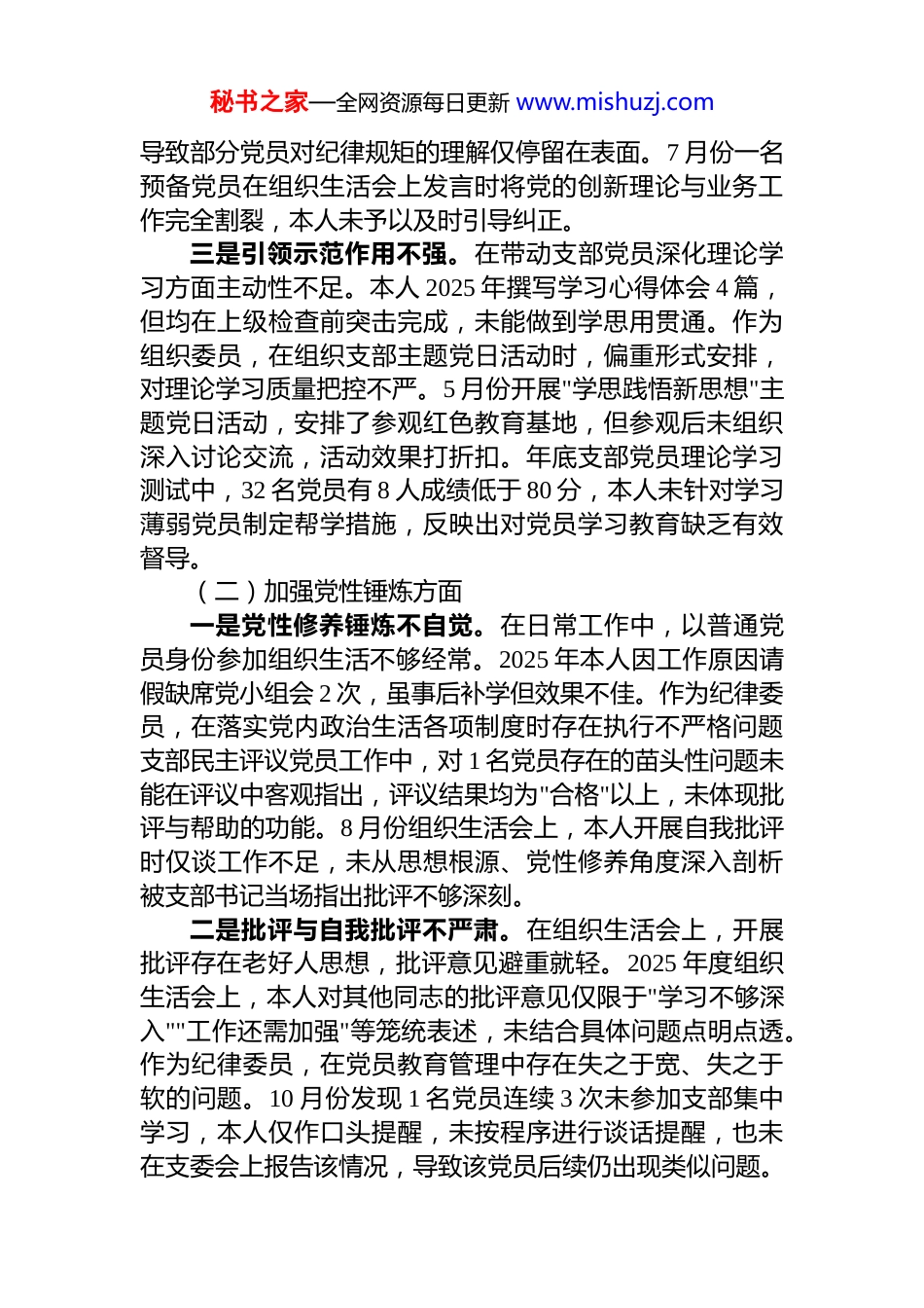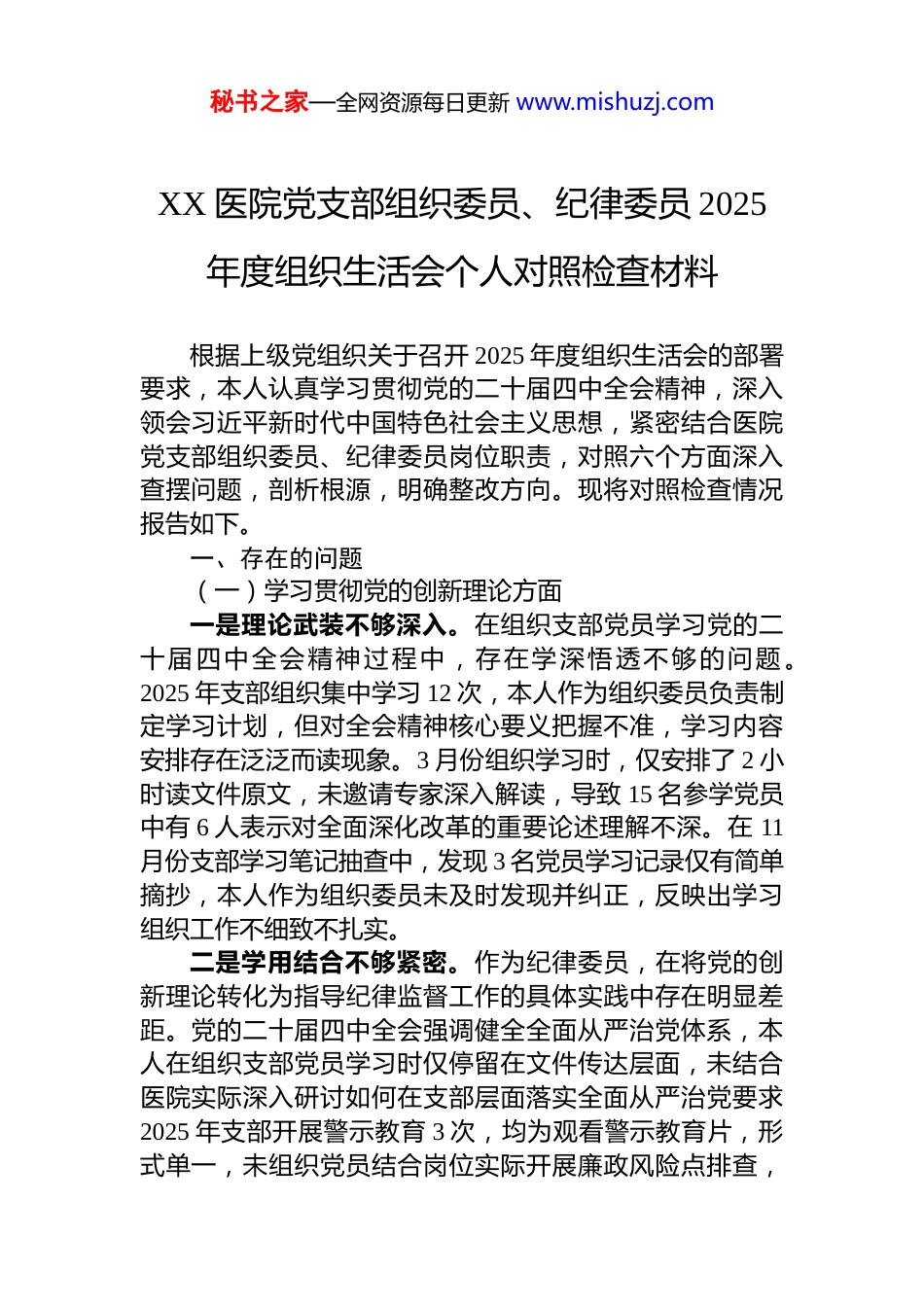 秘书之家—全网资源每日更新 www.mishuzj.comXX 医院党支部组织委员、纪律委员 2025年度组织生活会个人对照检查材料根据上级党组织关于召开 2025 年度组织生活会的部署要求,本人认真学习贯彻党的二十届四中全会精神,深入领会习近平新时代中国特色社会主义思想,紧密结合医院党支部组织委员、纪律委员岗位职责,对照六个方面深入查摆问题,剖析根源,明确整改方向。现将对照检查情况报告如下。一、存在的问题(一)学习贯彻党的创新理论方面一是理论武装不够深入。在组织支部党员学习党的二十届四中全会精神过程中,存在学深悟透不够的问题 。2025 年支部组织集中学习 12 次,本人作为组织委员负责制定学习计划,但对全会精神核心要义把握不准,学习内容安排存在泛泛而读现象。3 月份组织学习时,仅安排了 2 小时读文件原文,未邀请专家深入解读,导致 15 名参学党员中有 6 人表示对全面深化改革的重要论述理解不深。在 11月份支部学习笔记抽查中,发现 3 名党员学习记录仅有简单摘抄,本人作为组织委员未及时发现并纠正,反映出学习组织工作不细致不扎实。二是学用结合不够紧密。作为纪律委员,在将党的创新理论转化为指导纪律监督工作的具体实践中存在明显差距。党的二十届四中全会强调健全全面从严治党体系,本人在组织支部党员学习时仅停留在文件传达层面,未结合医院实际深入研讨如何在支部层面落实全面从严治党要求2025 年支部开展警示教育 3 次,均为观看警示教育片,形式单一,未组织党员结合岗位实际开展廉政风险点排查,秘书之家—全网资源每日更新 www.mishuzj.com导致部分党员对纪律规矩的理解仅停留在表面。7 月份一名预备党员在组织生活会上发言时将党的创新理论与业务工作完全割裂,本人未予以及时引导纠正。三是引领示范作用不强。在带动支部党员深化理论学习方面主动性不足。本人 2025 年撰写学习心得体会 4 篇,但均在上级检查前突击完成,未能做到学思用贯通。作为组织委员,在组织支部主题党日活动时,偏重形式安排,对理论学习质量把控不严。5 月份开展"学思践悟新思想"主题党日活动,安排了参观红色教育基地,但参观后未组织深入讨论交流,活动效果打折扣。年底支部党员理论学习测试中,32 名党员有 8 人成绩低于 80 分,本人未针对学习薄弱党员制定帮学措施,反映出对党员学习教育缺乏有效督导。(二)加强党性锤炼方面一是党性修养锤炼不自觉。在日常工作中,以普通党员身份参加组织生活不够经常。2025 年本人因工作原因请假缺席党小组会 2 次,虽事后补学但效果不佳。作为纪律委员,在落实党内政治生活各项制度时存在执行不严格问题支部民主评议党员工作中,对 1 名党员存在的苗头性问题未能在评议中客观指出,评议结果均为"合格"以上,未体现批评与帮助的功能。8 月份组织生活会上,本人开展自我批评时仅谈工作不足,未从思想根源、党性修养角度深入剖析被支部书记当场指出批评不够深刻。二是批评与自我批评不严肃。在组织生活会上,开展批评存在老好人思想,批评意见避重就轻。2025 年度组织生活会上,本人对其他同志的批评意见仅限于"学习不够深入""工作还需加强"等笼统表述,未结合具体问题点明点透。作为纪律委员,在党员教育管理中存在失之于宽、失之于软的问题。10 月份发现 1 名党员连续 3 次未参加支部集中学习,本人仅作口头提醒,未按程序进行谈话提醒,也未在支委会上报告该情况,导致该党员后续仍出现类似问题。秘书之家—全网资源每日更新 www.mishuzj.com三是党员教育管理不严格。在发展党员工作中存在把关不严问题。2025 年支部确定入党积极分子 2 人,本人作为组织委员负责培养联系人安排工作,但未严格审核培养联系人的履职能力,导致 1 名入党积极分子的培养教育记录存在断档现象。在预备党员转正工作中,对预备党员的教育考察不够细致,9 月份 1 名预备党员转正时,其预备期思想汇报存在应付现象,本人作为组织委员未及时发现并提出整改要求。支部党费收缴工作中,存在党员党费核算不准确的问题,6 月份党费收缴时发现 2 名党员党费基数核定有误,反映出工作责任心不强...