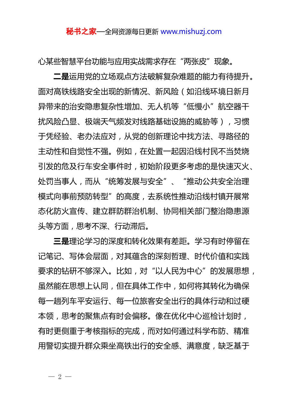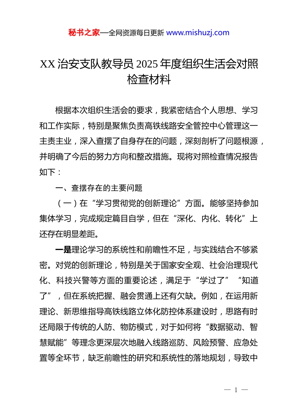 秘书之家—全网资源每日更新 www.mishuzj.comXX 治安支队教导员 2025 年度组织生活会对照检查材料根据本次组织生活会的要求,我紧密结合个人思想、学习和工作实际,特别是聚焦负责高铁线路安全管控中心管理这一主责主业,深入查摆了自身存在的问题,深刻剖析了问题根源,并明确了今后的努力方向和整改措施。现将对照检查情况报告如下:一、查摆存在的主要问题(一)在“学习贯彻党的创新理论”方面。能够坚持参加集体学习,完成规定篇目自学,但在“深化、内化、转化”上还存在明显差距。一是理论学习的系统性和前瞻性不足,与实践结合不够紧密。对党的创新理论,特别是关于国家安全观、社会治理现代化、科技兴警等方面的重要论述,满足于“学过了”“知道了”,但在系统把握、融会贯通上还有欠缺。例如,在运用新理论、新思维指导高铁线路立体化防控体系建设时,思路有时还局限于传统的人防、物防模式,对于如何将“数据驱动、智慧赋能”等理念更深层次地融入线路巡防、风险预警、应急处置等全环节,缺乏前瞻性的研究和系统性的落地规划,导致中— 1 —秘书之家—全网资源每日更新 www.mishuzj.com心某些智慧平台功能与应用实战需求存在“两张皮”现象。二是运用党的立场观点方法破解复杂难题的能力有待提升。面对高铁线路安全出现的新情况、新风险(如沿线环境日新月异带来的治安隐患复杂性增加、无人机等“低慢小”航空器干扰风险凸显、极端天气频发对线路基础设施的威胁等),习惯于凭经验、老办法应对,从党的创新理论中找方法、寻路径的主动性和自觉性不强。例如,在处置一起因沿线村民不当焚烧引发的危及行车安全事件时,初始阶段更多考虑的是快速灭火、处罚当事人,而从“统筹发展与安全”、“推动公共安全治理模式向事前预防转型”的高度,去系统性推动沿线村镇开展常态化防火宣传、建立群防群治机制、协同相关部门整治隐患源头等方面,思考不深、行动滞后。三是理论学习的深度和转化效果有差距。学习有时停留在记笔记、写体会层面,对其蕴含的深刻哲理、时代价值和实践要求的钻研不够深入。比如,对“以人民为中心”的发展思想,虽然能在思想上认同,但在具体工作中,如何将其转化为确保每一趟列车平安运行、每一位旅客安全出行的具体行动和过硬本领,思考的聚焦点有时会偏移。像在优化中心巡检计划时,有时更侧重于考核指标的完成,而对如何通过科学布防、精准用警切实提升群众乘坐高铁出行的安全感、满意度,缺乏基于— 2 —秘书之家—全网资源每日更新 www.mishuzj.com理论指导的深度调研和成效评估机制。(二)在“加强党性锤炼”方面。能够自觉遵守党的政治纪律和政治规矩,但对照更高标准,在党性修养的持续强化上仍有不足。一是政治敏锐性和政治鉴别力需进一步锤炼。对高铁安全工作的极端政治性认识是深刻的,但在日常管理中,对一些苗头性、倾向性问题的政治风险研判不够敏锐。例如,在审核中心内部的一些信息简报、工作报告时,有时更多关注业务数据是否准确、措施是否具体,而对其中可能隐含的表述不严谨、可能引发误读的政治性、政策性风险,把关不够严格、提醒不够及时。对社会上可能影响队伍思想稳定的杂音噪音,在带领队伍进行坚决抵制和有力批驳方面,主动性、战斗性还不够强。二是在严肃党内政治生活、开展批评与自我批评上“辣味”不足。在参加支部组织生活时,自我批评有时“避重就轻”,谈工作问题多、谈思想根源少;批评同志有时“和风细雨”,怕影响团结、怕伤和气,存在“好人主义”思想。例如,在中心党小组会上,针对个别民警存在的“重设备操作、轻分析研判”的倾向,只是泛泛地提出要加强学习,没有一针见血地指出其背后可能存在的责任心、事业心问题,未能真正达到“红脸出汗、排毒治病”的效果。— 3 —秘书之家—全网资源每日更新 www.mishuzj.com三是自我革命精神有所弱化,艰苦奋斗本色有所消退。随着工作条件改善,有时不自觉地放松了对自身的要求。比如,在中心值班备勤中,强调民警要坚守岗位、履职尽责,但对自己“走一遍、问一声”就满足,深入到每一个监控工位、与每一个当班民警细致交流、共同研判具体风险点的时候...