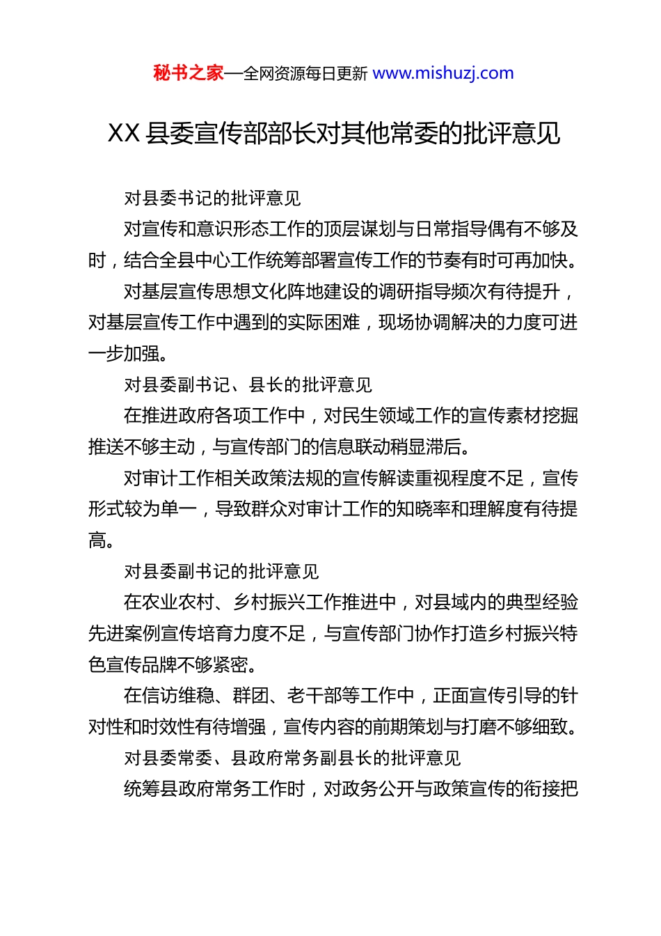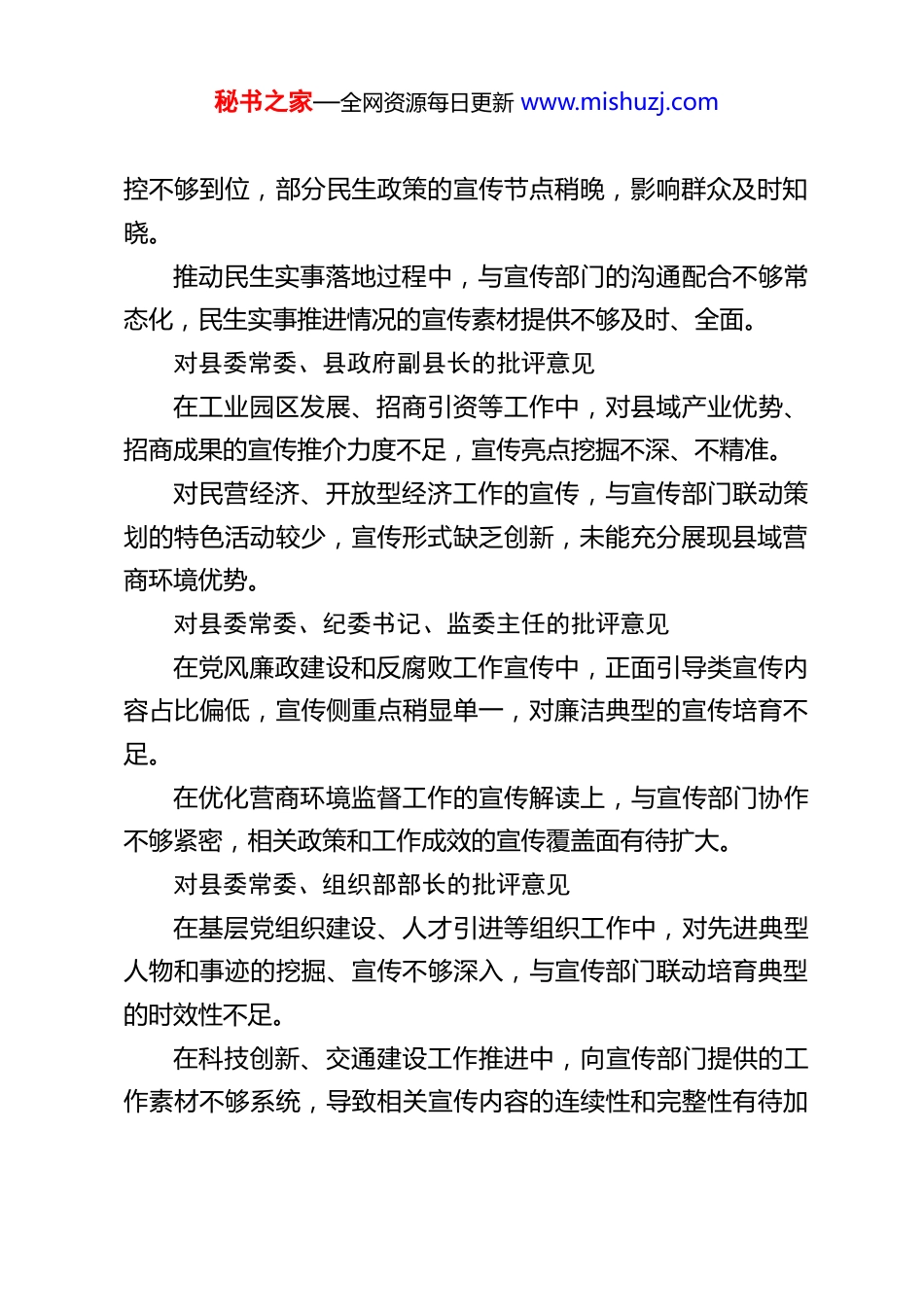 秘书之家—全网资源每日更新 www.mishuzj.comXX 县委宣传部部长对其他常委的批评意见对县委书记的批评意见对宣传和意识形态工作的顶层谋划与日常指导偶有不够及时,结合全县中心工作统筹部署宣传工作的节奏有时可再加快。对基层宣传思想文化阵地建设的调研指导频次有待提升,对基层宣传工作中遇到的实际困难,现场协调解决的力度可进一步加强。对县委副书记、县长的批评意见在推进政府各项工作中,对民生领域工作的宣传素材挖掘推送不够主动,与宣传部门的信息联动稍显滞后。对审计工作相关政策法规的宣传解读重视程度不足,宣传形式较为单一,导致群众对审计工作的知晓率和理解度有待提高。对县委副书记的批评意见在农业农村、乡村振兴工作推进中,对县域内的典型经验先进案例宣传培育力度不足,与宣传部门协作打造乡村振兴特色宣传品牌不够紧密。在信访维稳、群团、老干部等工作中,正面宣传引导的针对性和时效性有待增强,宣传内容的前期策划与打磨不够细致。对县委常委、县政府常务副县长的批评意见统筹县政府常务工作时,对政务公开与政策宣传的衔接把秘书之家—全网资源每日更新 www.mishuzj.com控不够到位,部分民生政策的宣传节点稍晚,影响群众及时知晓。推动民生实事落地过程中,与宣传部门的沟通配合不够常态化,民生实事推进情况的宣传素材提供不够及时、全面。对县委常委、县政府副县长的批评意见在工业园区发展、招商引资等工作中,对县域产业优势、招商成果的宣传推介力度不足,宣传亮点挖掘不深、不精准。对民营经济、开放型经济工作的宣传,与宣传部门联动策划的特色活动较少,宣传形式缺乏创新,未能充分展现县域营商环境优势。对县委常委、纪委书记、监委主任的批评意见在党风廉政建设和反腐败工作宣传中,正面引导类宣传内容占比偏低,宣传侧重点稍显单一,对廉洁典型的宣传培育不足。在优化营商环境监督工作的宣传解读上,与宣传部门协作不够紧密,相关政策和工作成效的宣传覆盖面有待扩大。对县委常委、组织部部长的批评意见在基层党组织建设、人才引进等组织工作中,对先进典型人物和事迹的挖掘、宣传不够深入,与宣传部门联动培育典型的时效性不足。在科技创新、交通建设工作推进中,向宣传部门提供的工作素材不够系统,导致相关宣传内容的连续性和完整性有待加秘书之家—全网资源每日更新 www.mishuzj.com强。对县委常委、政法委书记的批评意见在政法和社会治理工作中,法治宣传、平安建设的宣传策划与宣传部门配合不够紧密,宣传形式缺乏多样性,难以贴合群众需求。在信访维稳正面引导工作中,与宣传部门的信息共享不够及时,针对社会热点的宣传回应针对性和及时性有待提升。对县委常委、人武部政委的批评意见在党管武装和国防教育工作中,与宣传部门联动开展宣传活动的频次偏少,县域国防教育的宣传氛围营造不够浓厚。对双拥共建工作中的先进事迹、典型案例挖掘宣传不足,未能充分借助宣传平台展现全县军民融合的良好风貌。对县委常委、统战部部长、县总工会主席的批评意见在统战、工会工作中,对特色活动和先进典型的宣传策划不够主动,与宣传部门的协作联动不够常态化,宣传效果未达预期。在生态环境建设、乡村振兴协管工作中,对绿色发展、乡村建设的宣传亮点打造不够,向宣传部门推送的素材不够及时、丰富。对县委常委、县委办公室主任的批评意见统筹县委机关工作时,对县委重大决策部署的宣传传达衔接不够细致,导致宣传部门获取相关信息的及时性有待提升。秘书之家—全网资源每日更新 www.mishuzj.com在县委政研室工作中,对县域发展调研成果的宣传转化不足,与宣传部门配合挖掘调研中的宣传亮点、工作思路不够深入。