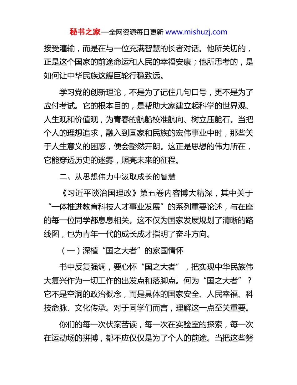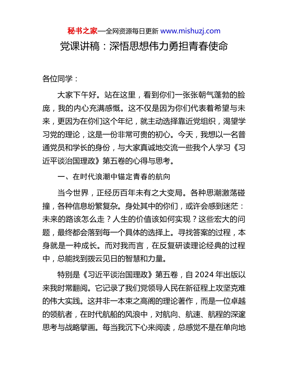 秘书之家—全网资源每日更新 www.mishuzj.com党课讲稿:深悟思想伟力勇担青春使命各位同学:大家下午好。站在这里,看到你们一张张朝气蓬勃的脸庞,我的内心充满感慨。这不仅是因为你们代表着希望与未来,更因为在你们这个年纪,就主动选择靠近党组织,渴望学习党的理论,这是一份非常可贵的初心。今天,我想以一名普通党员和学长的身份,与大家真诚地交流一些我个人学习《习近平谈治国理政》第五卷的心得与思考。一、在时代浪潮中锚定青春的航向当今世界,正经历百年未有之大变局。各种思潮激荡碰撞,各种信息纷繁复杂。身处其中的你们,或许会感到迷茫:未来的路该怎么走?人生的价值该如何实现?这些宏大的问题,最终都会落到每一个具体的选择上。寻找答案的过程,本身就是一种成长。而对我而言,在反复研读理论经典的过程中,总能找到拨云见日的智慧和力量。特别是《习近平谈治国理政》第五卷,自 2024 年出版以来我时常翻阅。它记录了我们党领导人民在新征程上攻坚克难的伟大实践。这并非一本束之高阁的理论著作,而是一位卓越的领航者,在时代航船的风浪中,对航向、航速、航程的深邃思考与战略擘画。每当我沉下心来阅读,总感觉不是在单向地秘书之家—全网资源每日更新 www.mishuzj.com接受灌输,而是在与一位充满智慧的长者对话。他所关切的,正是这个国家的前途命运和人民的幸福安康;他所思考的,是如何让中华民族这艘巨轮行稳致远。学习党的创新理论,不是为了记住几句口号,更不是为了应付考试。它的根本目的,是帮助大家建立起科学的世界观、人生观和价值观,为青春的航船校准航向、树立压舱石。当把个人的理想追求,融入到国家和民族的宏伟事业中时,那些关于人生意义的困惑,便会豁然开朗。这正是思想的伟力所在,它能穿透历史的迷雾,照亮未来的征程。二、从思想伟力中汲取成长的智慧《习近平谈治国理政》第五卷内容博大精深,其中关于“一体推进教育科技人才事业发展”的系列重要论述,与在座的每一位同学都息息相关。这不仅为国家发展规划了清晰的路线图,也为青年一代的成长成才指明了奋斗方向。(一)深植“国之大者”的家国情怀书中反复强调,要心怀“国之大者”,把实现中华民族伟大复兴作为一切工作的出发点和落脚点。何为“国之大者”?它不是空洞的政治概念,而是具体的国家安全、人民幸福、科技命脉、文化传承。对于同学们而言,理解这一点至关重要。你们的每一次伏案苦读,每一次在实验室的探索,每一次在运动场的拼搏,都不应仅仅是为了个人的前途。当把这些努秘书之家—全网资源每日更新 www.mishuzj.com力与国家的需要联系起来时,学习的动力会变得截然不同。思考一下,为何国家要下大力气发展基础教育?为何要不断强调科技创新的重要性?因为一个强大的国家,必须拥有强大的国民素质和核心技术。你们今天的学业,正是未来支撑国家大厦的基石。这种将个人奋斗与国家命运紧密相连的家国情怀,是成长道路上最深沉、最持久的力量源泉。(二)把握“三位一体”的战略布局书中明确提出了将教育、科技、人才作为一个有机整体统筹推进的战略思想。这是一个极具远见的战略布局。教育是基础,科技是关键,人才是核心。三者环环相扣,缺一不可。教育的基础性、先导性作用,决定了国家未来的高度。强国必先强教,以教育之强夯实国家富强之基,是书中反复强调的理念。你们正处在接受基础教育的关键阶段,这里不仅传授知识,更重要的是塑造品格、培养思维、激发潜能,也就是“立德树人”。一个高质量的教育体系,才能源源不断地培养出支撑国家发展的各类人才。科技是第一生产力,是国家强盛的战略支撑。当今世界的竞争,很大程度上就是科技实力的竞争。而科技的竞争,归根结底是人才的竞争。书里对“激发各类人才创新活力和潜力”提出了明确要求,强调要培养和造就一大批具有国际水平的战略人才力量。这意味着,国家需要的不是只会考试的“做题秘书之家—全网资源每日更新 www.mishuzj.com家”,而是具备创新精神和实践能力的实干家。理解了“三位一体”的逻辑,你们就能更清晰地认识到自己所处的历史方位。你们既是教育事业的受益者,也是未来科技创新的主...