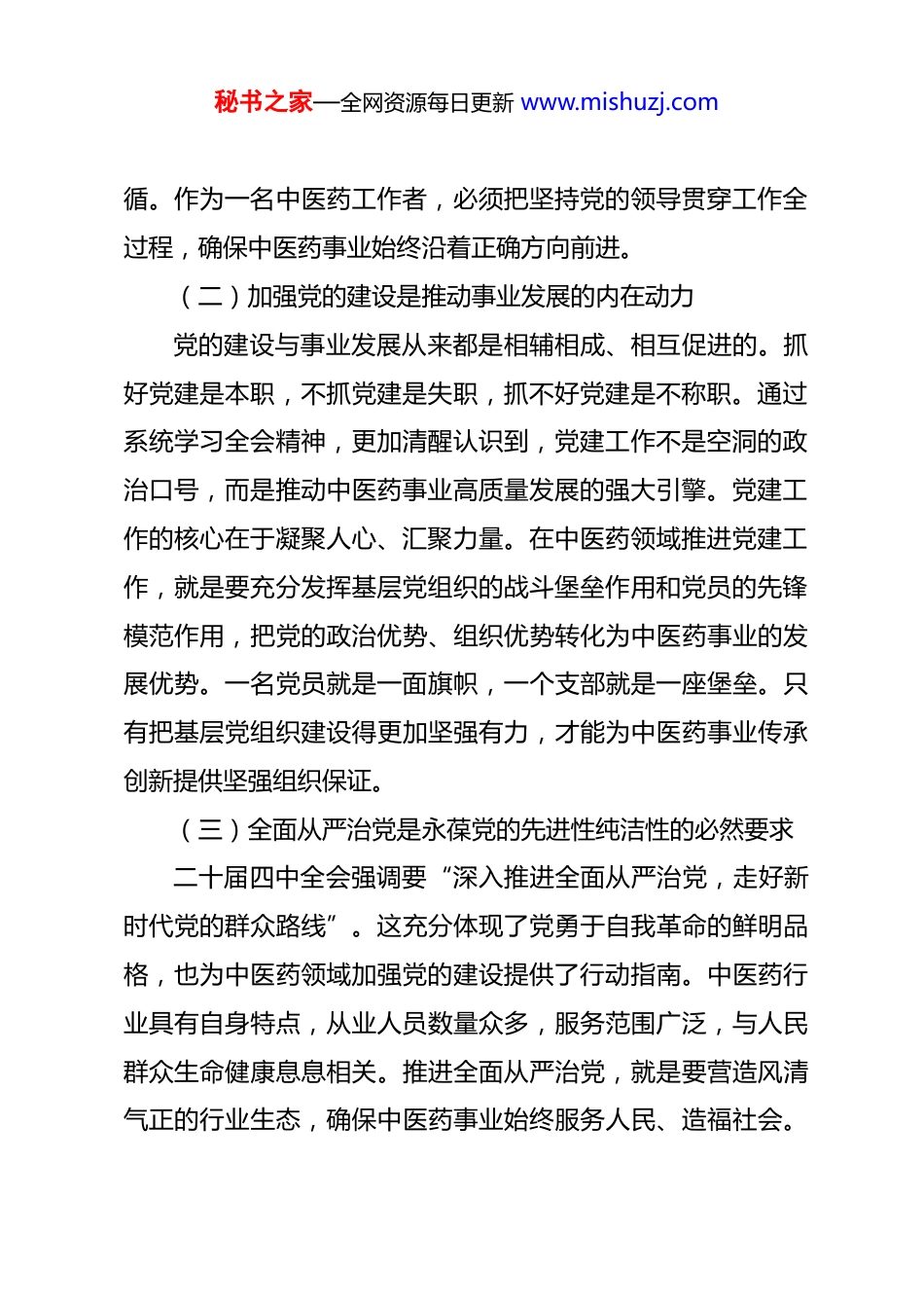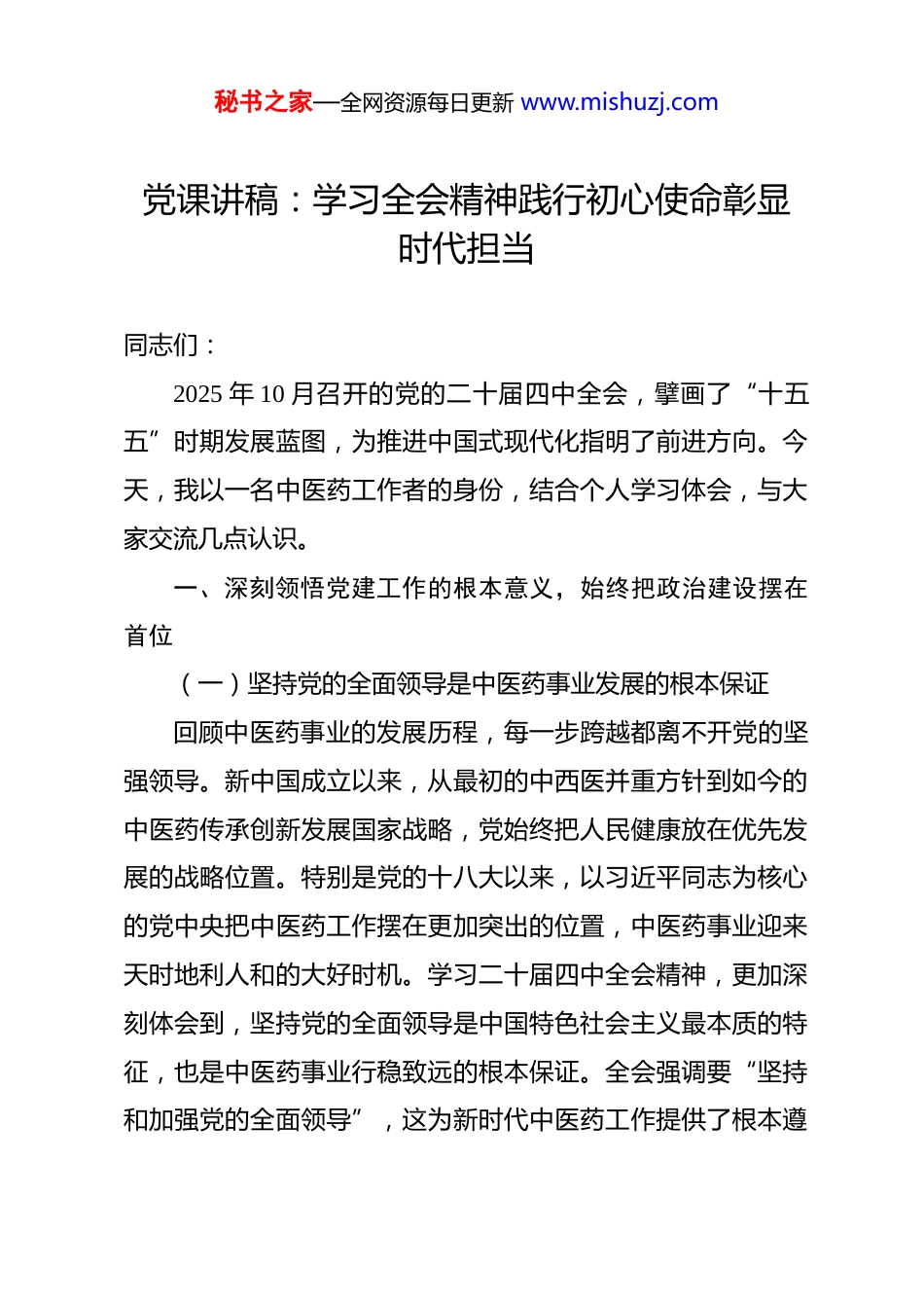 秘书之家—全网资源每日更新 www.mishuzj.com党课讲稿:学习全会精神践行初心使命彰显时代担当 同志们:2025 年 10 月召开的党的二十届四中全会,擘画了“十五五”时期发展蓝图,为推进中国式现代化指明了前进方向。今天,我以一名中医药工作者的身份,结合个人学习体会,与大家交流几点认识。一、深刻领悟党建工作的根本意义,始终把政治建设摆在首位(一)坚持党的全面领导是中医药事业发展的根本保证回顾中医药事业的发展历程,每一步跨越都离不开党的坚强领导。新中国成立以来,从最初的中西医并重方针到如今的中医药传承创新发展国家战略,党始终把人民健康放在优先发展的战略位置。特别是党的十八大以来,以习近平同志为核心的党中央把中医药工作摆在更加突出的位置,中医药事业迎来天时地利人和的大好时机。学习二十届四中全会精神,更加深刻体会到,坚持党的全面领导是中国特色社会主义最本质的特征,也是中医药事业行稳致远的根本保证。全会强调要“坚持和加强党的全面领导”,这为新时代中医药工作提供了根本遵秘书之家—全网资源每日更新 www.mishuzj.com循。作为一名中医药工作者,必须把坚持党的领导贯穿工作全过程,确保中医药事业始终沿着正确方向前进。(二)加强党的建设是推动事业发展的内在动力党的建设与事业发展从来都是相辅相成、相互促进的。抓好党建是本职,不抓党建是失职,抓不好党建是不称职。通过系统学习全会精神,更加清醒认识到,党建工作不是空洞的政治口号,而是推动中医药事业高质量发展的强大引擎。党建工作的核心在于凝聚人心、汇聚力量。在中医药领域推进党建工作,就是要充分发挥基层党组织的战斗堡垒作用和党员的先锋模范作用,把党的政治优势、组织优势转化为中医药事业的发展优势。一名党员就是一面旗帜,一个支部就是一座堡垒。只有把基层党组织建设得更加坚强有力,才能为中医药事业传承创新提供坚强组织保证。(三)全面从严治党是永葆党的先进性纯洁性的必然要求二十届四中全会强调要“深入推进全面从严治党,走好新时代党的群众路线”。这充分体现了党勇于自我革命的鲜明品格,也为中医药领域加强党的建设提供了行动指南。中医药行业具有自身特点,从业人员数量众多,服务范围广泛,与人民群众生命健康息息相关。推进全面从严治党,就是要营造风清气正的行业生态,确保中医药事业始终服务人民、造福社会。秘书之家—全网资源每日更新 www.mishuzj.com作为中医药工作者,要自觉把纪律规矩挺在前面,守住底线、不越红线,以实际行动践行共产党员的初心使命。二、系统把握二十届四中全会精神实质,深刻理解中国式现代化的丰富内涵(一)中国式现代化是全体人民共同富裕的现代化全会指出,共同富裕是中国式现代化的重要特征和本质要求。“十五五”时期,要把扎实推进共同富裕作为经济社会发展的重要目标,在高质量发展中促进共同富裕。共同富裕不是少数人的富裕,而是全体人民的富裕。在中医药领域推进共同富裕,就是要让优质中医药服务更加普惠可及,让人民群众在家门口就能享受到高质量的中医药服务。近年来,国家大力推进基层中医药服务能力建设,推动中医药进社区、进乡村、进家庭,正是共同富裕理念在卫生健康领域的生动实践。(二)中国式现代化是物质文明和精神文明相协调的现代化物质富足、精神富有是社会主义现代化的根本要求。全会强调要扎实推进文化强国建设,发展具有强大思想引领力、精神凝聚力、价值感召力、国际影响力的新时代中国特色社会主义文化。中医药文化是中华优秀传统文化的重要组成部分,承载着中华民族几千年的健康养生理念和实践经验。在推进中国秘书之家—全网资源每日更新 www.mishuzj.com式现代化进程中,既要传承好中医药这一宝贵财富,又要推动中医药文化创造性转化、创新性发展,让古老智慧焕发新的时代光芒。物质文明与精神文明协调发展,在中医药事业中体现为既要提升服务能力和产业水平,又要弘扬中医药文化精髓,实现“形神兼备”的全面发展。(三)以经济建设为中心是推进中国式现代化的坚实支撑发展是解决一切问题的基础和关键。全会指出,高质量发展是全面建设社会主义现代化国家的首要...